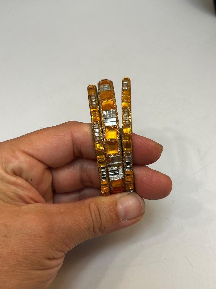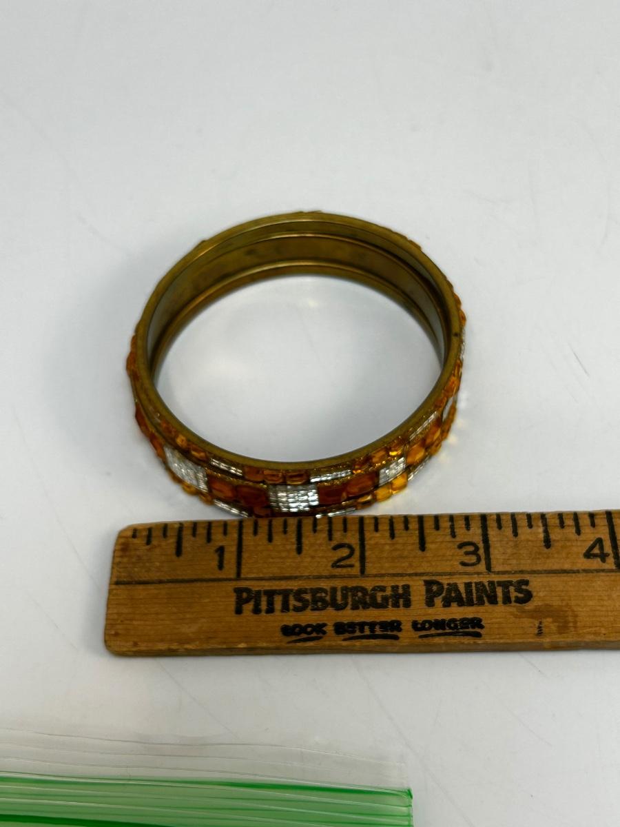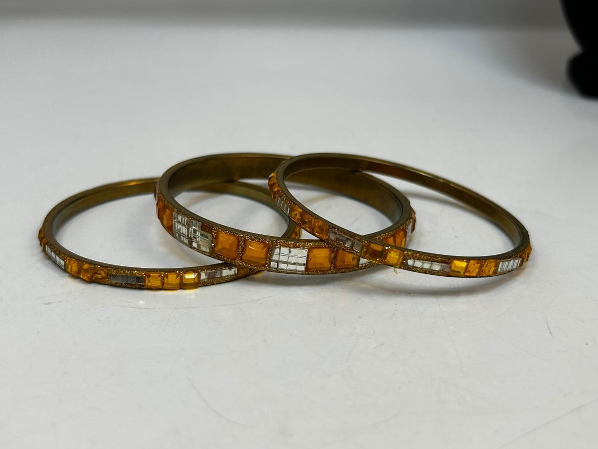Set of Three Stackable Orange and Clear Crystal Rhinestone Fashion Bangle Bracelets. In good condition.