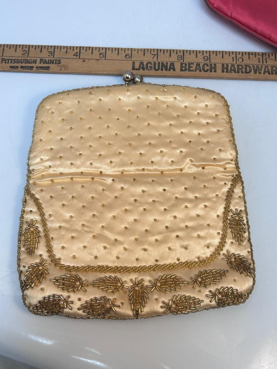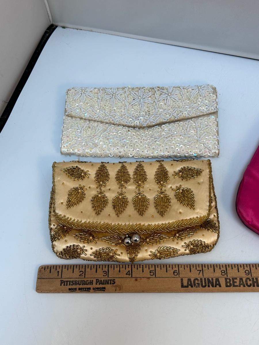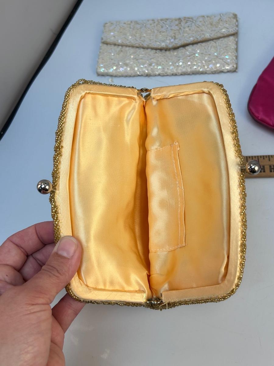 Lot of Three Vintage Clutch Style Purse Handbags Beaded Sequined Hot Pink. In various states of condition. Some discolor maybe noticed from use. The champagne gold colored clutch is in the better condition of the three.