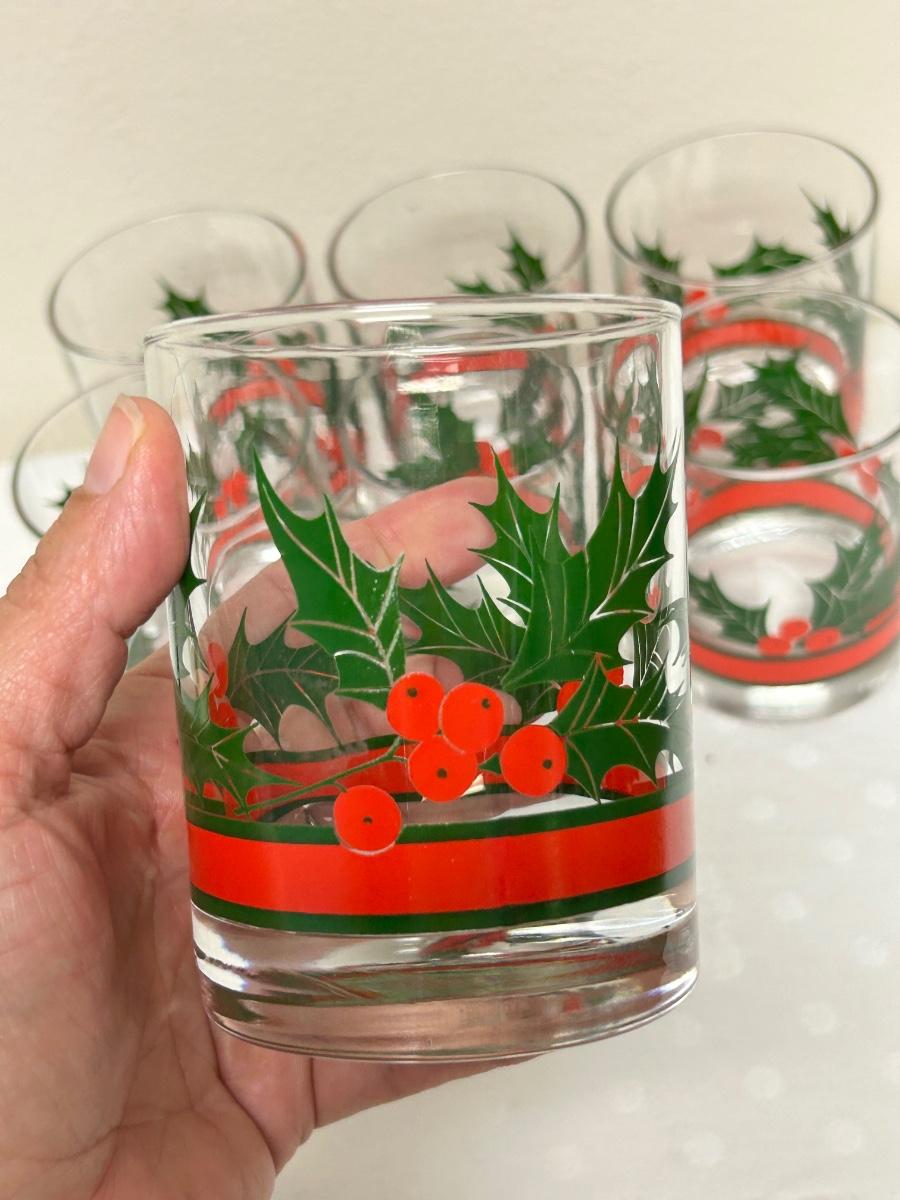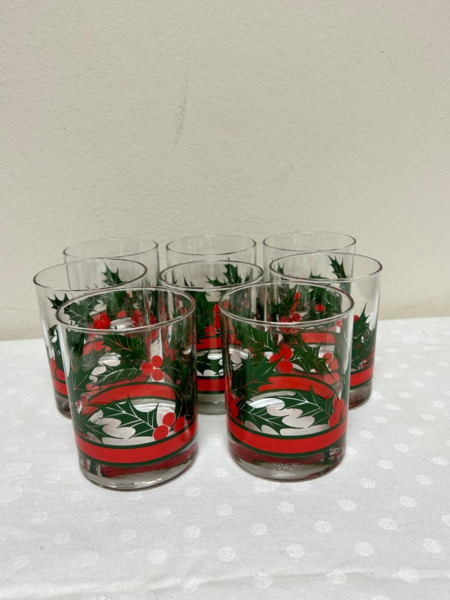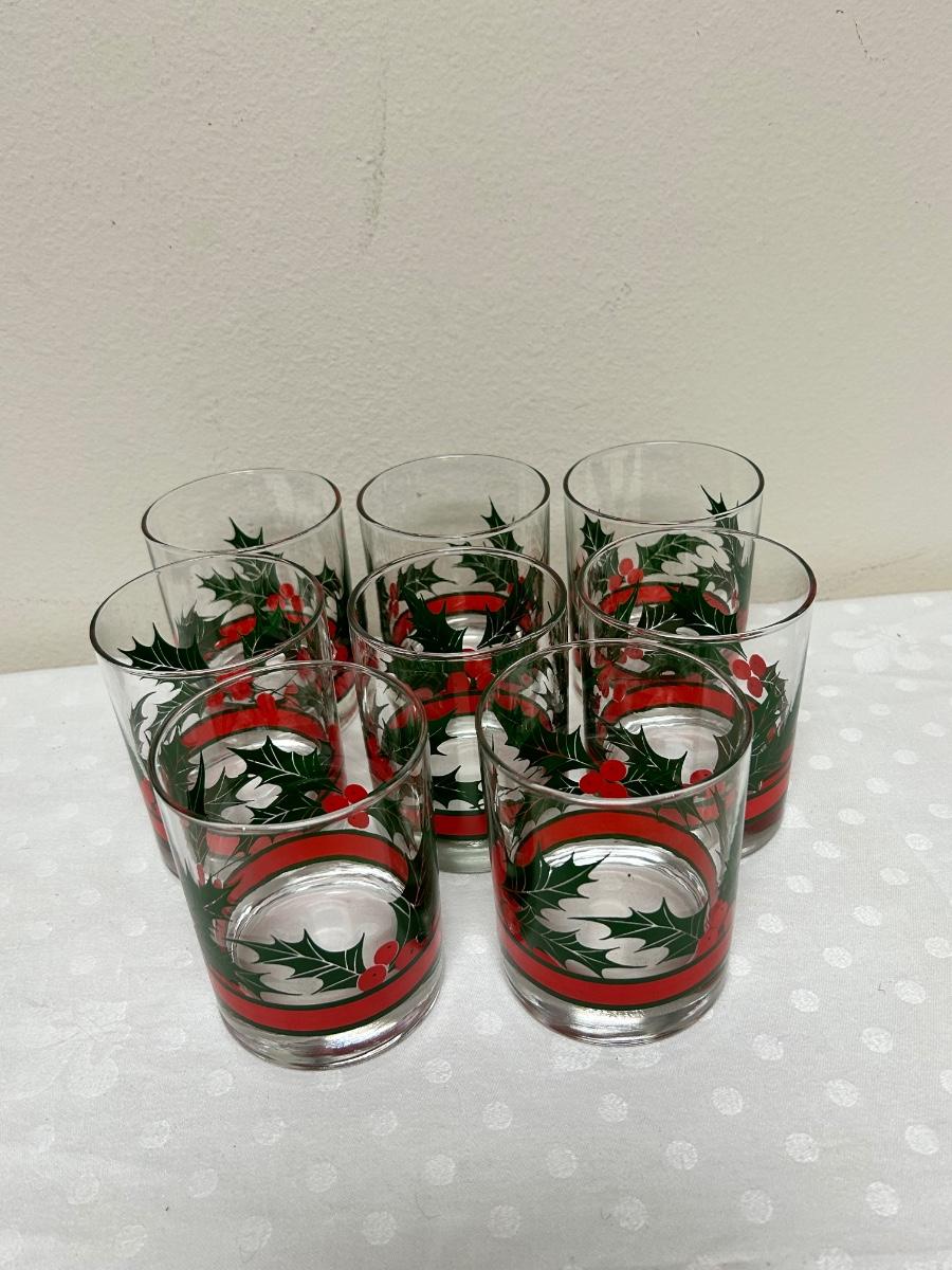 Set of 8 Heavy Bottom Christmas Holly Rocks Drink Low Ball Glasses. In very good condition, no fade to designs.