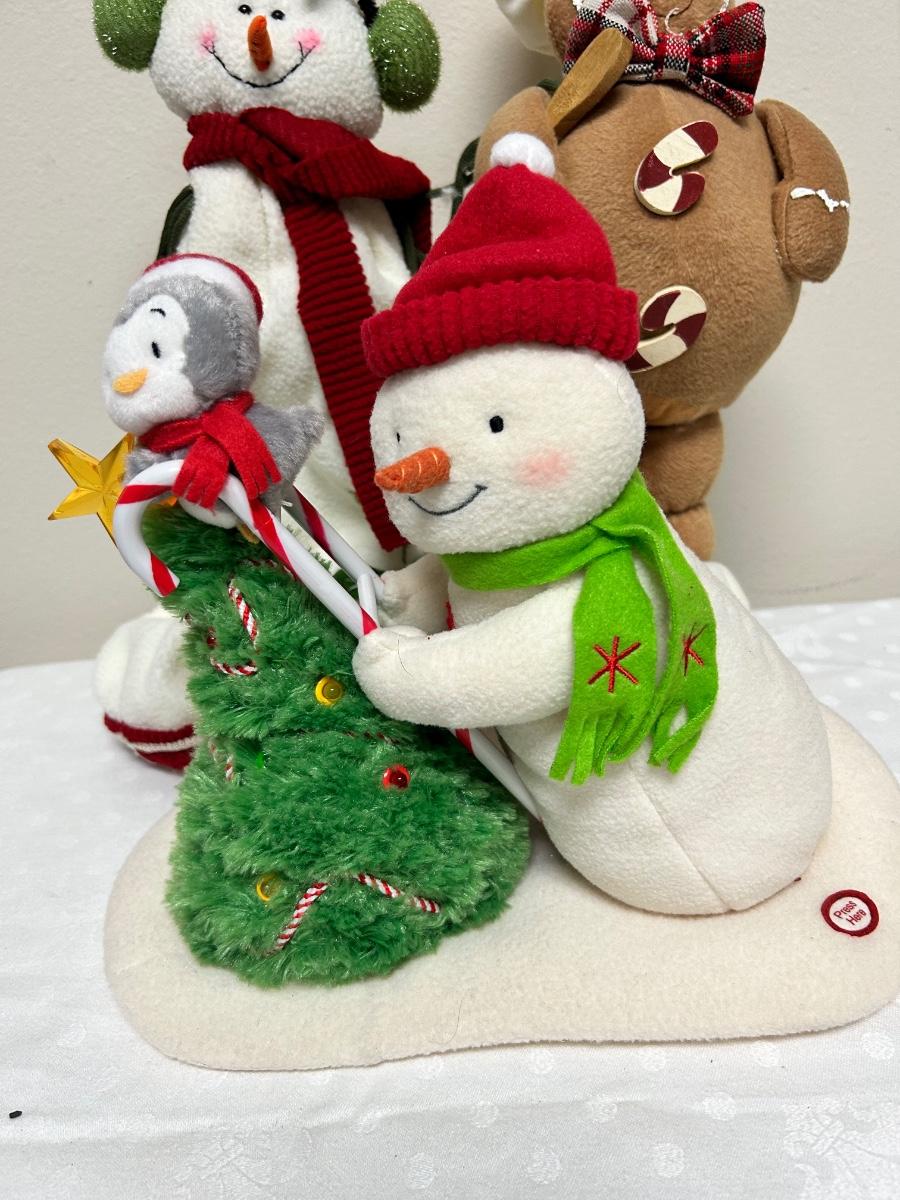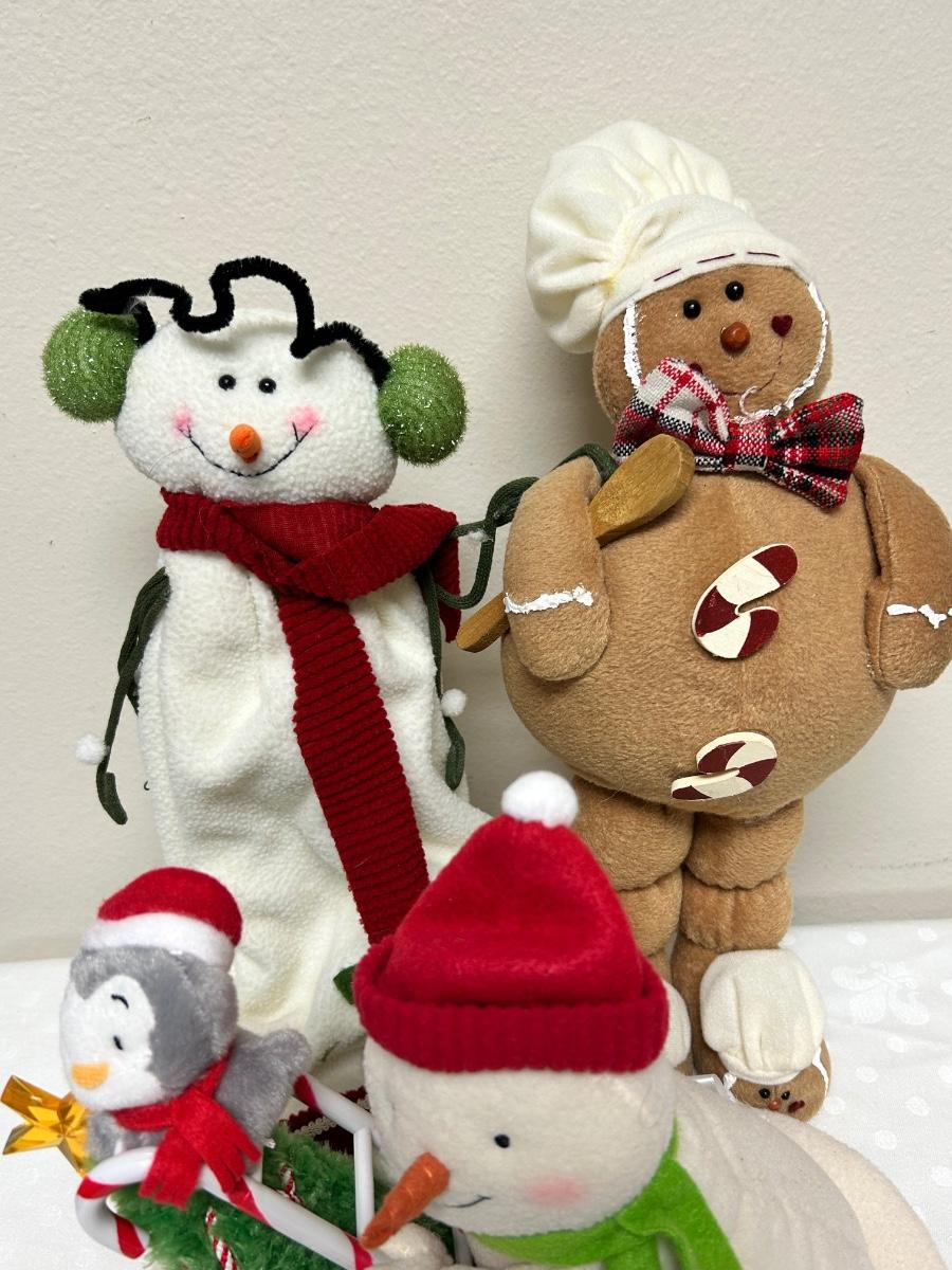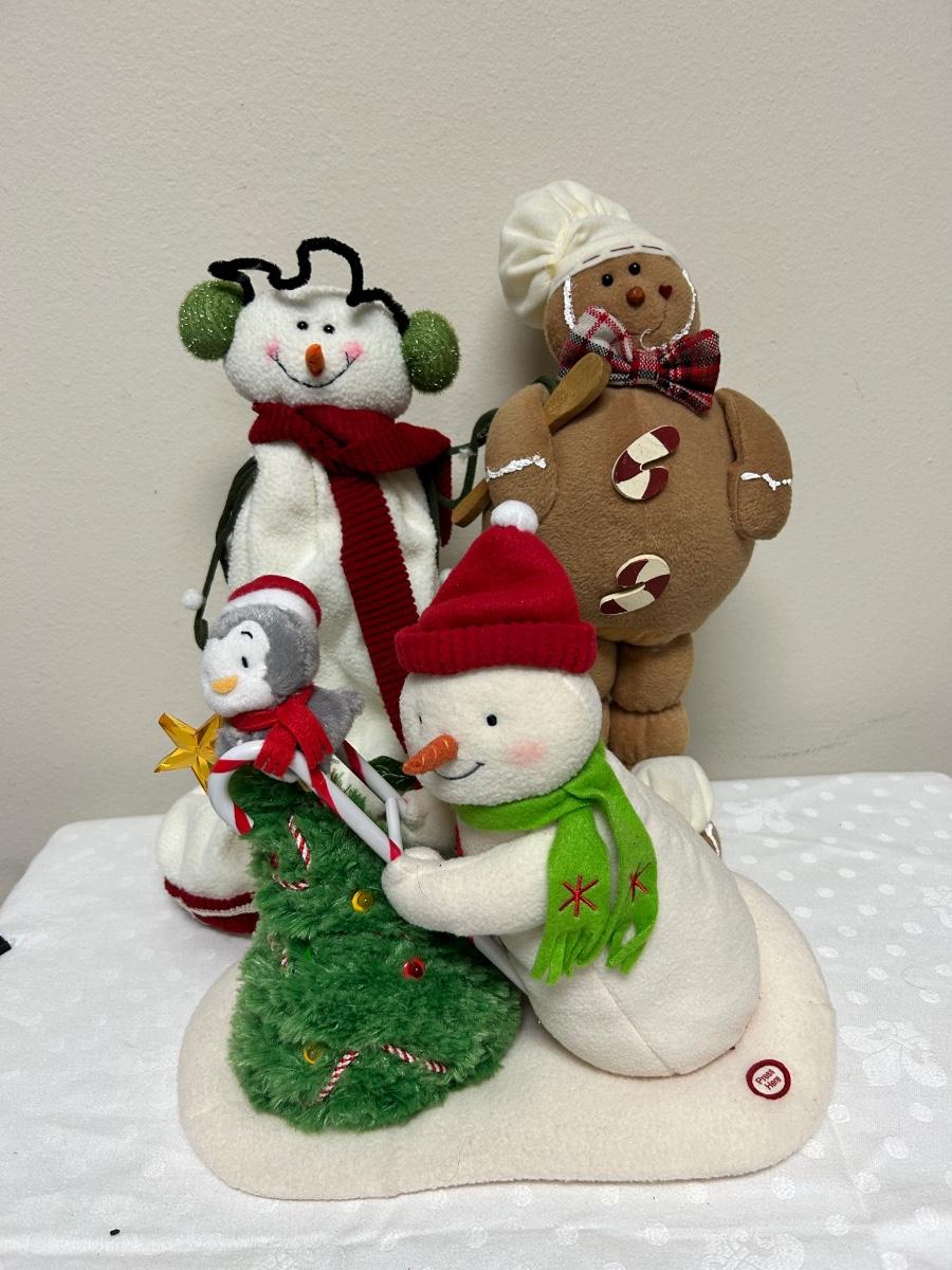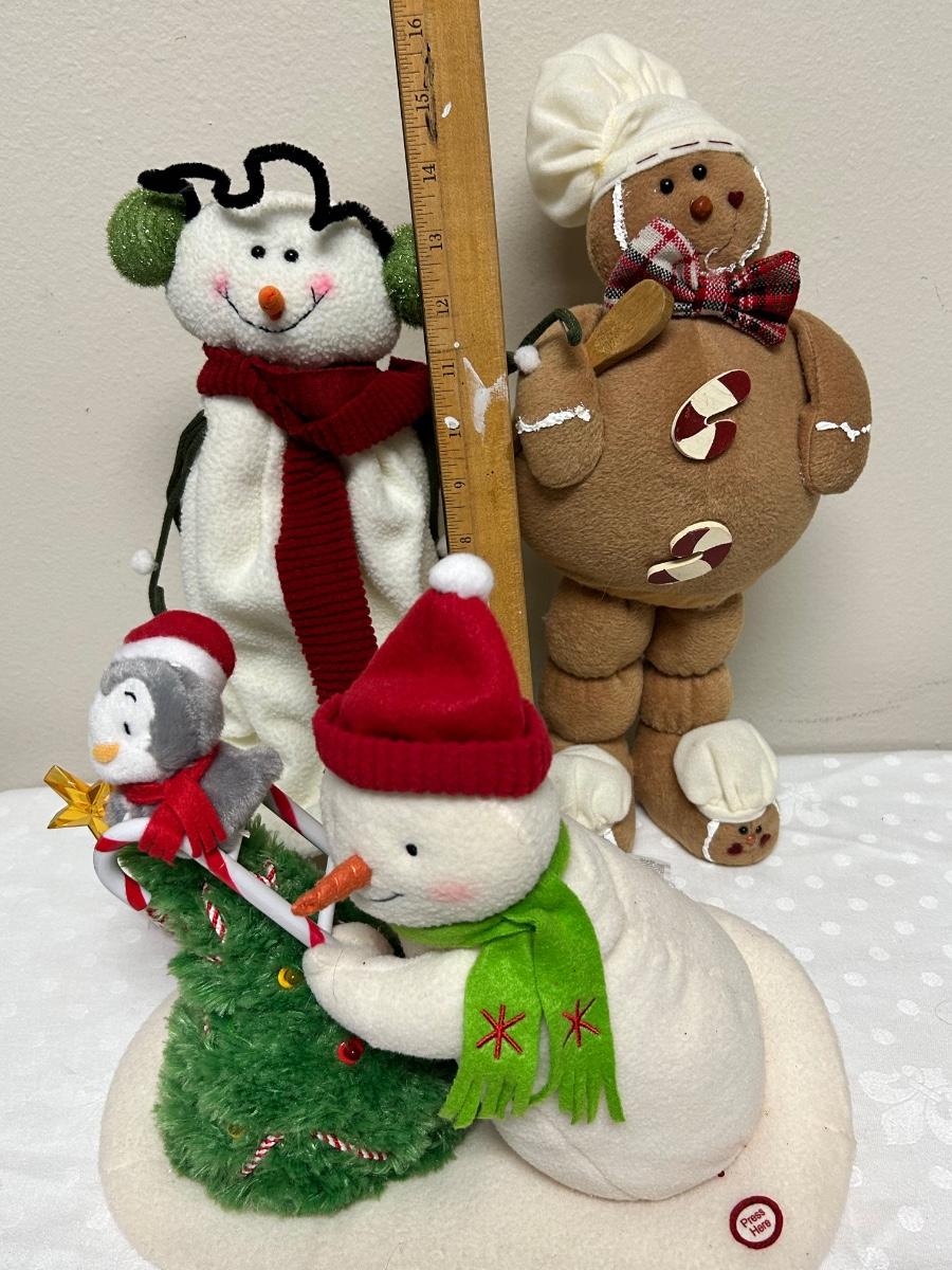 Lot of Three Cute Happy Snowmen Plush and Gingerbread Man Christmas Holiday Decor. In good condition. The one with penguin should play music but is not currently working.