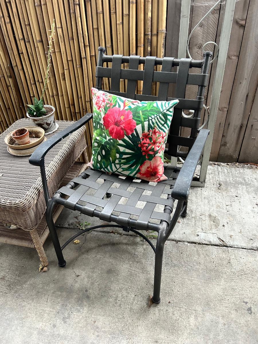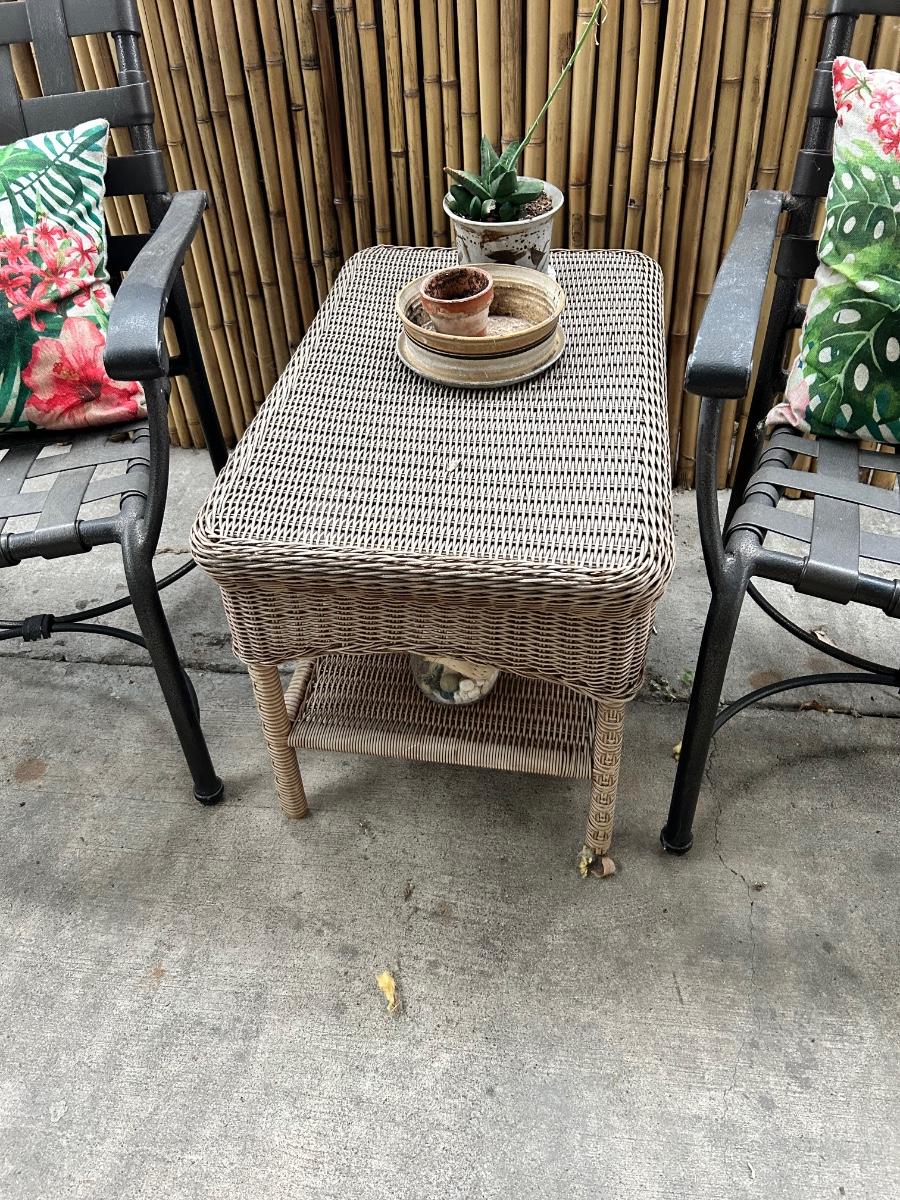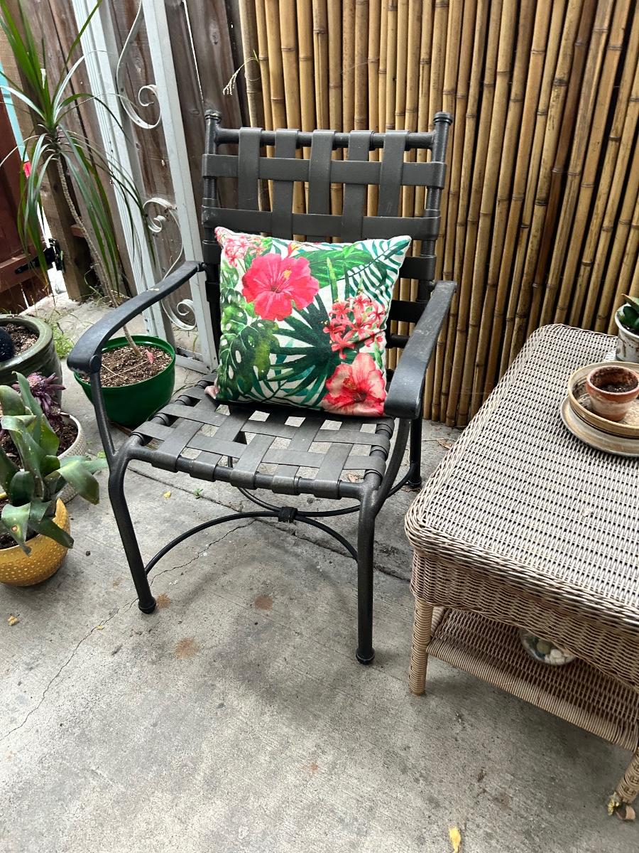 Pair of Metal Patio Chairs with Woven Outdoor Faux Wicker Rattan Table & Colorful Pillows. In good used condition. Metal armchairs with heavy vinyl strap woven seats. Table is outdoor faux rattan. **WEEKEND OR AFTERNOON PICK UP IN GARDEN GROVE, ARRANGE WITH JENN2**