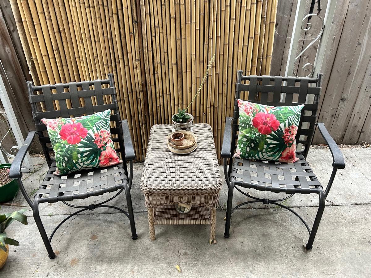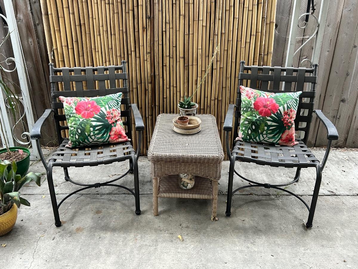 Pair of Metal Patio Chairs with Woven Outdoor Faux Wicker Rattan Table & Colorful Pillows *OFF SITE PICK UP*