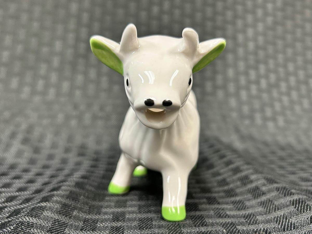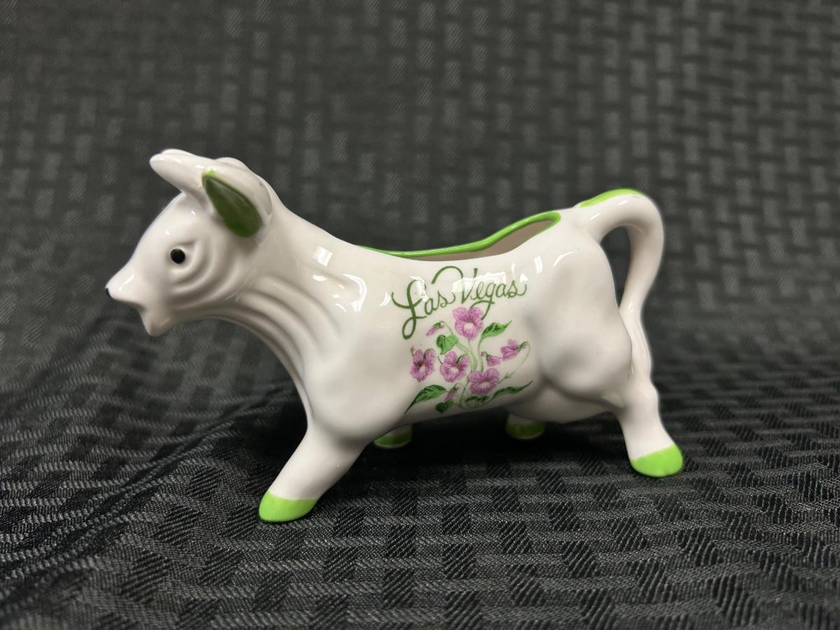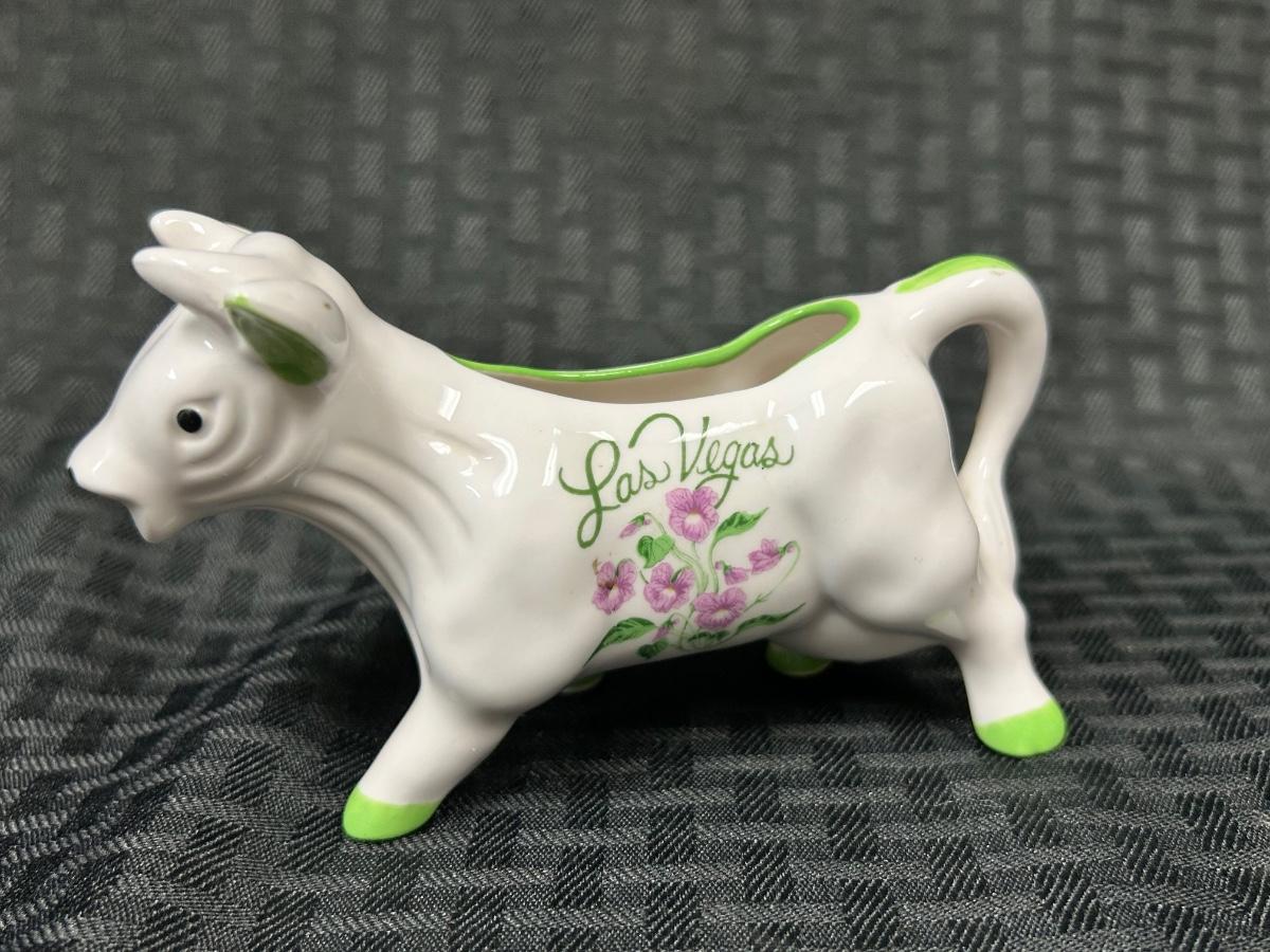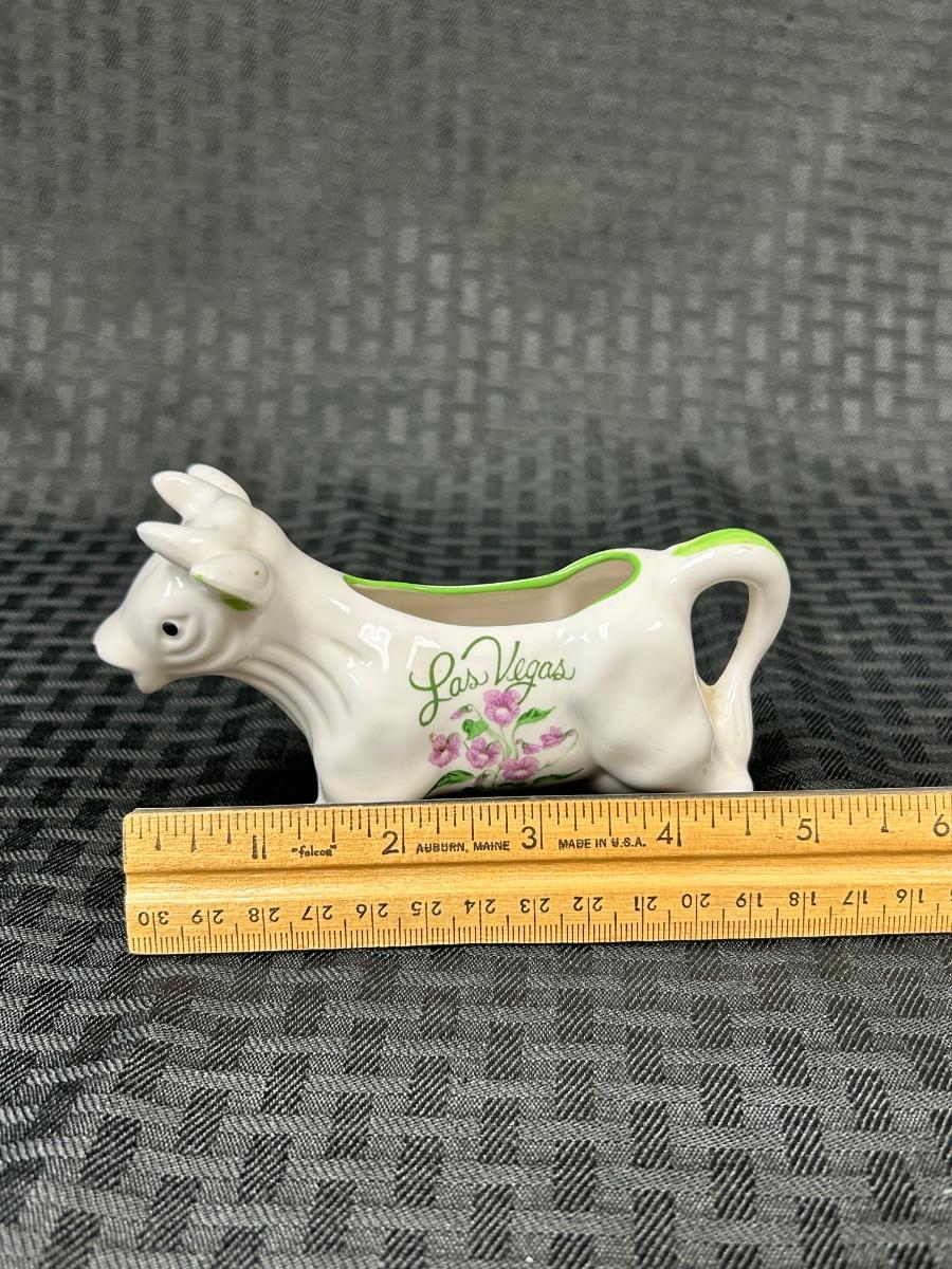 Vintage Las Vegas Nevada Vacation Souvenir Cow Cream Pitcher Gravy Sause Boat Figurine. In good condition. White with purple flowers and Las Vegas in green. About 5" size.
