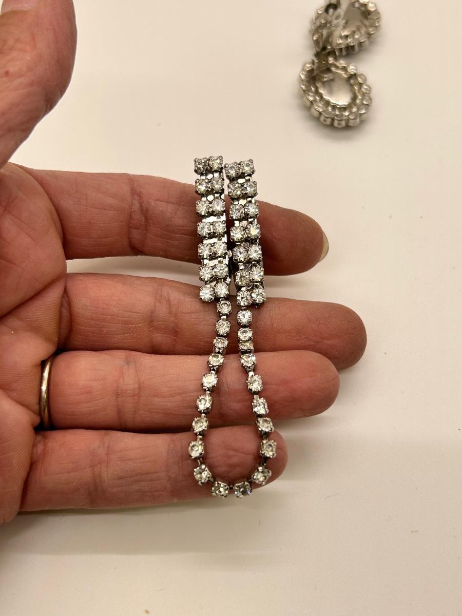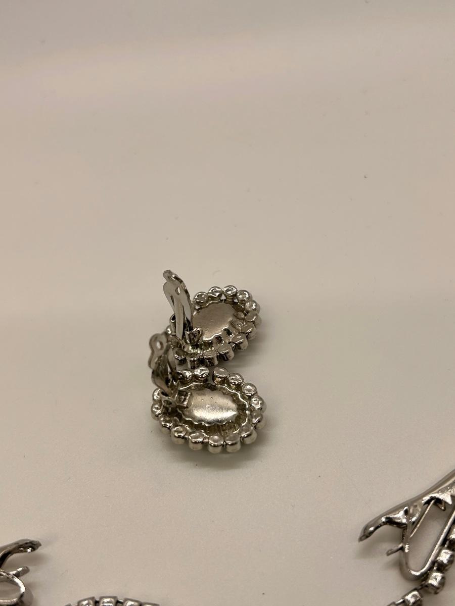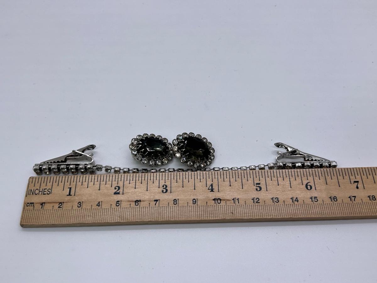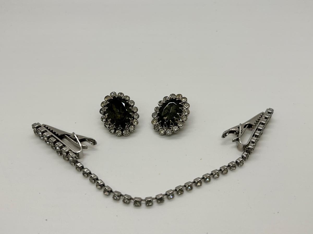 Pair of Clip Style Smoke and Ice Rhinestone Earrings and a Sweater Clip