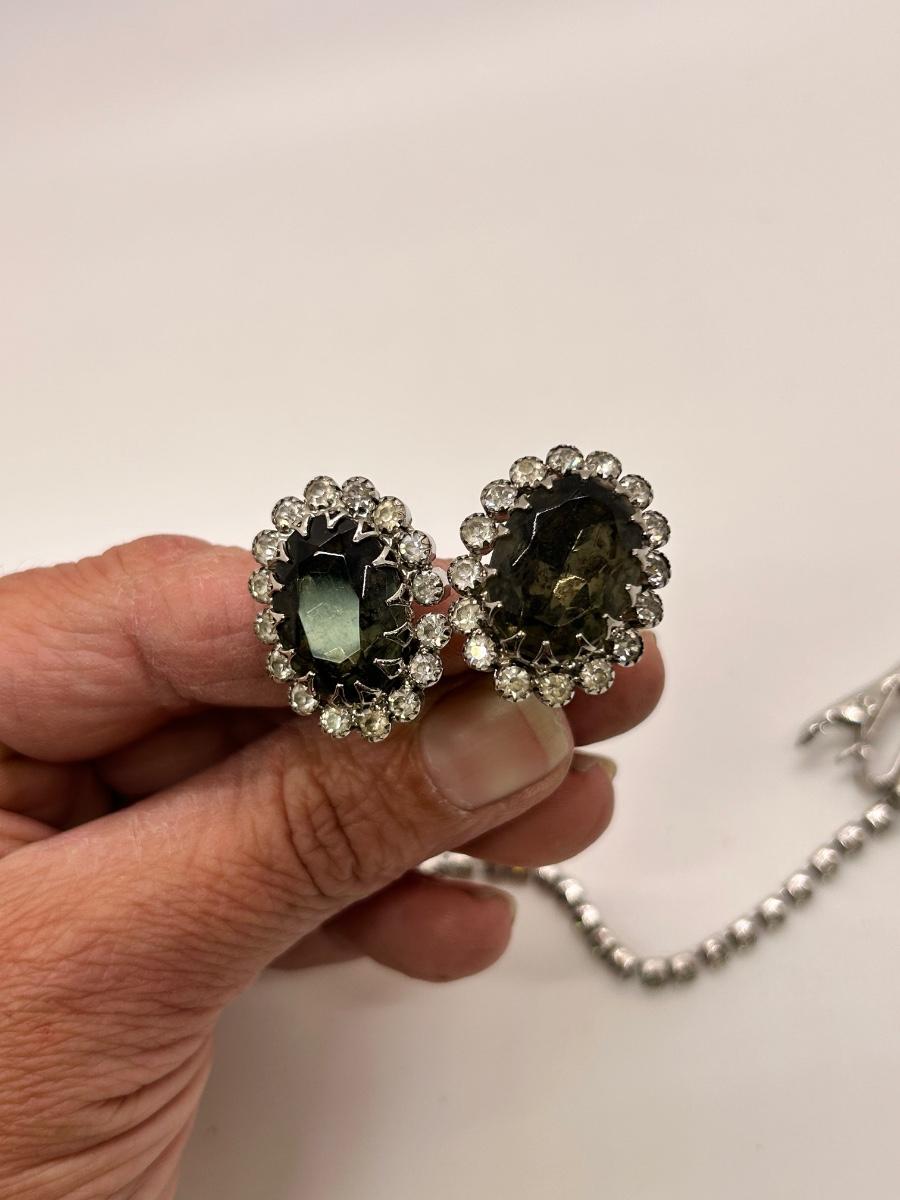 Pair of Clip Style Smoke and Ice Rhinestone Earrings and a Sweater Clip. In good condition.
