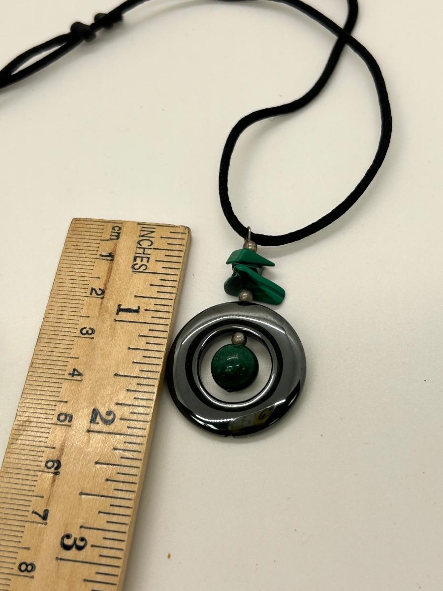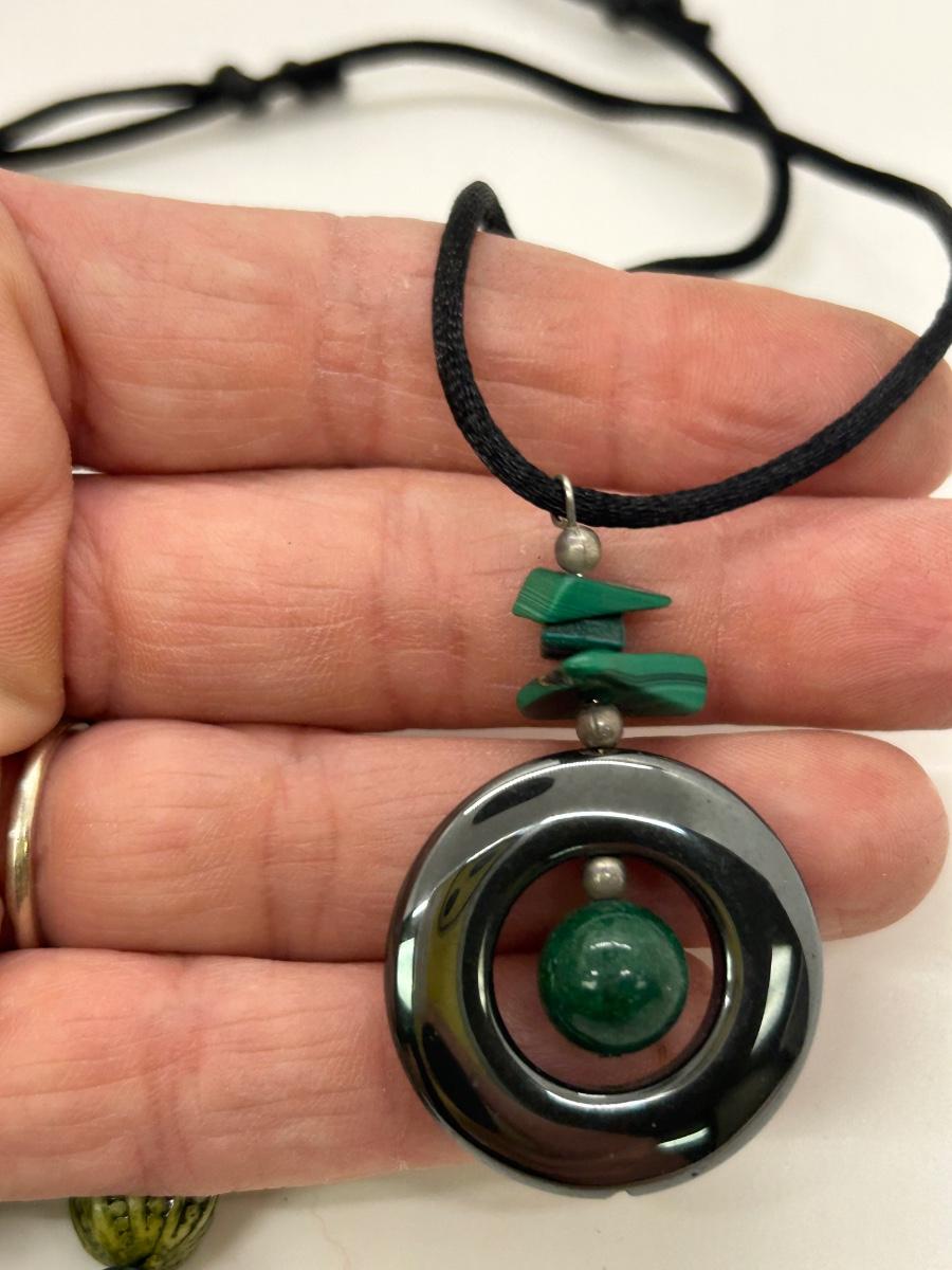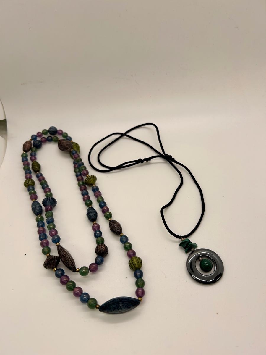 Pair of Stone Necklaces Corded Malachite Glass Beads. In good condition. Corded necklace is adjustable.