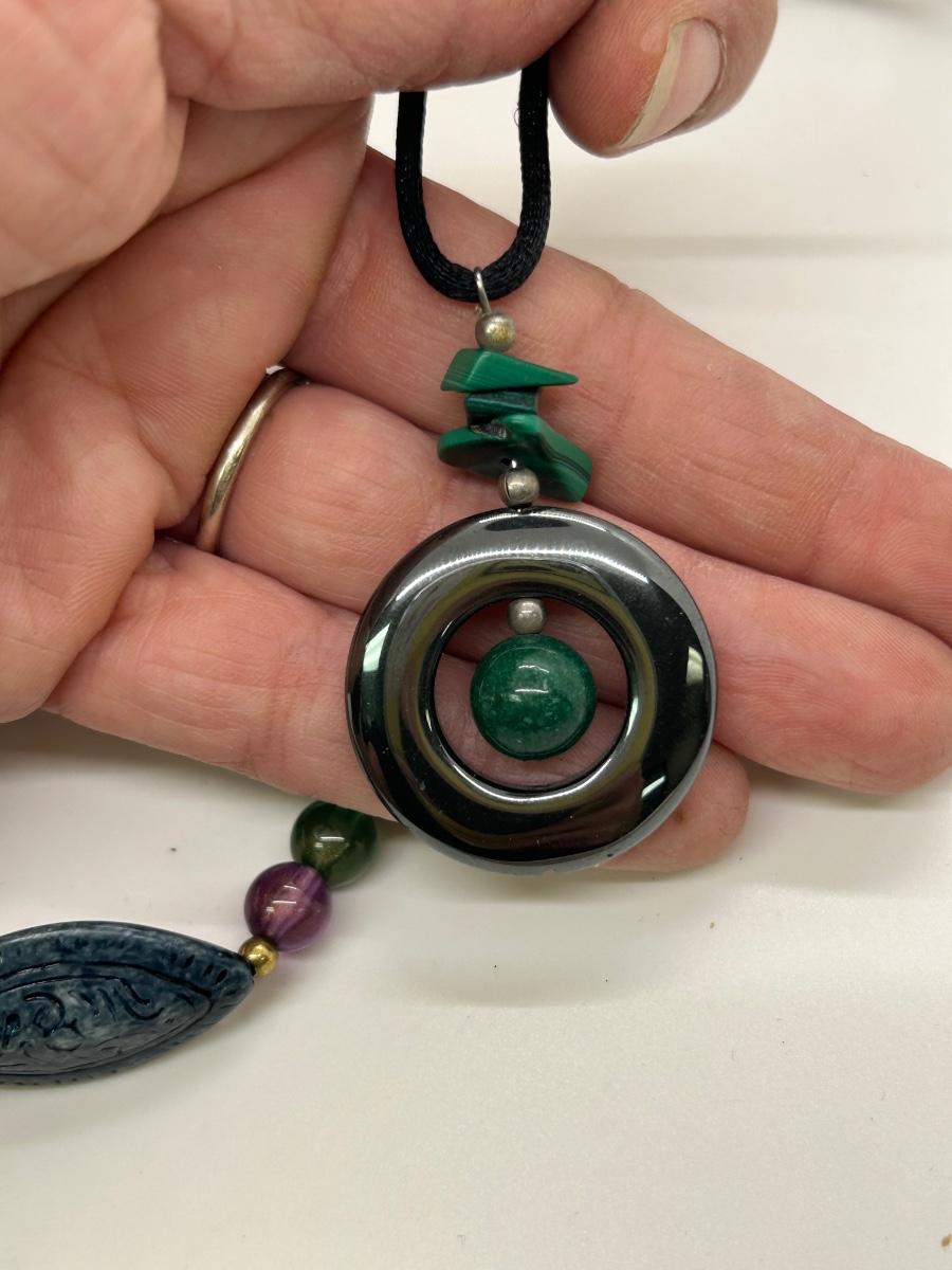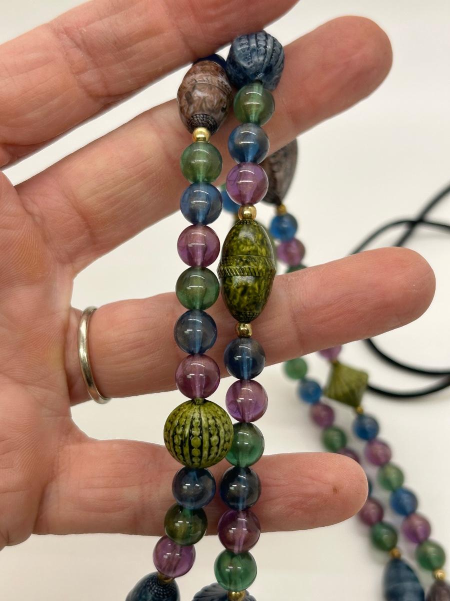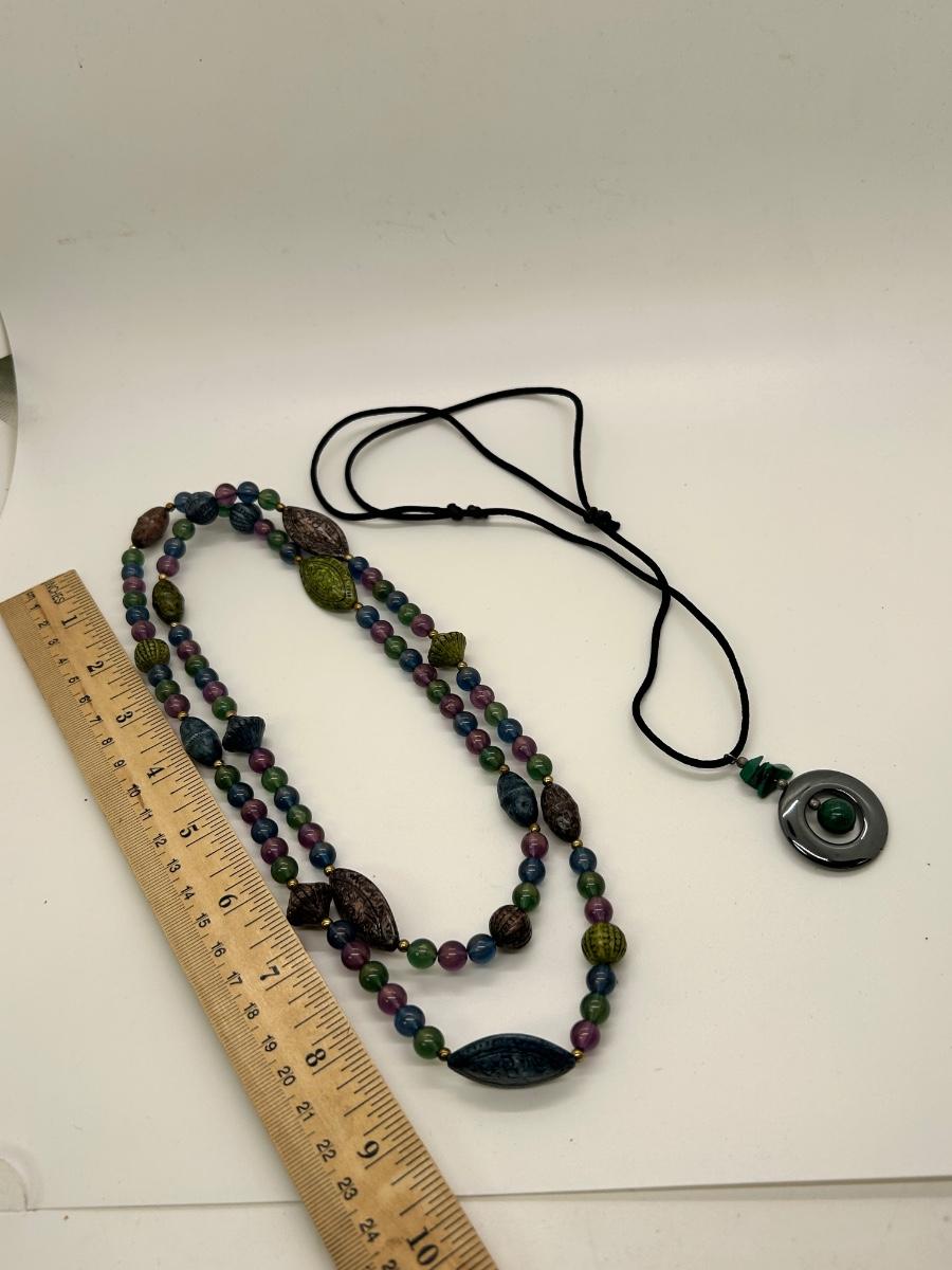 Pair of Stone Necklaces Corded Malachite Glass Beads. In good condition. Corded necklace is adjustable.