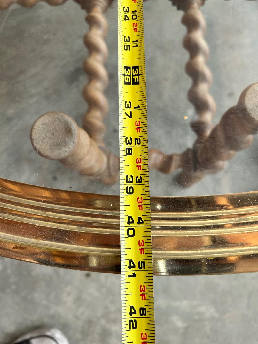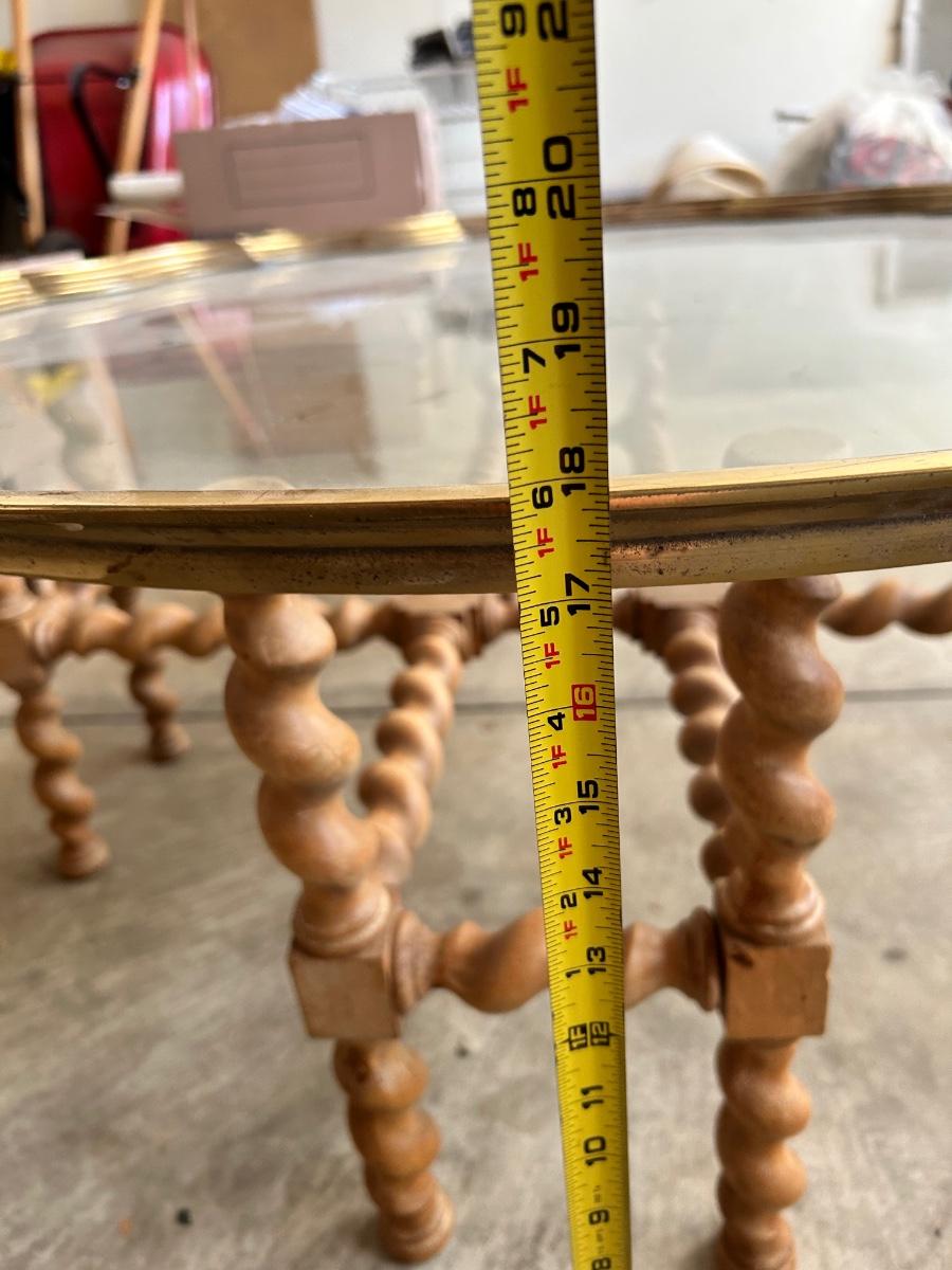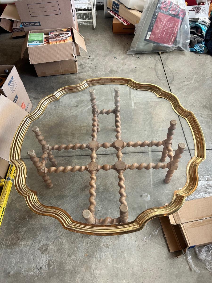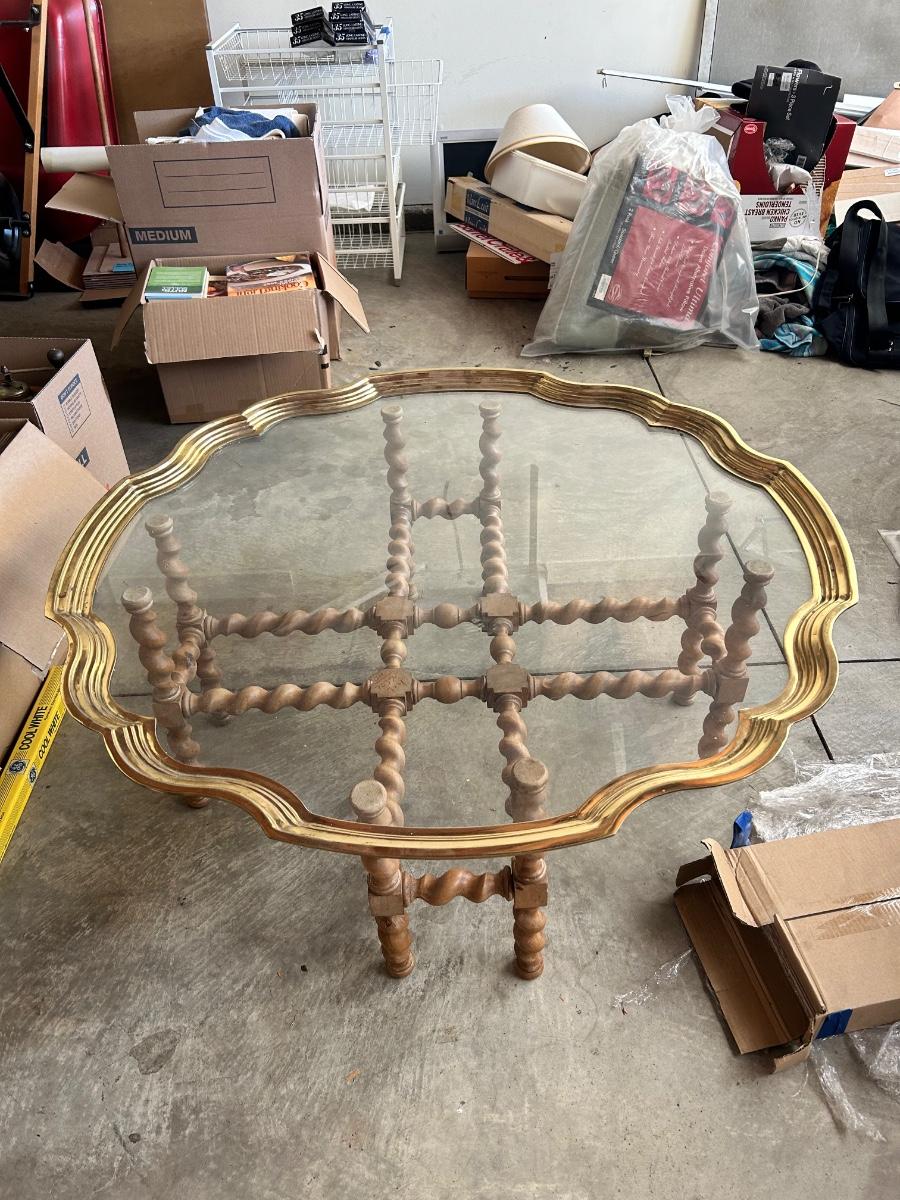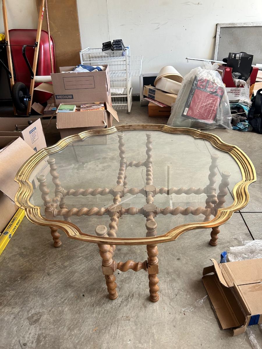Large Glass Top with Gold Edge Turned Wood Base Coffee Table **PICKUP FULLERTON**