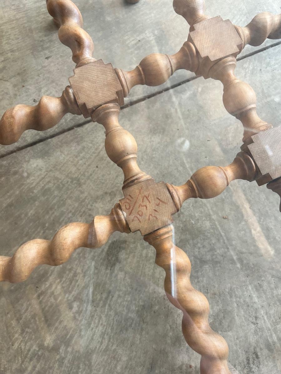 Large Glass Top with Gold Edge Turned Wood Base Coffee Table. Light finished turned wood could easily be painted. In good condition. About 41" diameter. **Pick up to be arranged in Fullerton after auction closes**