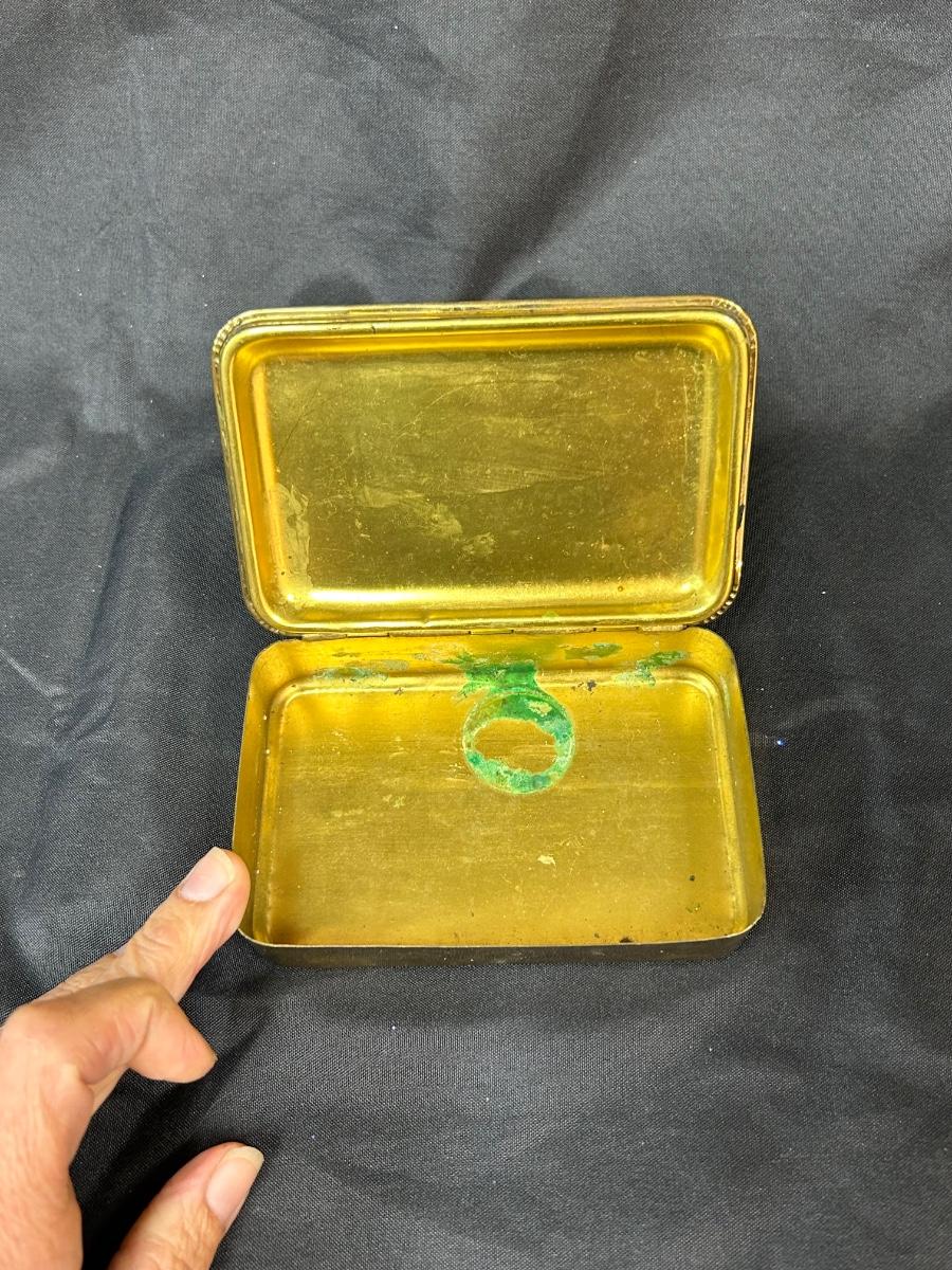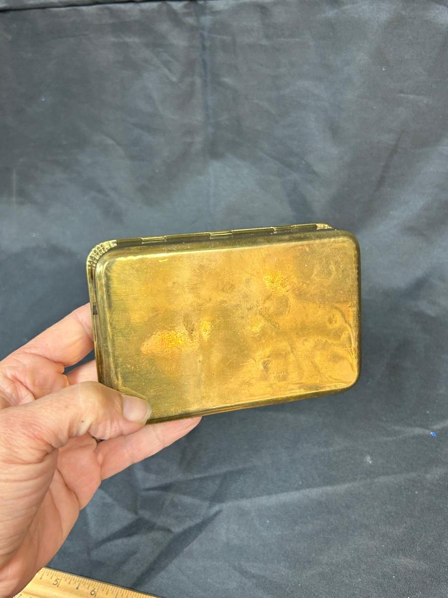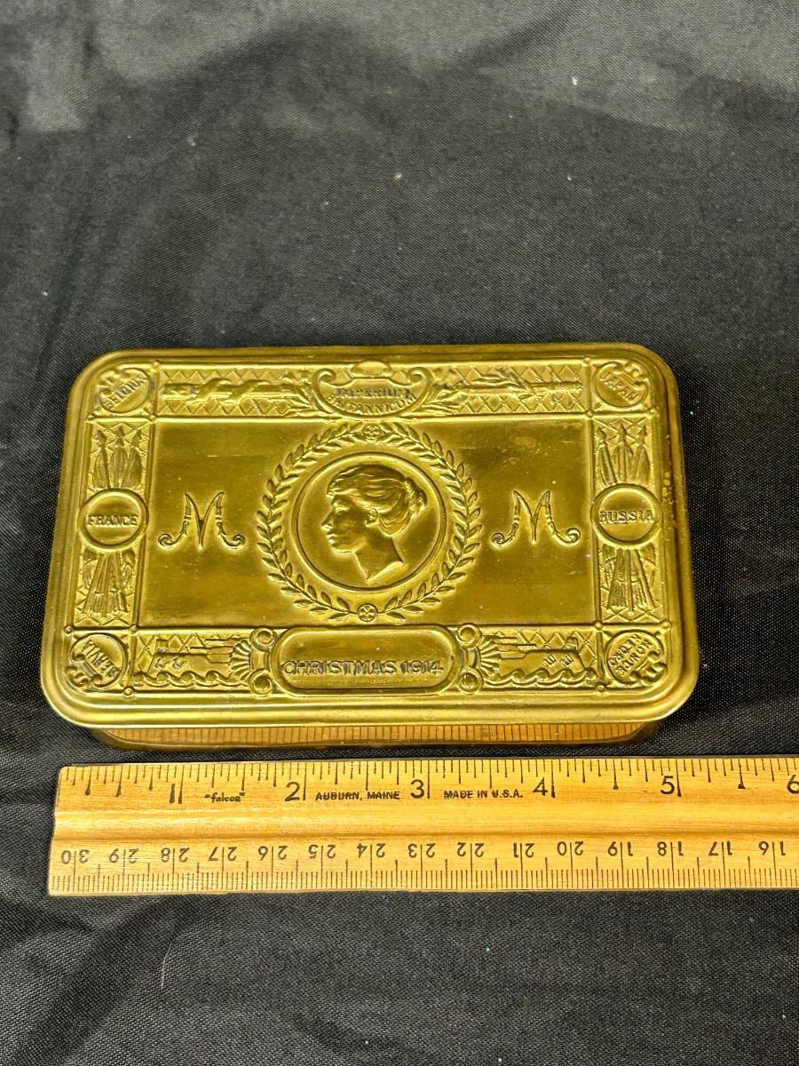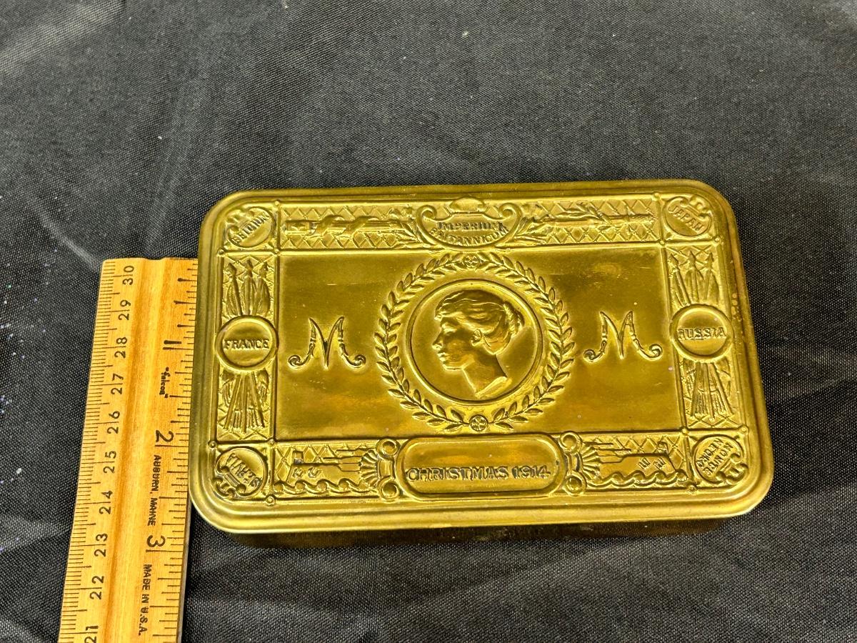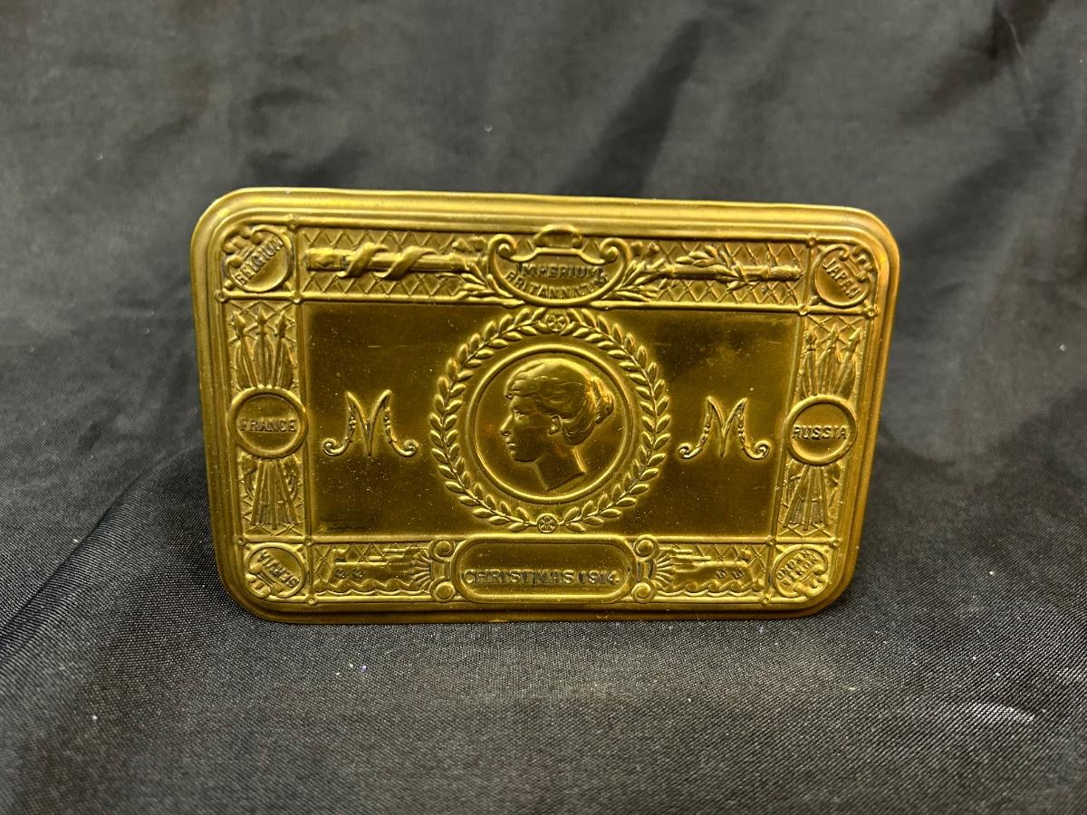 Vintage Embossed Brass Tone Collector Tin Christmas 1914. In good vintage condition. Not sure if it is original 1914 or reproduction. Hinged lid. About 5" size.