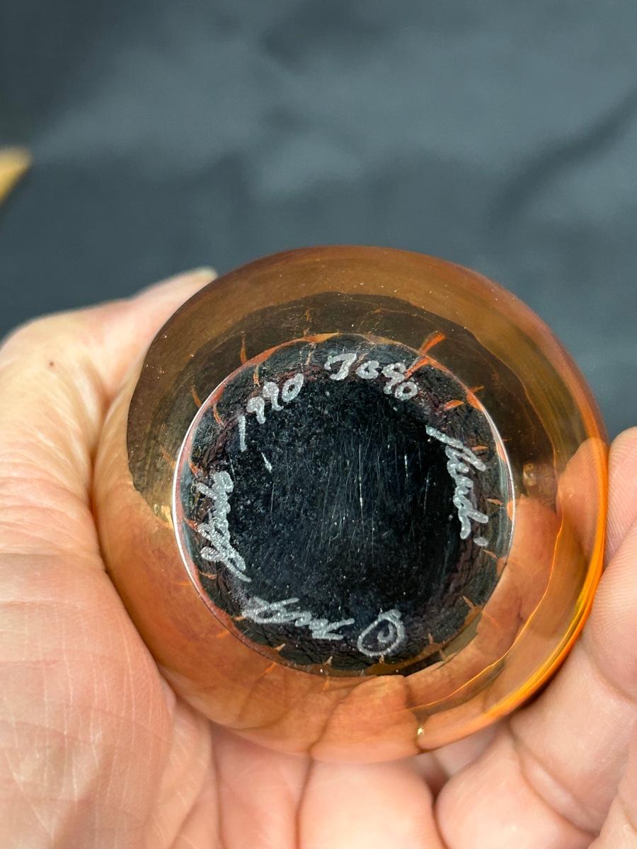 Iridescent Amber Blown Art Glass Egg Figurine Paperweight Signed. In good condition. Interesting art glass piece. Signed and numbered on the bottom it looks like. About 3" size.