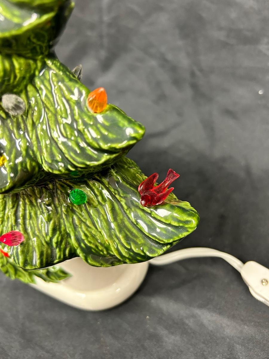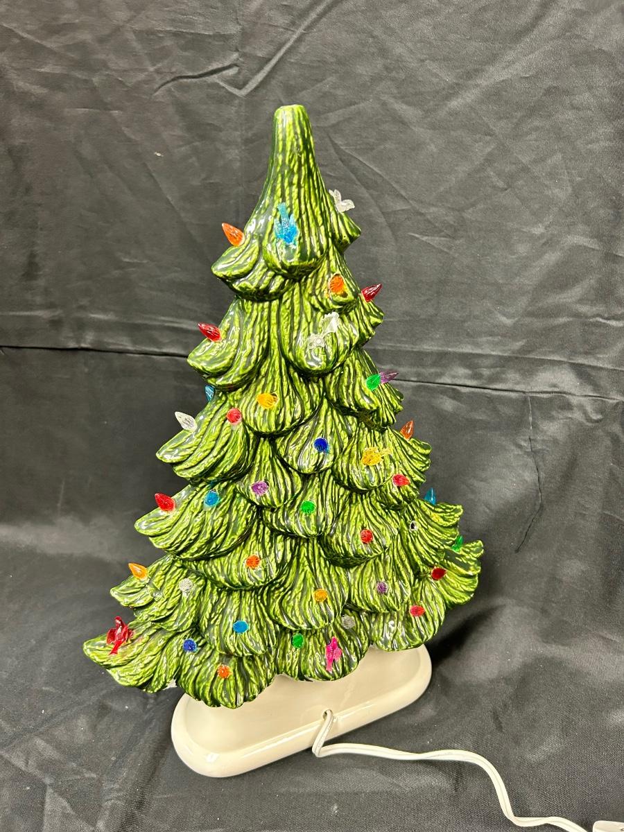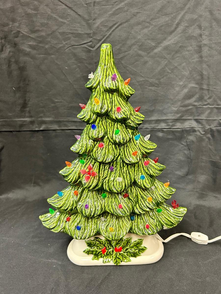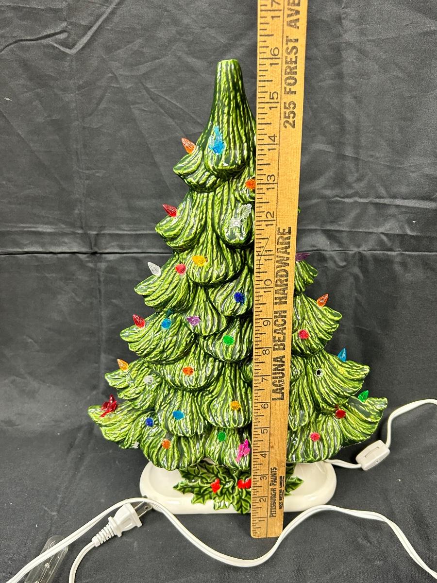 Vintage Light Up Ceramic Christmas Holiday Tree Slender Shape Two Pieces. Interesting tree, slim structure for narrow places. Works, comes with bulb. Has plastic tree lights, some in different shapes. No star on top. About 16" size with base. There is a mark but no name on the bottom.