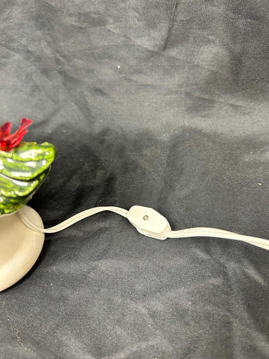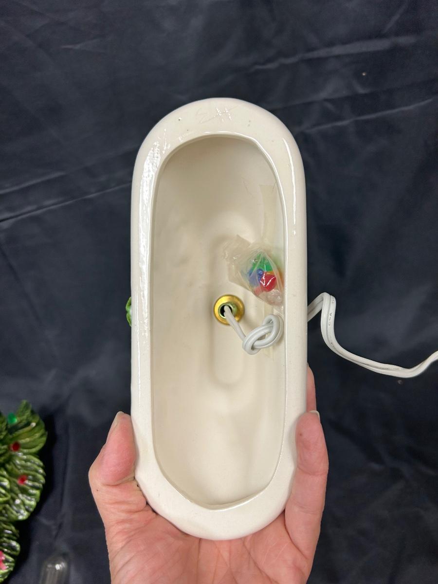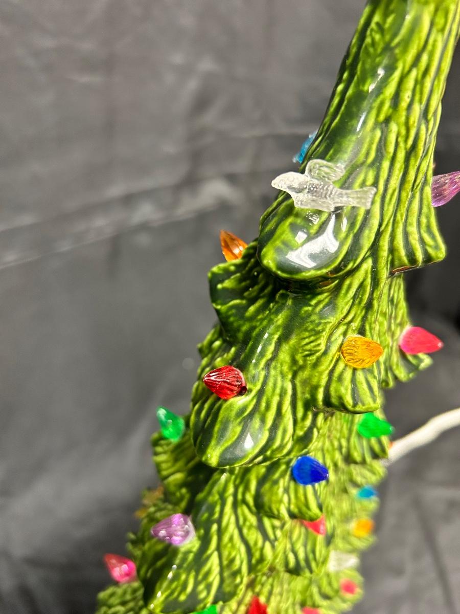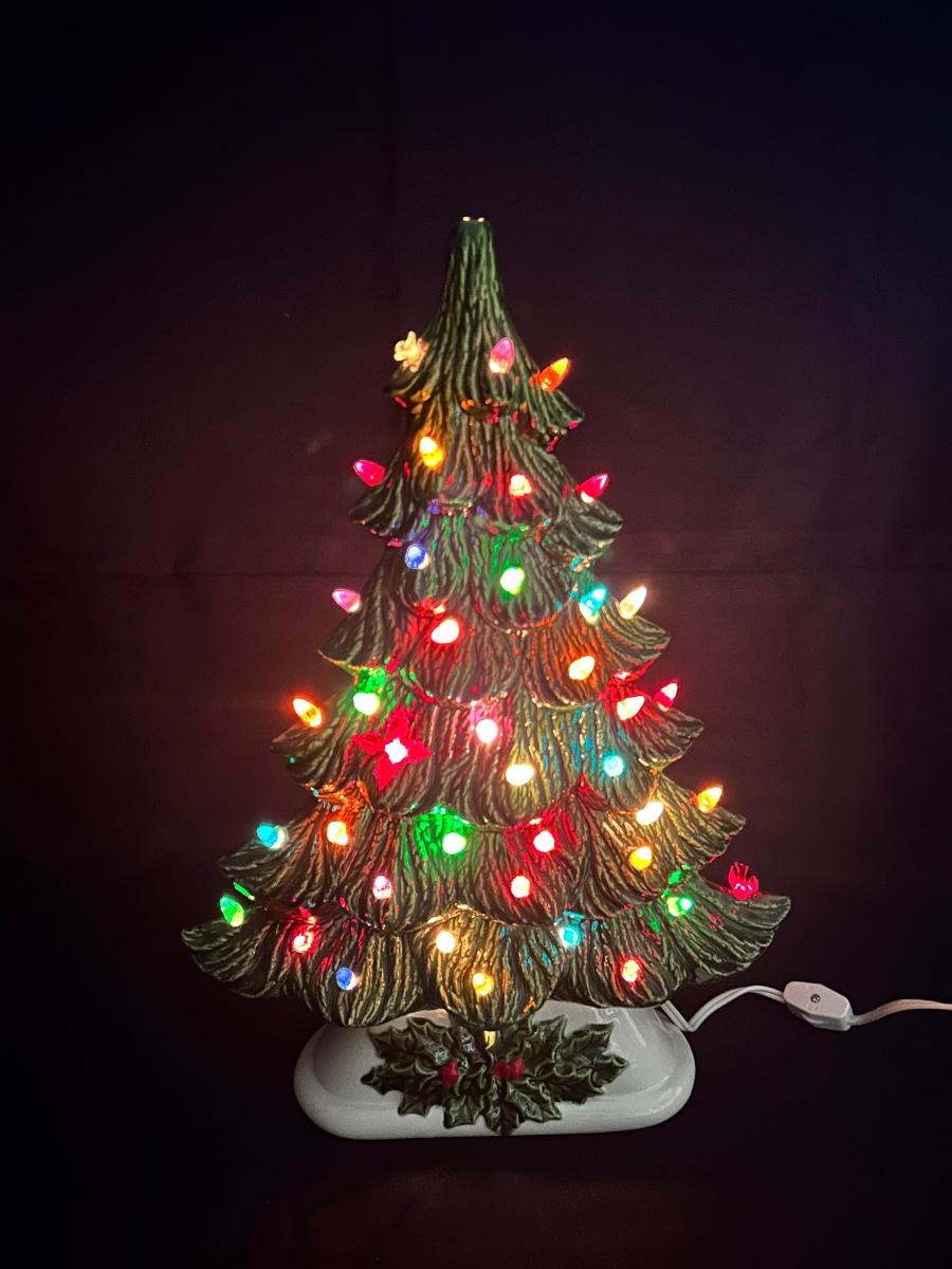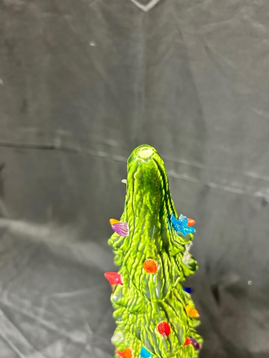 Vintage Light Up Ceramic Christmas Holiday Tree Slender Shape Two Pieces. Interesting tree, slim structure for narrow places. Works, comes with bulb. Has plastic tree lights, some in different shapes. No star on top. About 16" size with base. There is a mark but no name on the bottom.