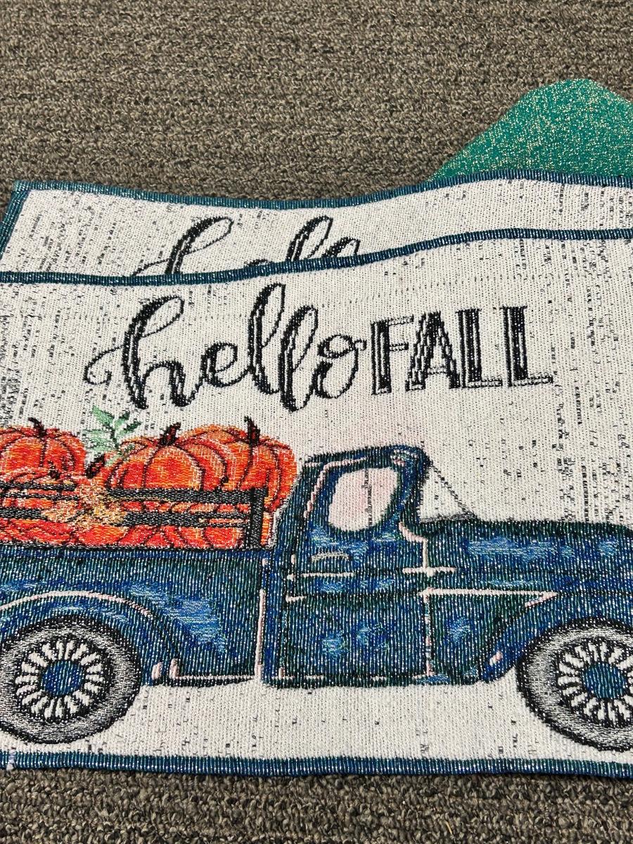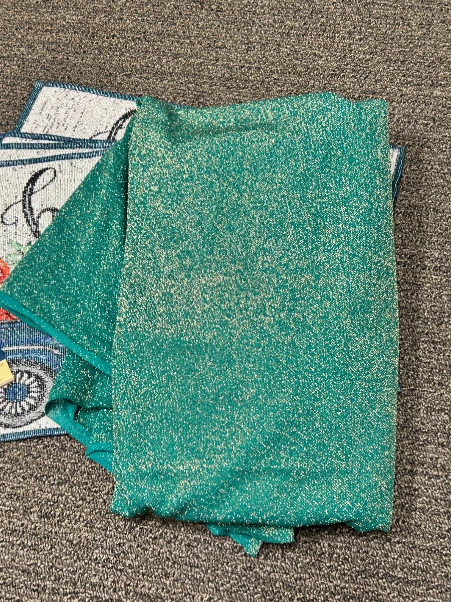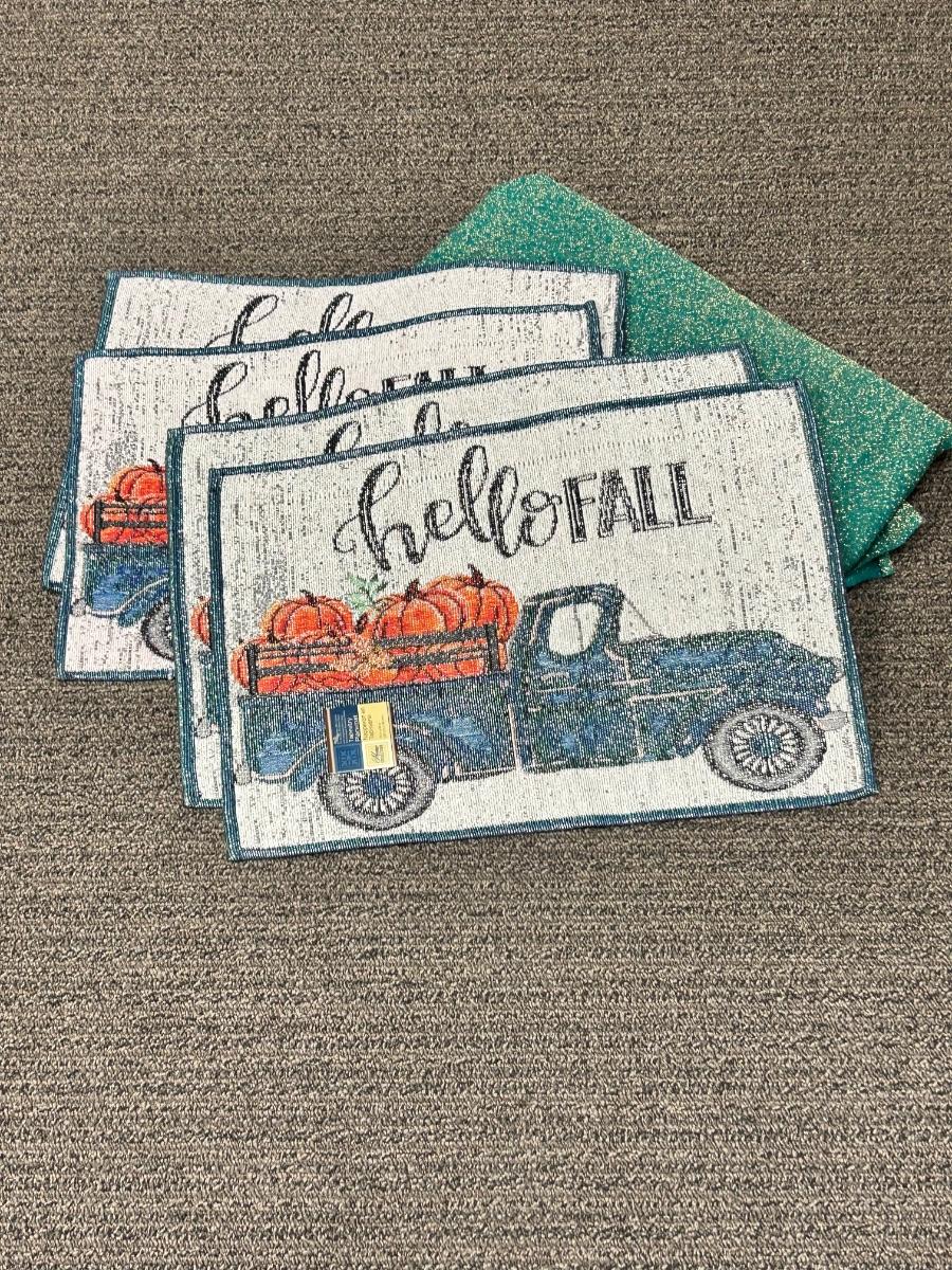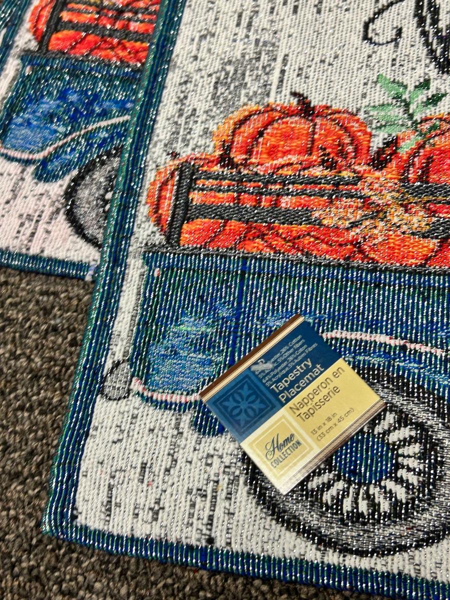 Metallic Thread Woven Autumn Placemats and Green Gold Table Cover. In good condition. Two placemats still have original tags. No major stains noticed.