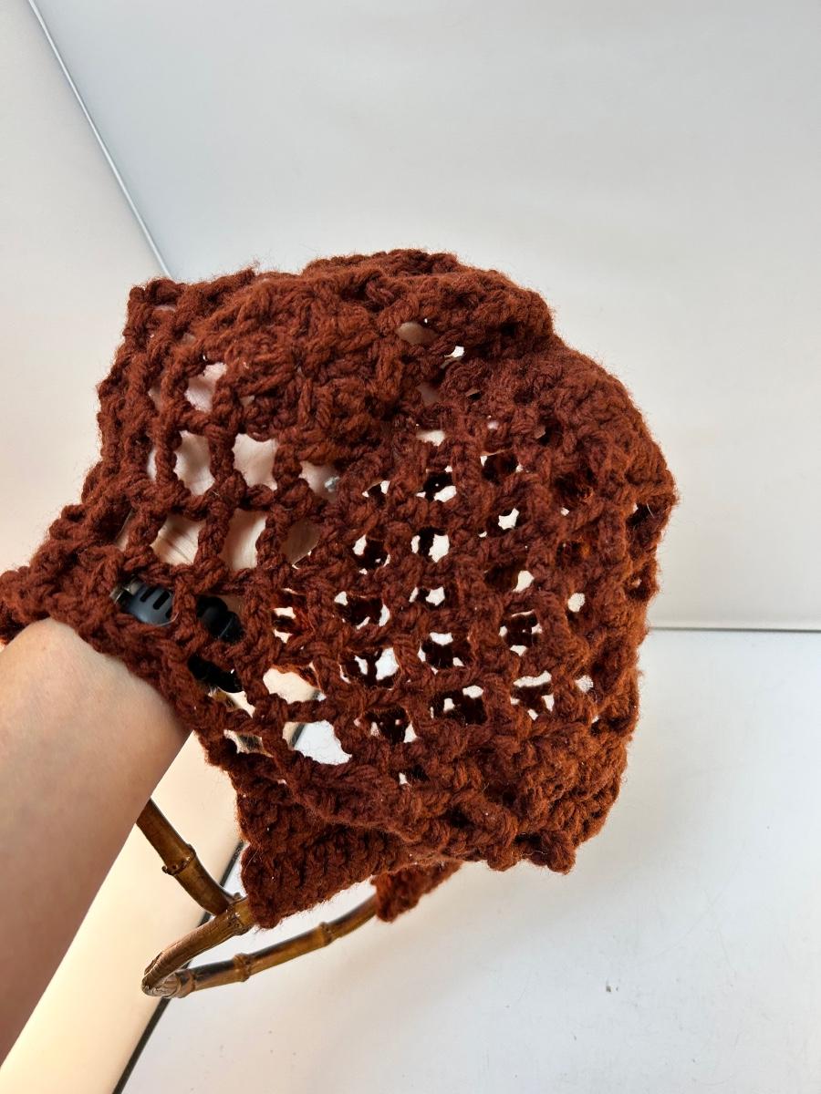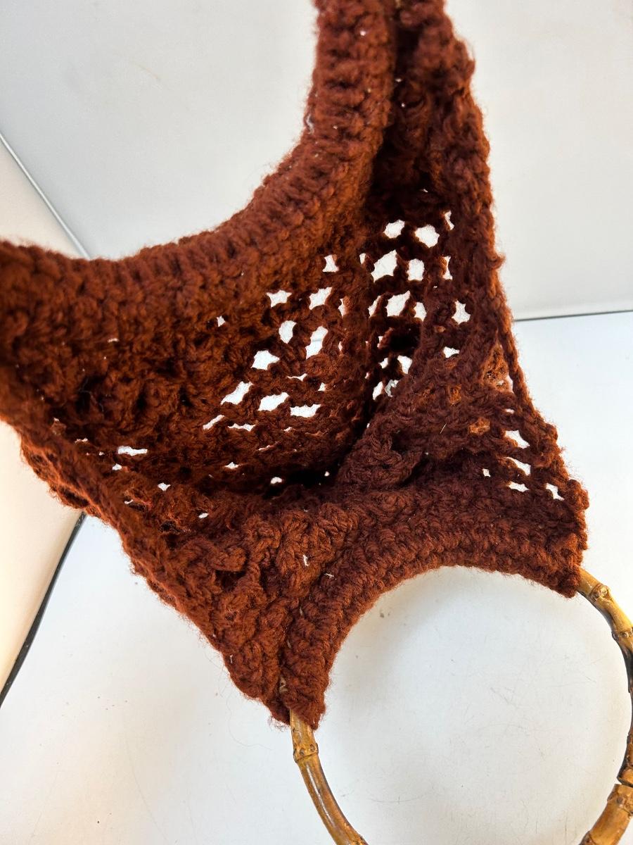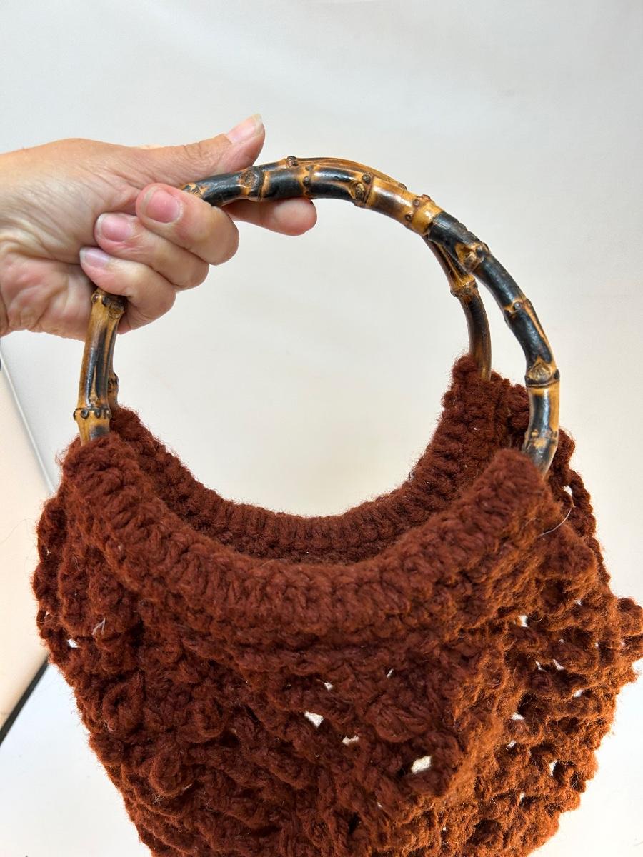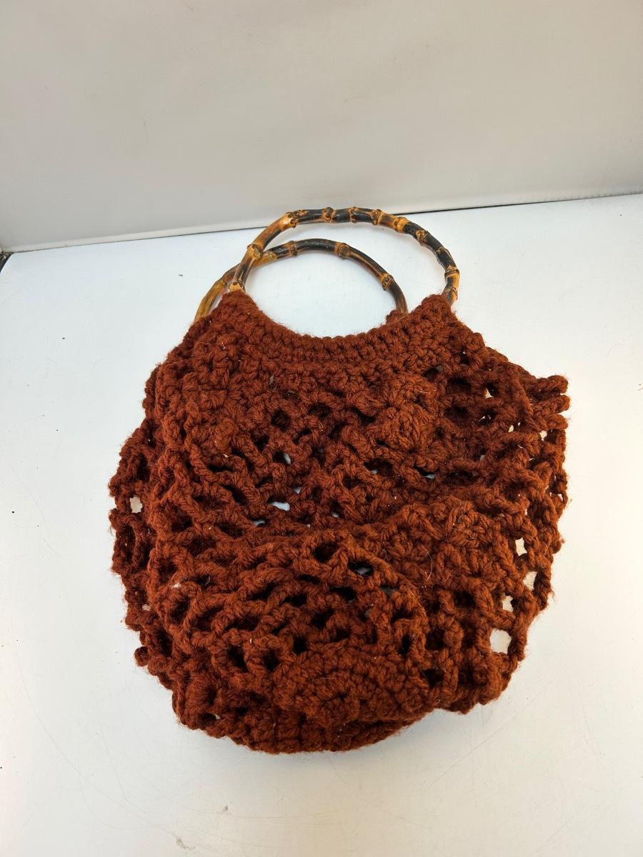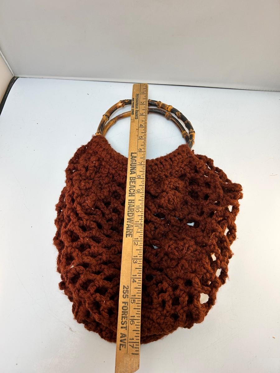 Retro Style Vintage Crochet Handbag with Bamboo Style Ring Handles. In good condition. Unlined, things may fall through the yarn work.