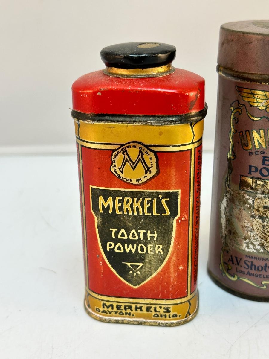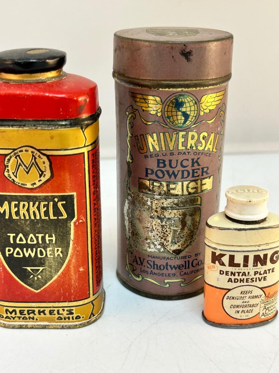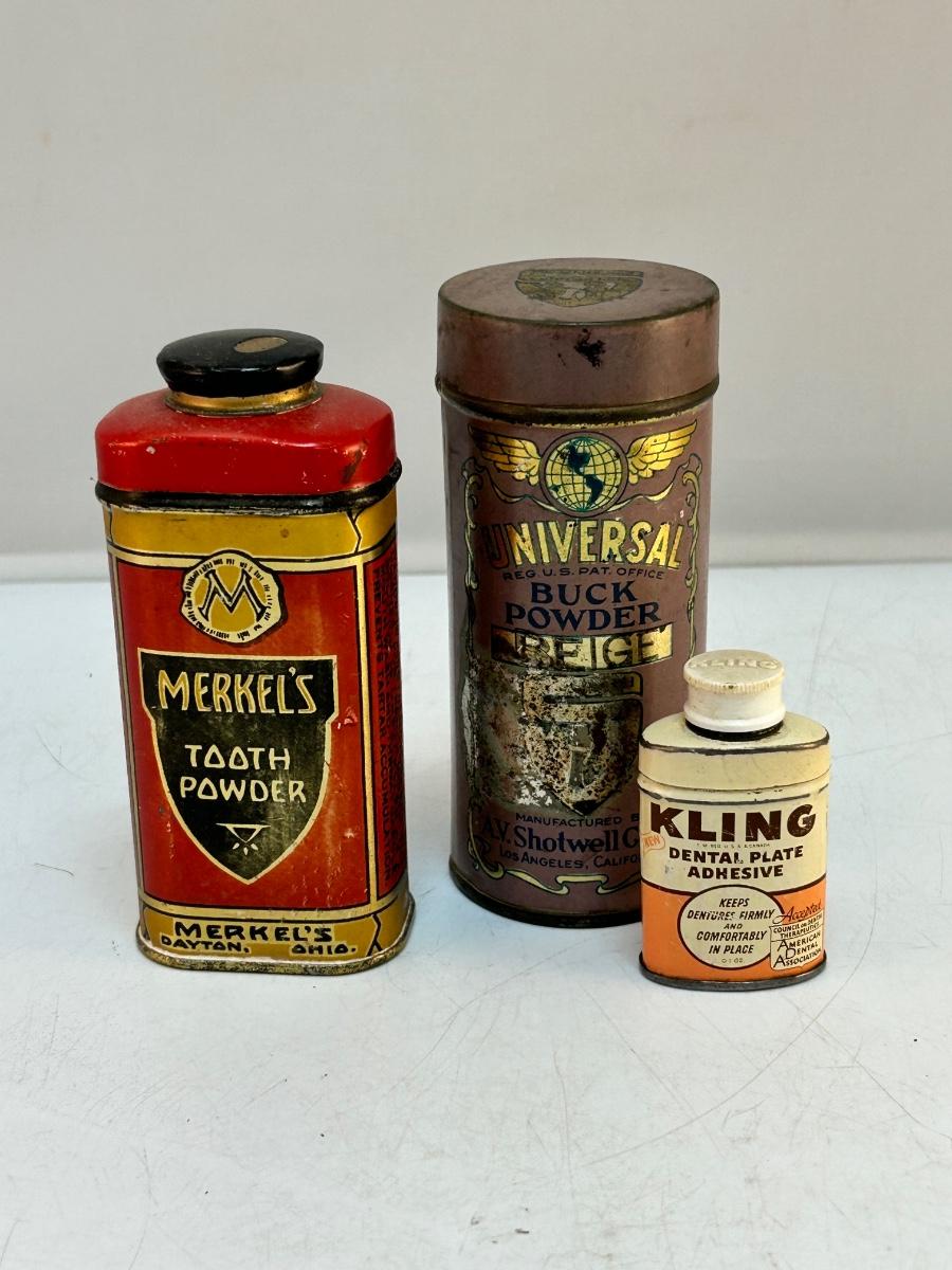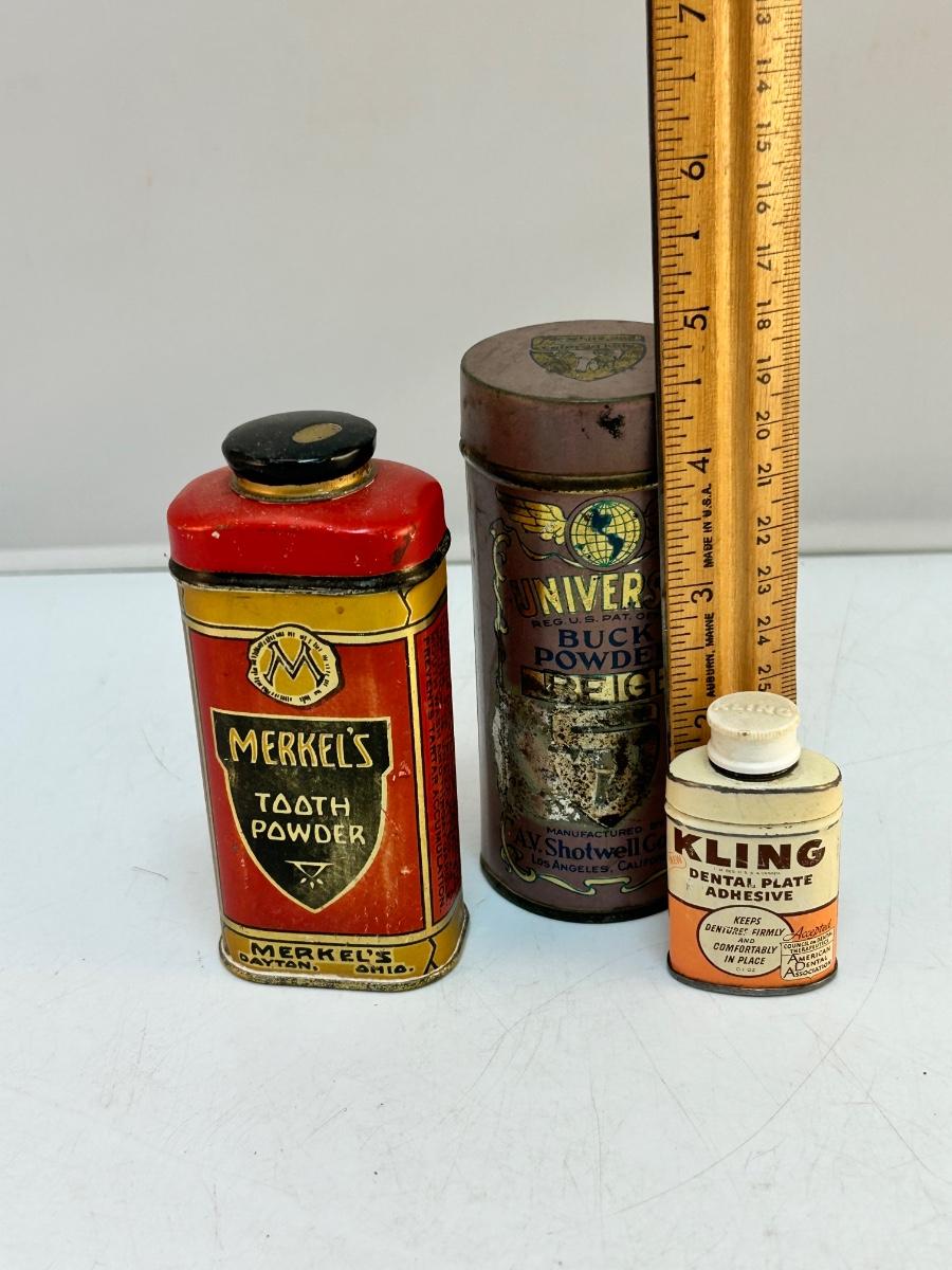 Vintage Tin Dental Product Advertising Merkel's Powder, Universal Buck Powder Kling Plate Adhesive
