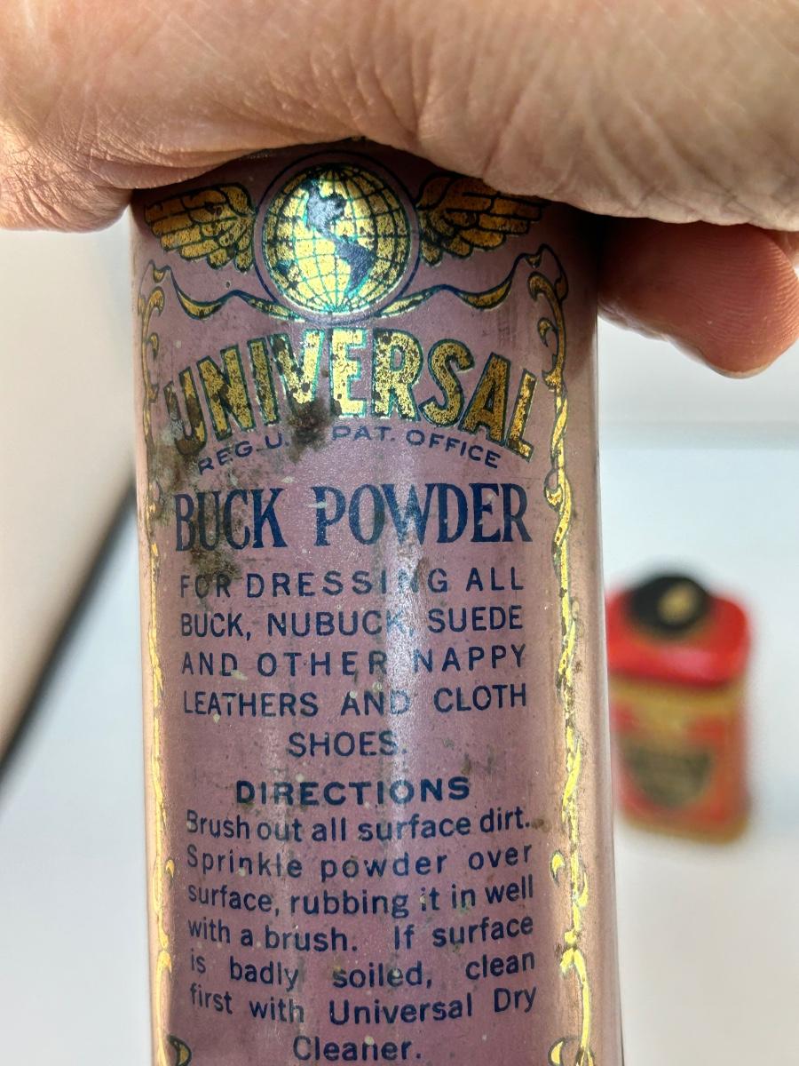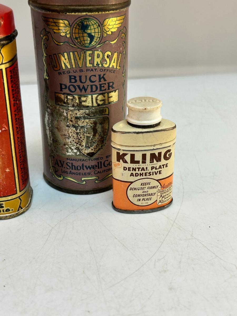 Vintage Tin Personal Product Containers Tooth Powder Buck Powder Dental Adhesive. Great for display.