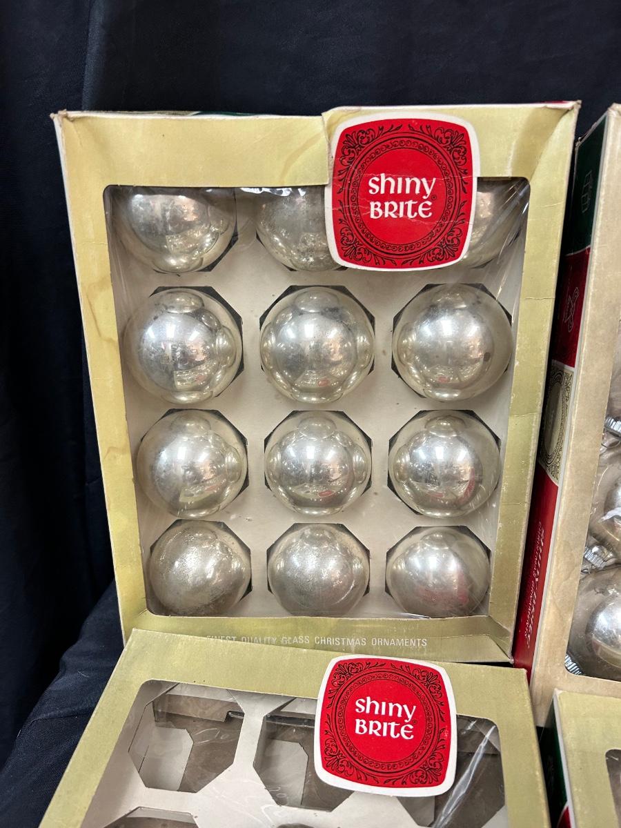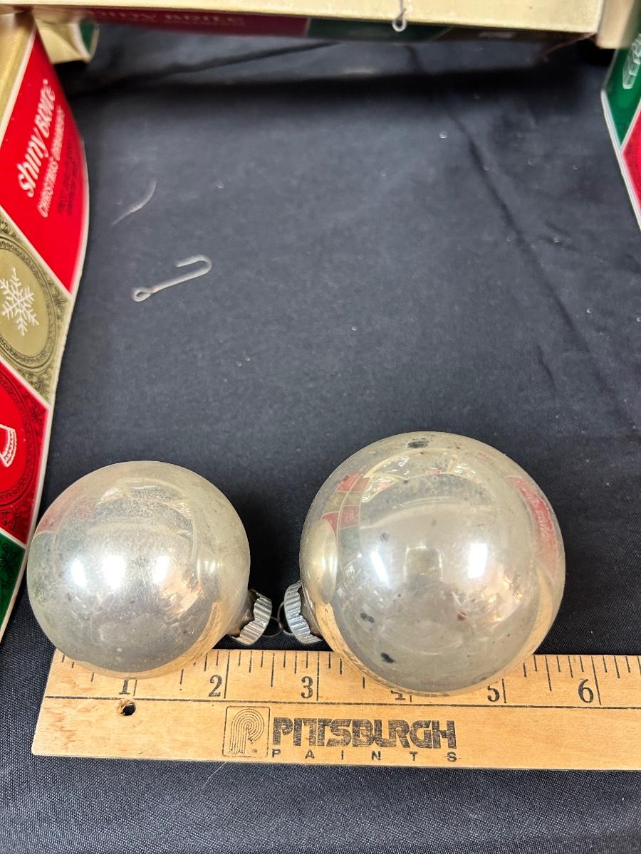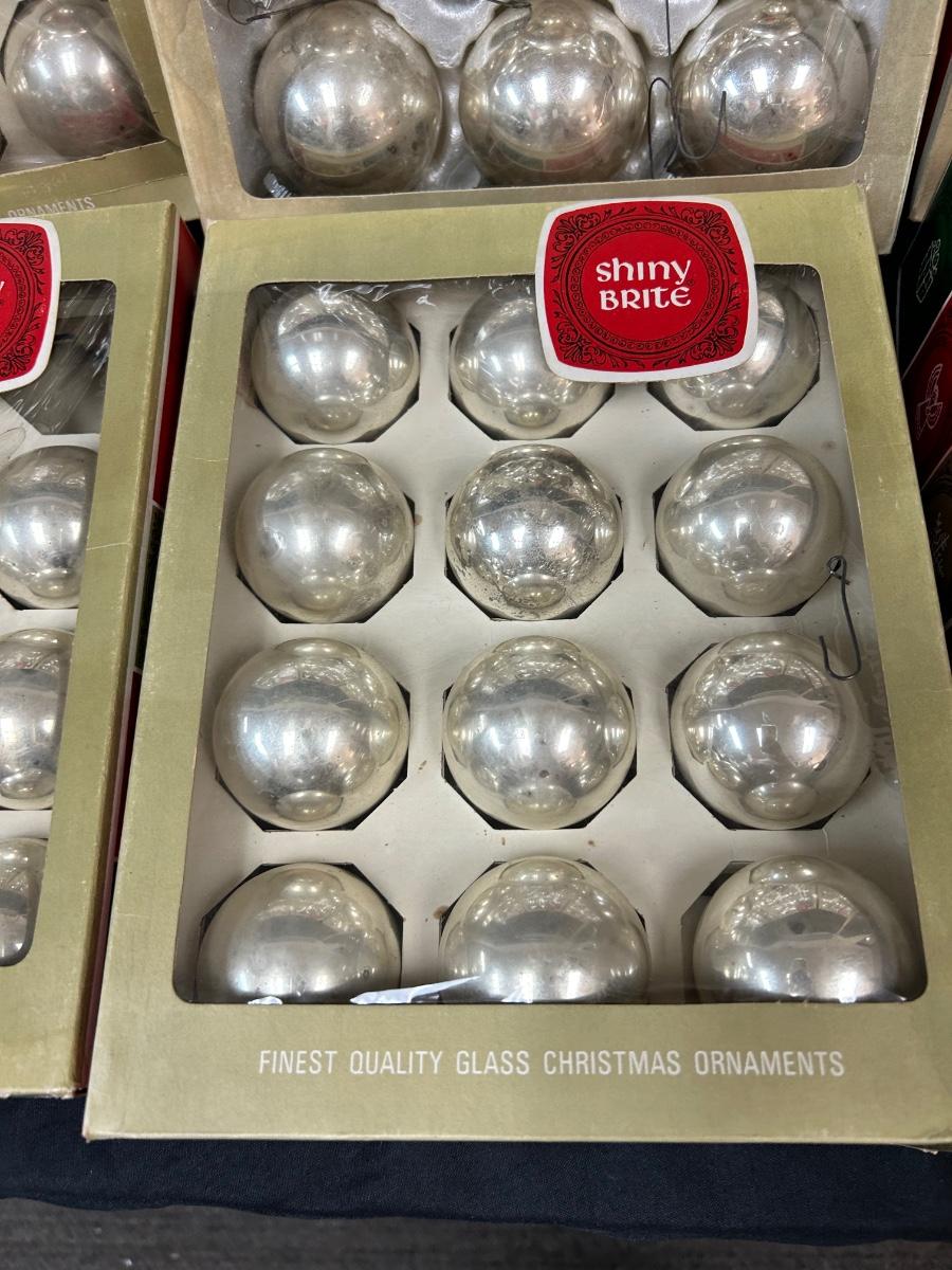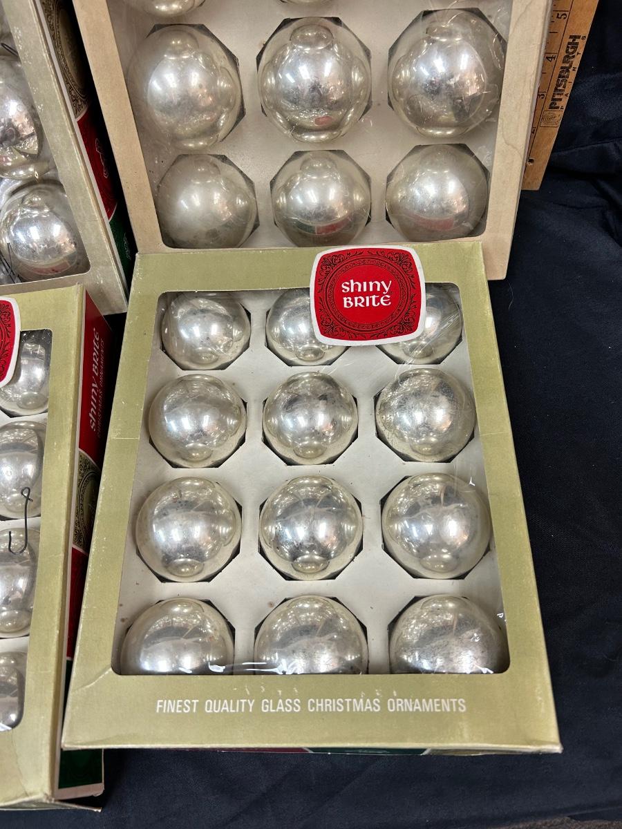 Large Lot of Silver Blown Glass Shiny Brite Christmas Holiday Tree Ornaments Two Sizes. In good vintage condition. 4 boxes of 3" and 2 boxes of 2". One box of 2" if not complete, missing 4. And one is missing out of a box of 3".