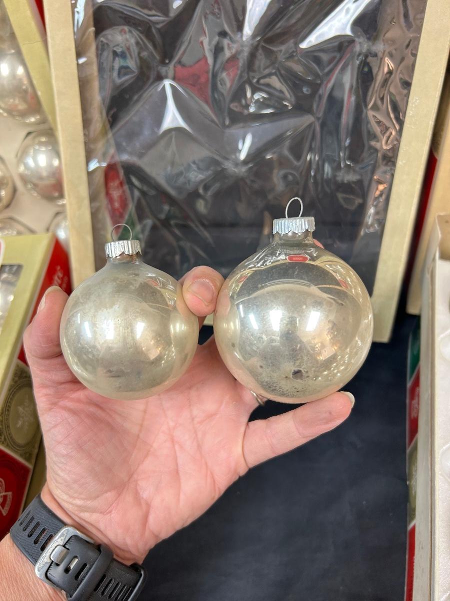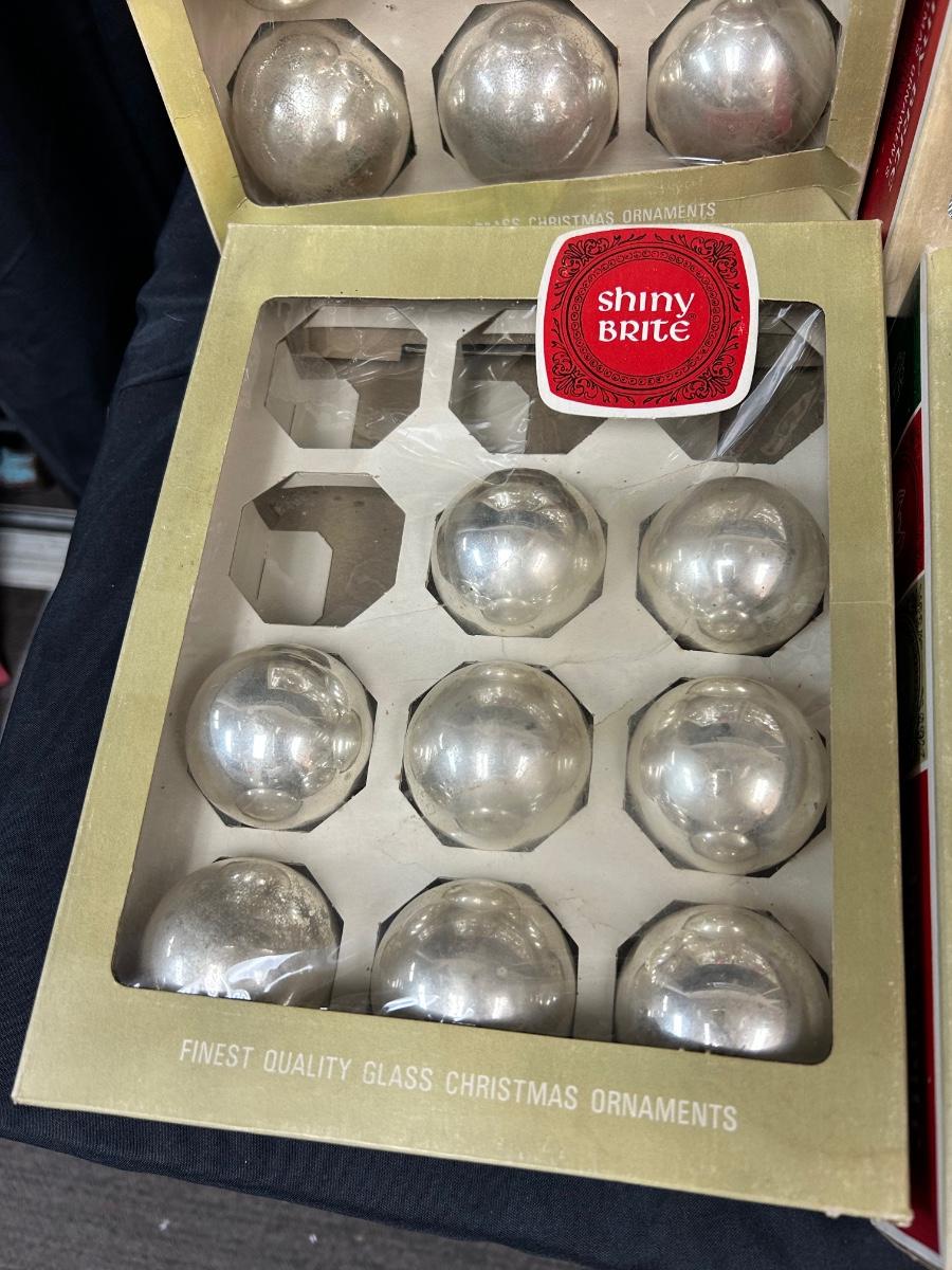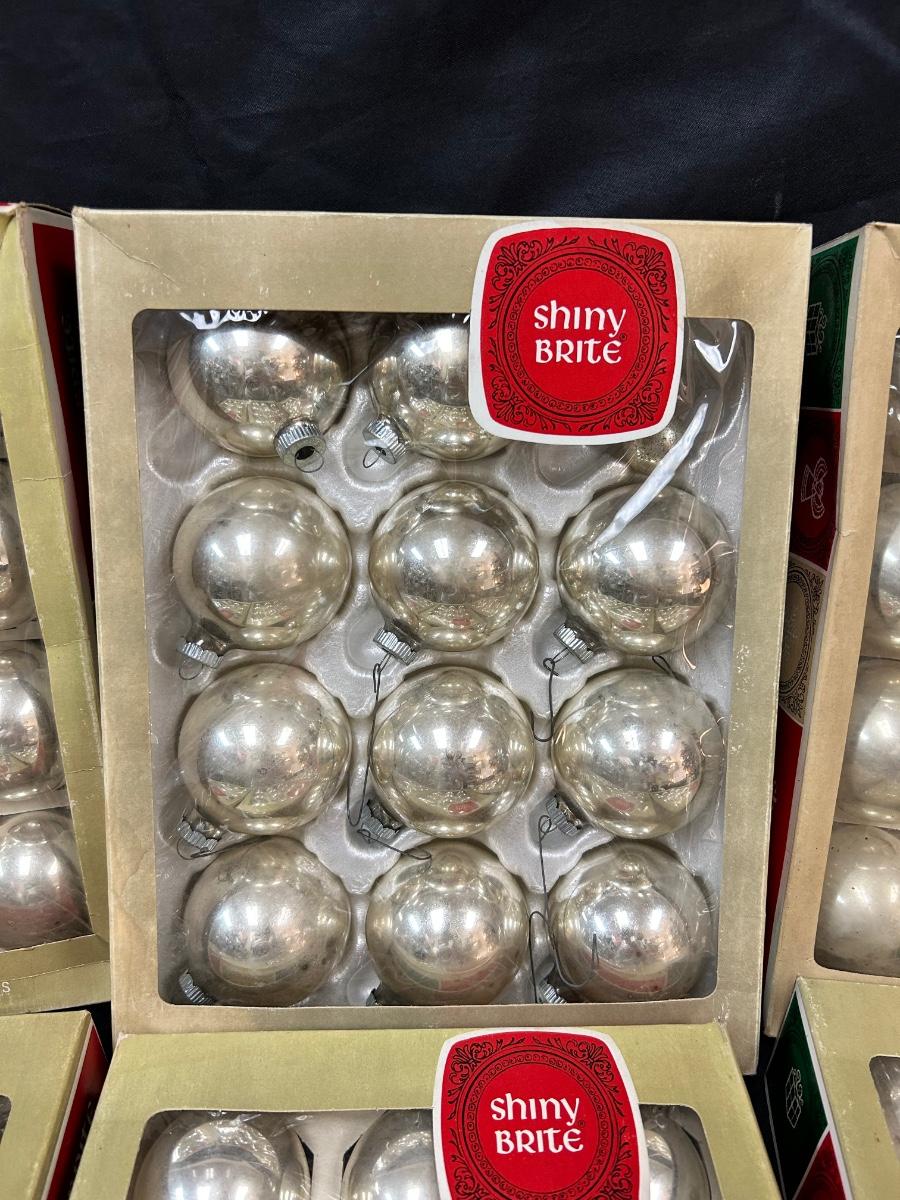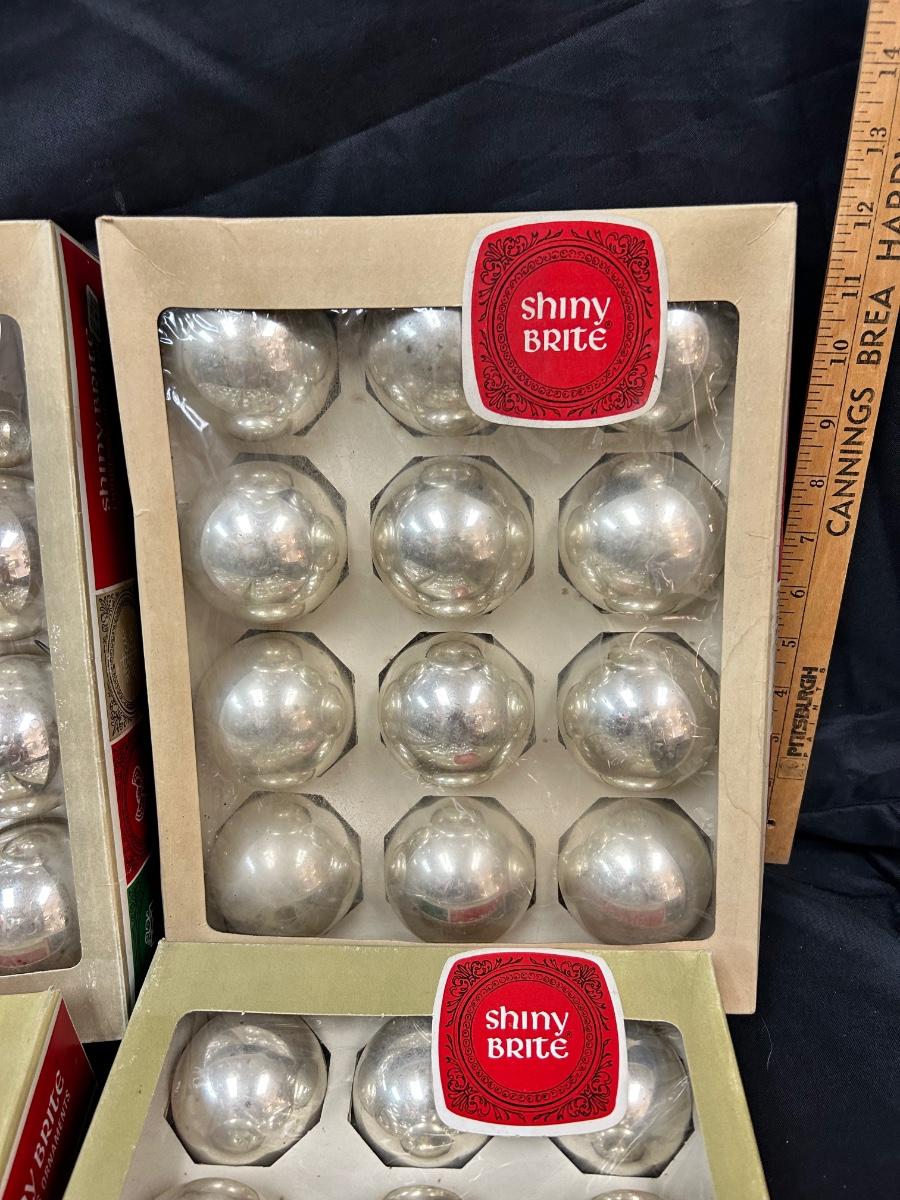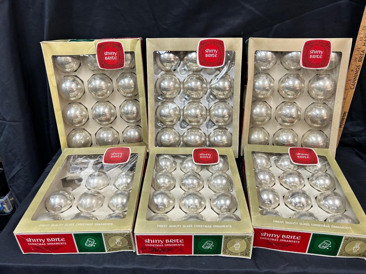 Large Lot of Silver Blown Glass Shiny Brite Christmas Holiday Tree Ornaments Two Sizes. In good vintage condition. 4 boxes of 3" and 2 boxes of 2". One box of 2" if not complete, missing 4. And one is missing out of a box of 3".