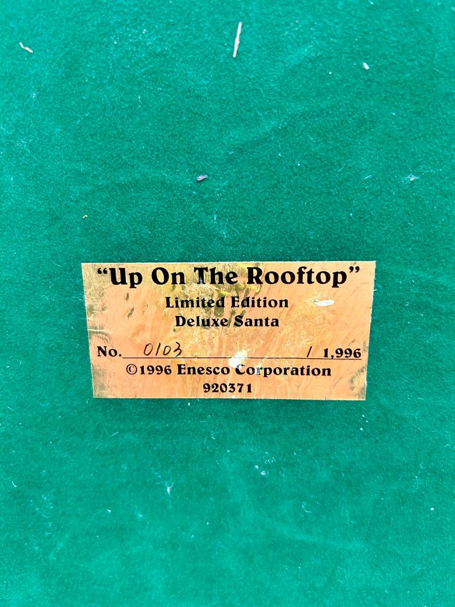 1996 Enesco Up on the Rooftop Limited Edition Deluxe Santa Claus Christmas Holiday Figurine Statue. In good condition. No damage noticed. Numbered on the bottom.