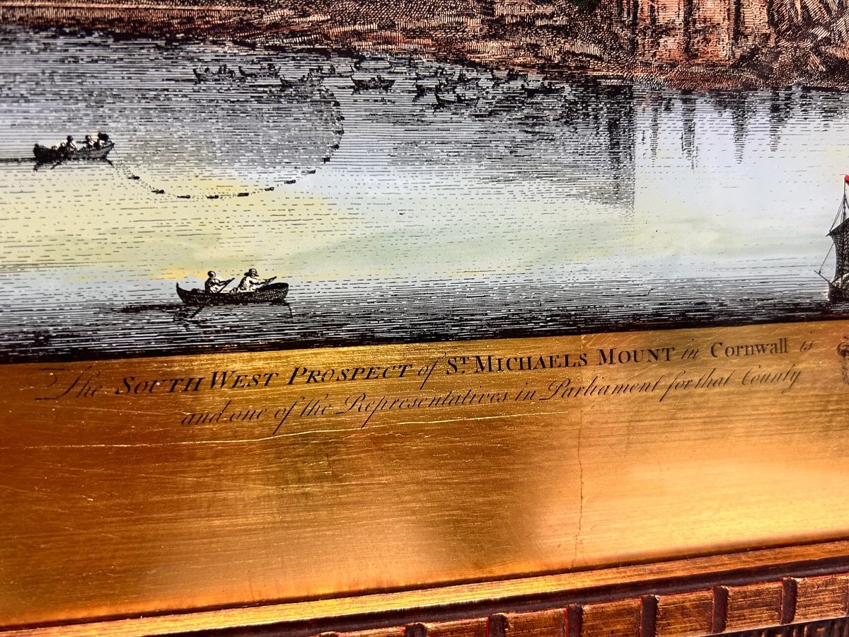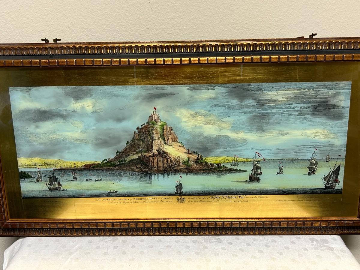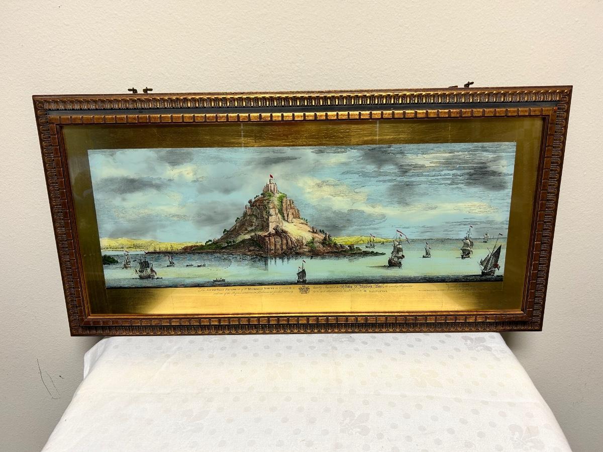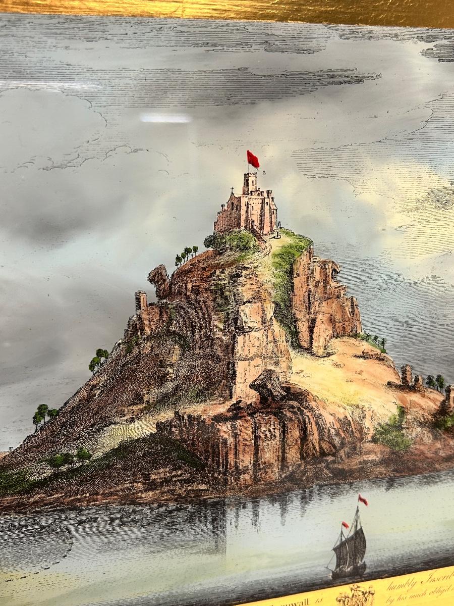 Antique Vintage Gold Gilt Edge Reverse Painted Colorized Etching St. Michael's Mount Cornwall