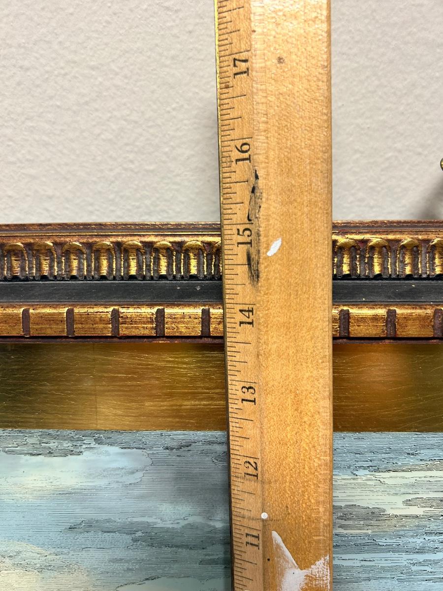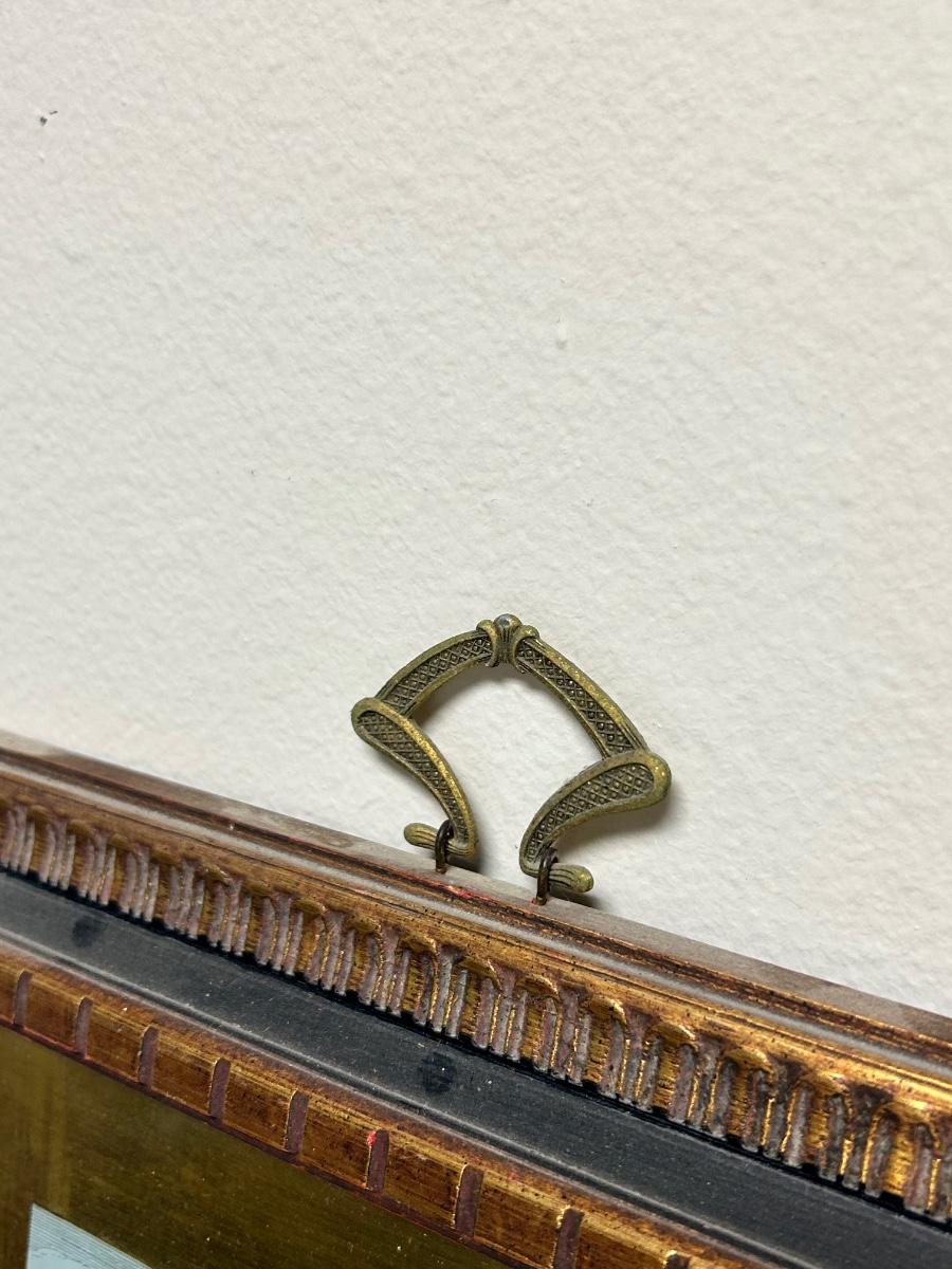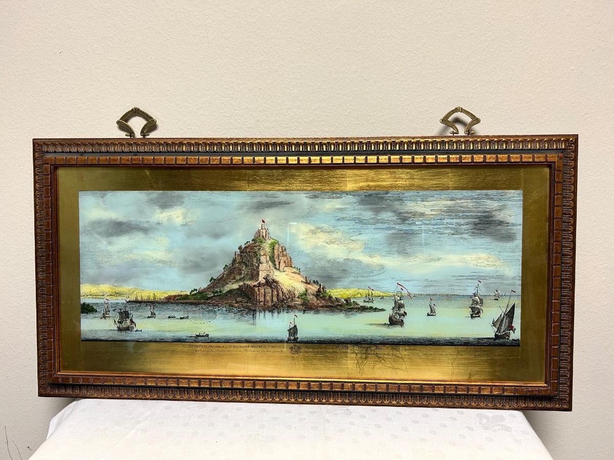 Antique Vintage Gold Gilt Edge Reverse Painted Colorized Etching St. Michael's Mount Cornwall. Beautifully done artwork. Looks to be reverse painted etching on the glass. Art is in very good condition but one hanging bracket needs to be fixed. Measures about 15"x30".