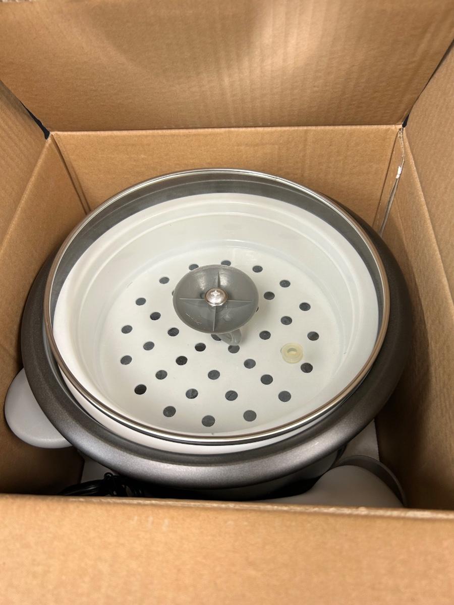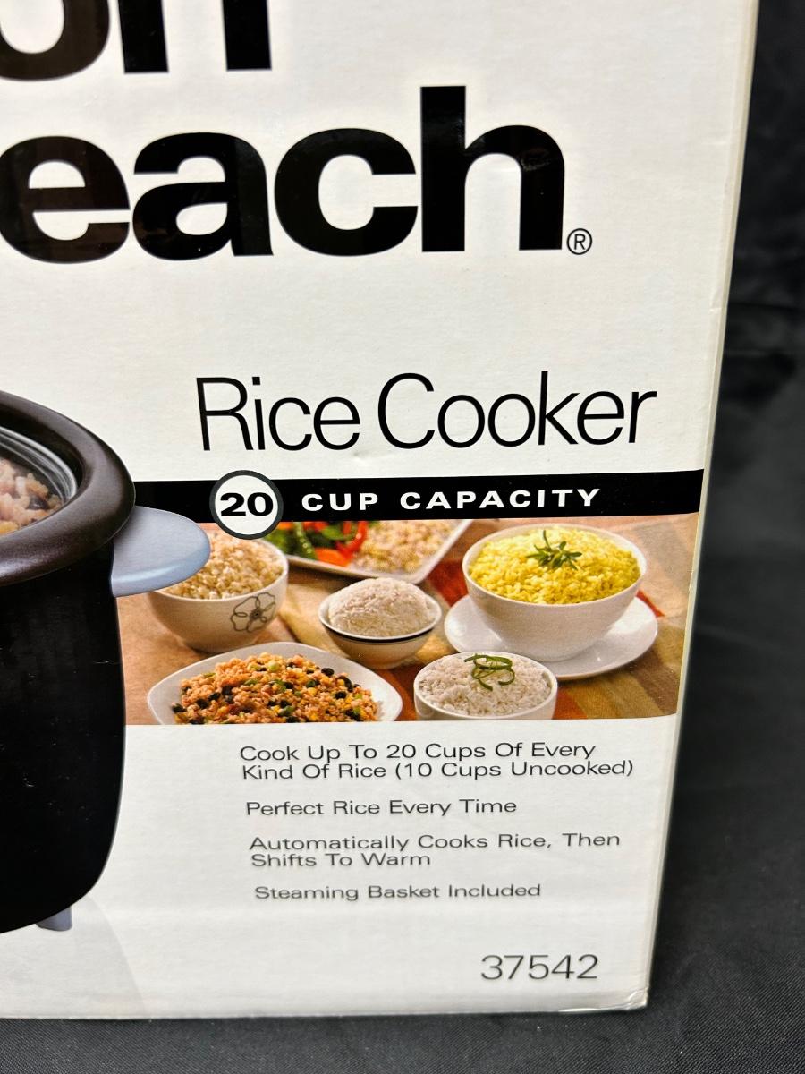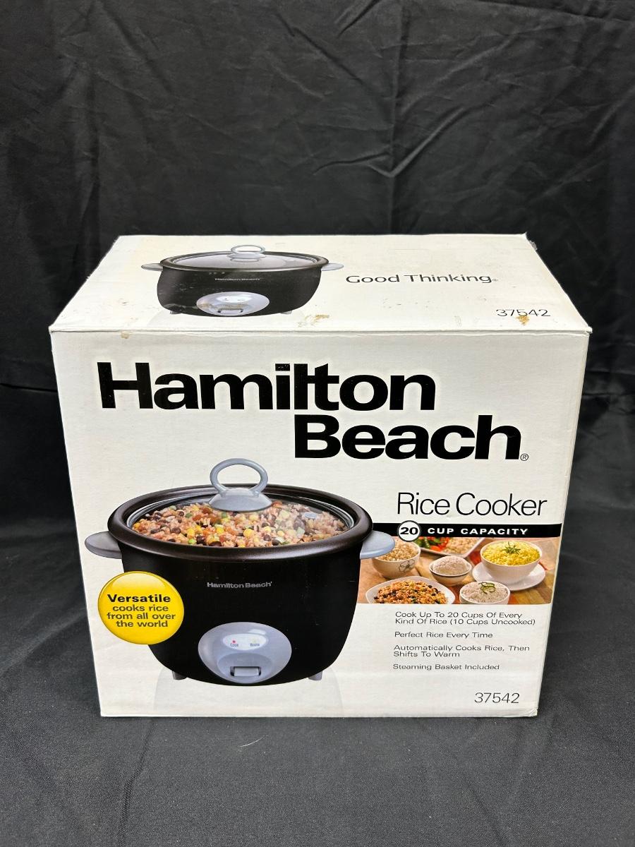 Hamilton Beach 20 Cup Rice Cooker with Steamer Basket in Original Box. Looks to be unused in the box, very clean.