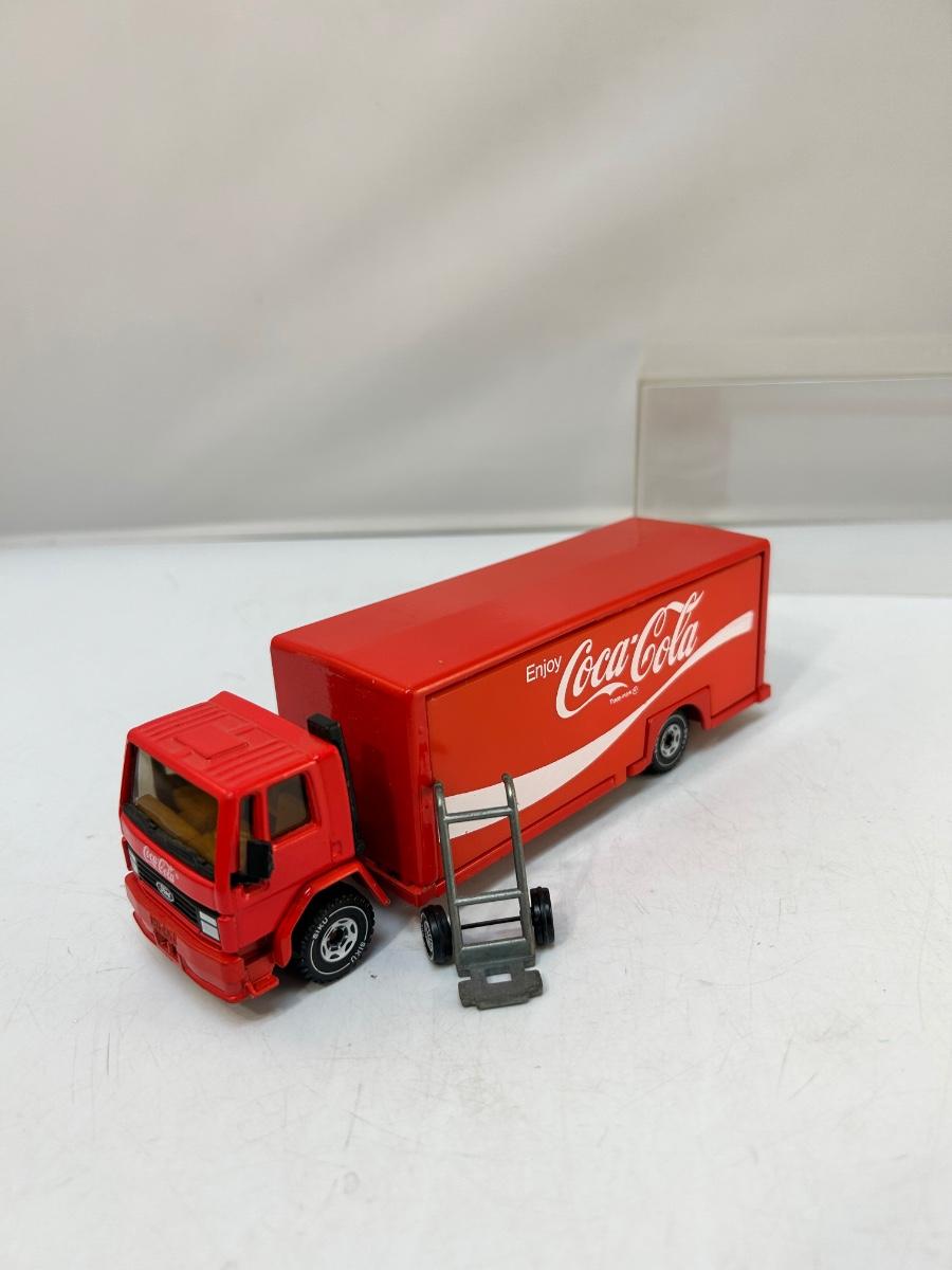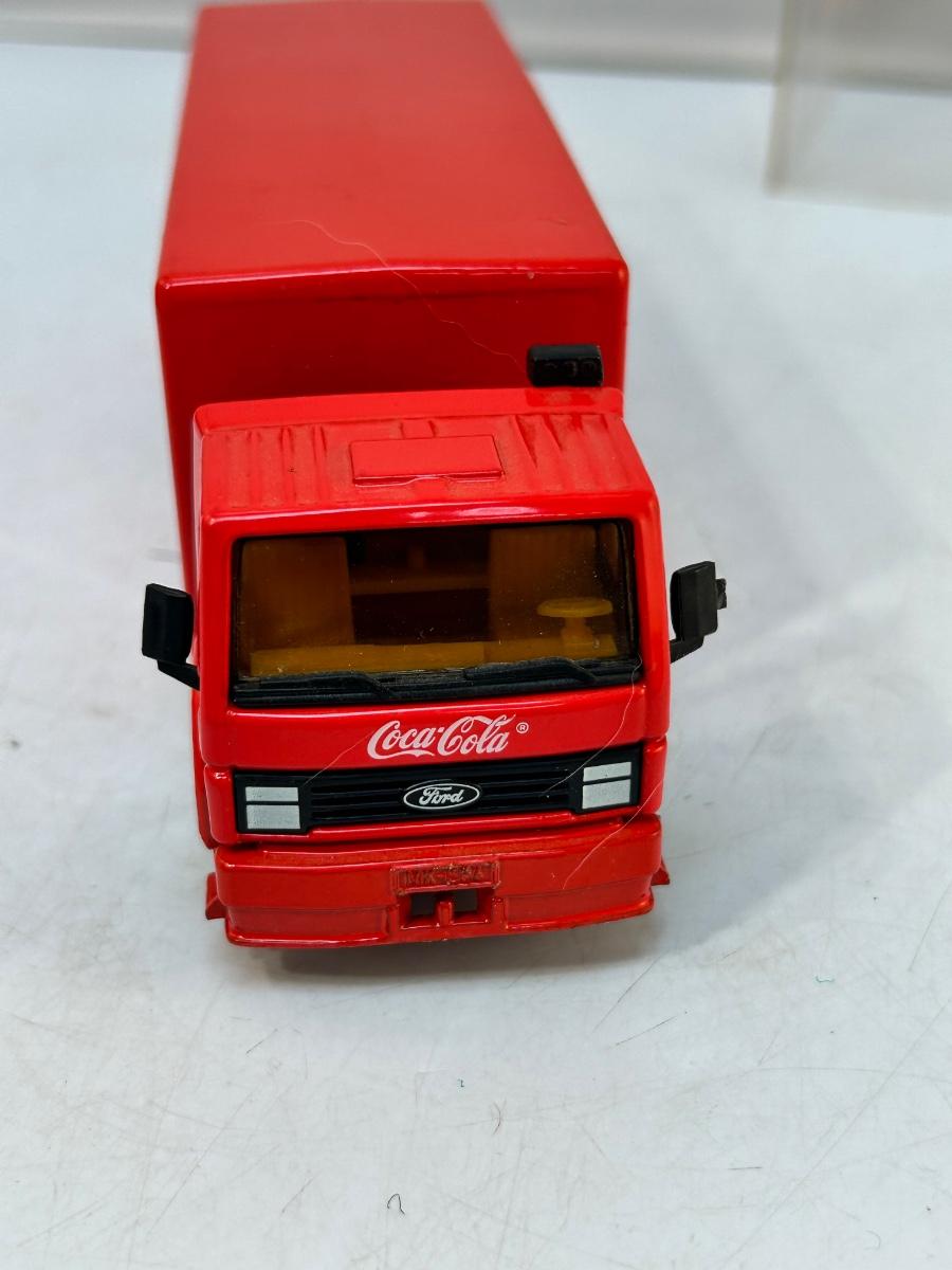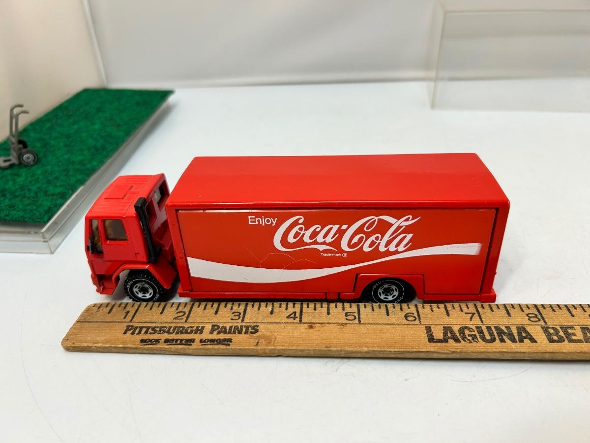 Die Cast Scale Model Coca Cola Delivery Truck with Opening Sides Bins & Hand Truck. In good condition. Comes with a plastic display case. About 8" size.