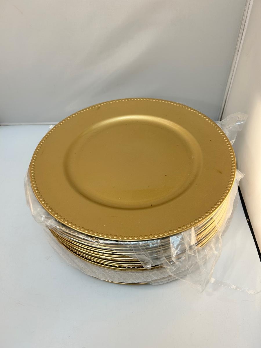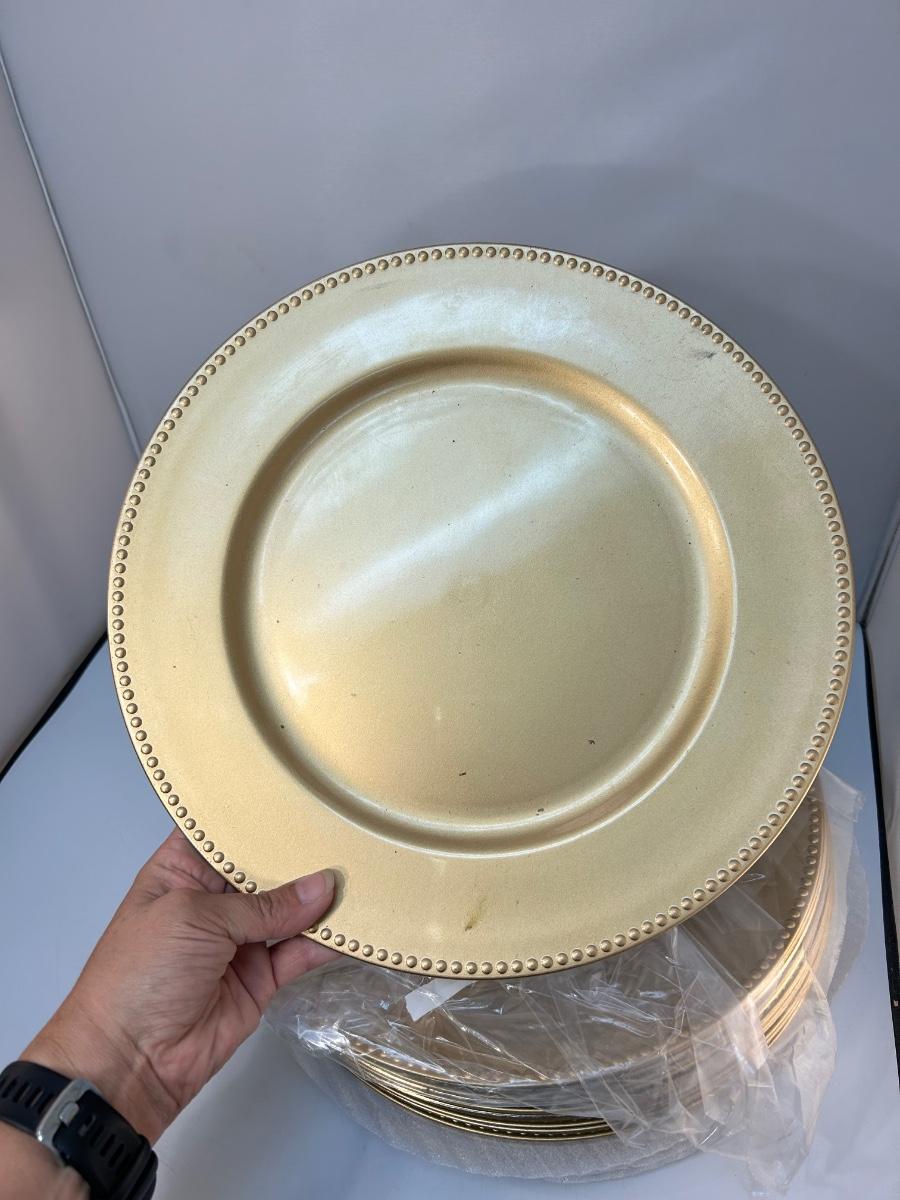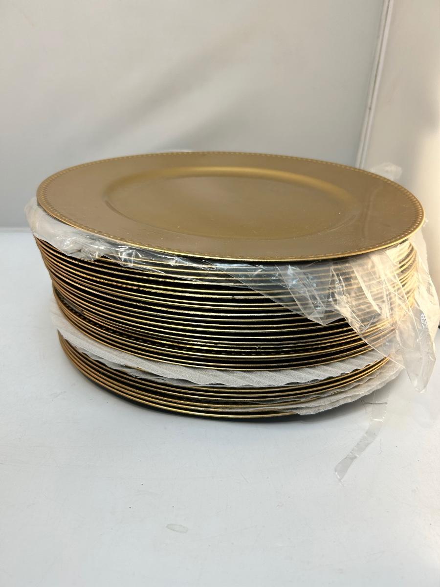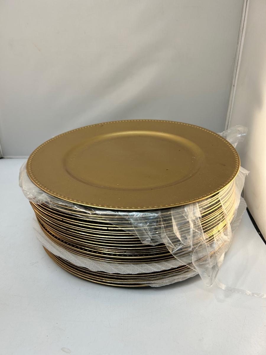 Large Lot of Gold Plastic Charger Plates Trays. Great for decor or adding a little extra to place settings at the table. May be previously used.