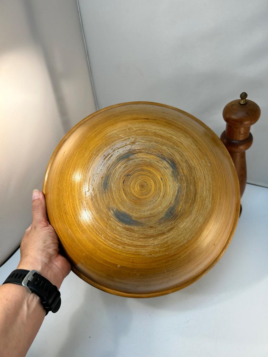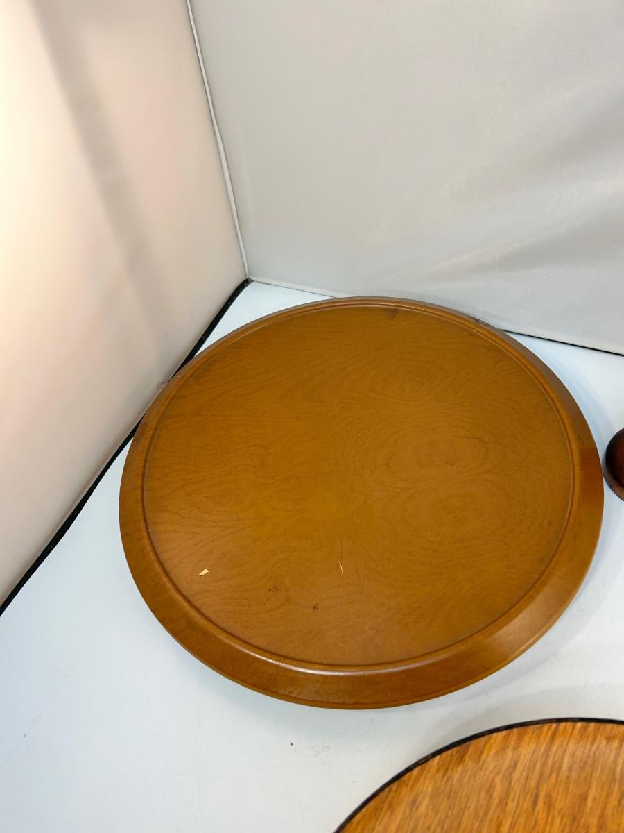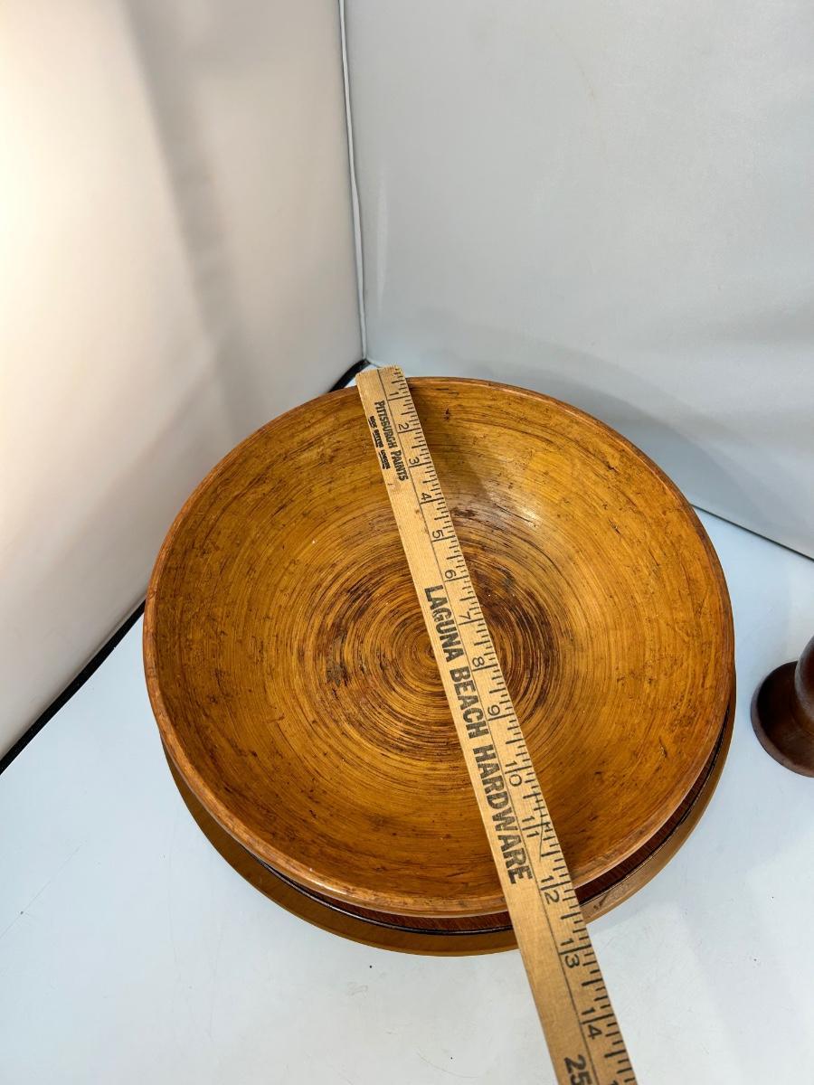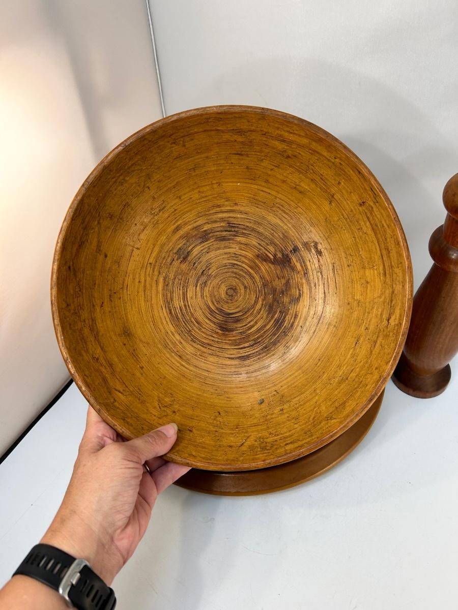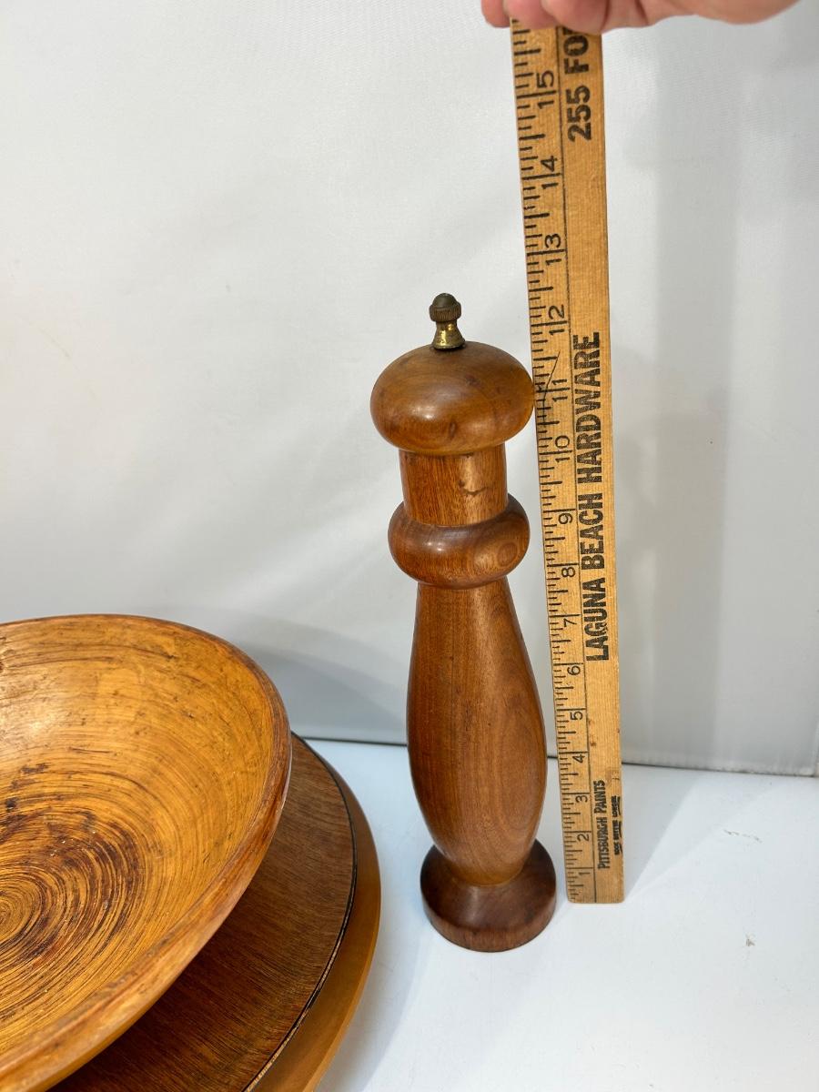 Vintage Wood Table Decor Bowl Lazy Susan Pepper Grinder. Four-piece lot includes a 12" pepper grinder, lazy susan, platter and fruit bowl. All pieces are in previously used condition.