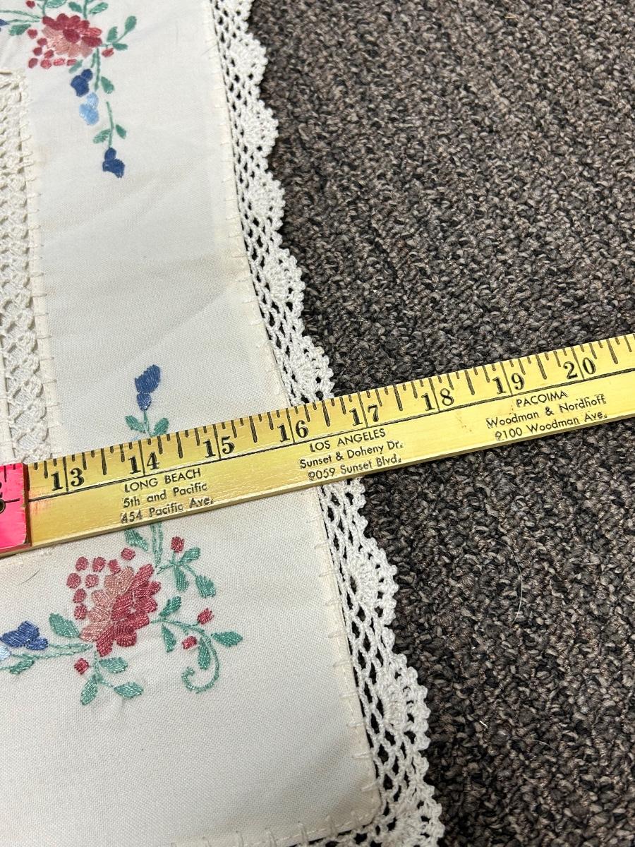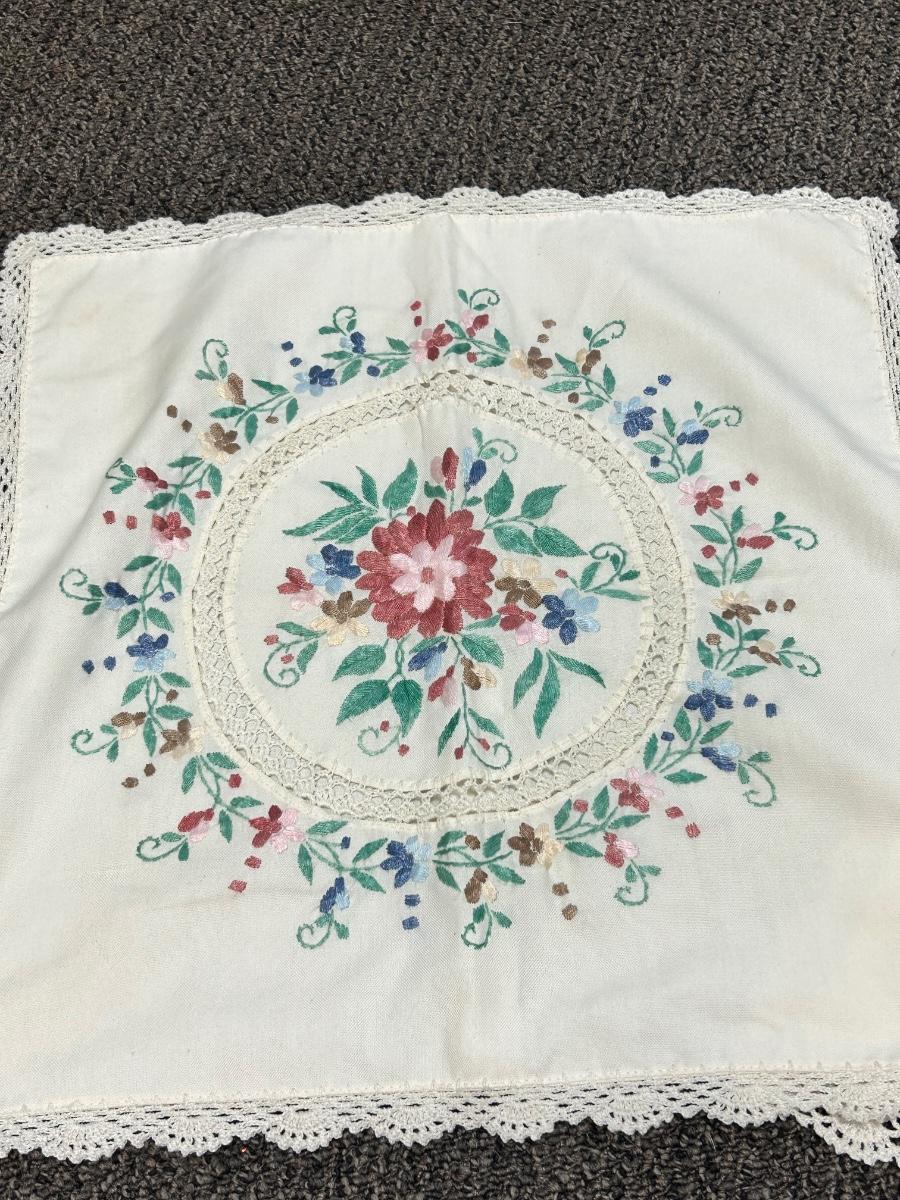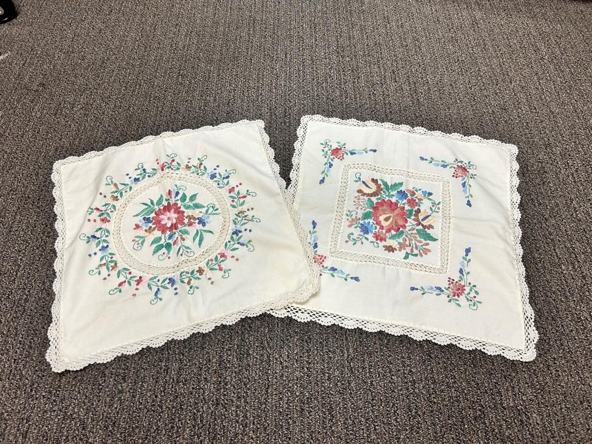 Vintage Pair of Square Shaped Lace Edge Floral Embroidered Pillowcases