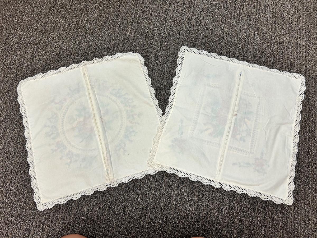 Vintage Pair of Square Shaped Lace Edge Floral Embroidered Pillowcases. In good vintage condition. May have light discoloration but no major spots or stains. Zipper closure on the back. About 16" size.
