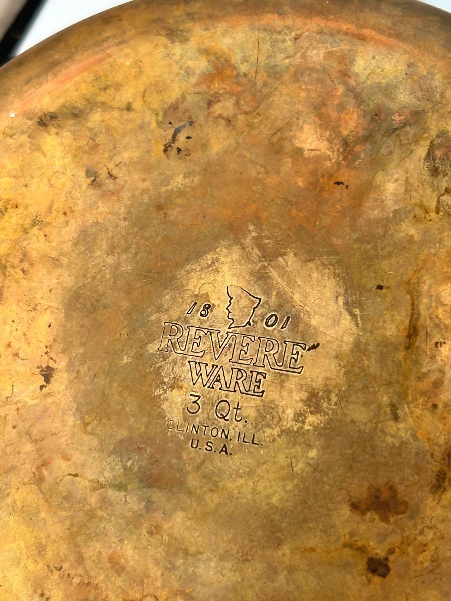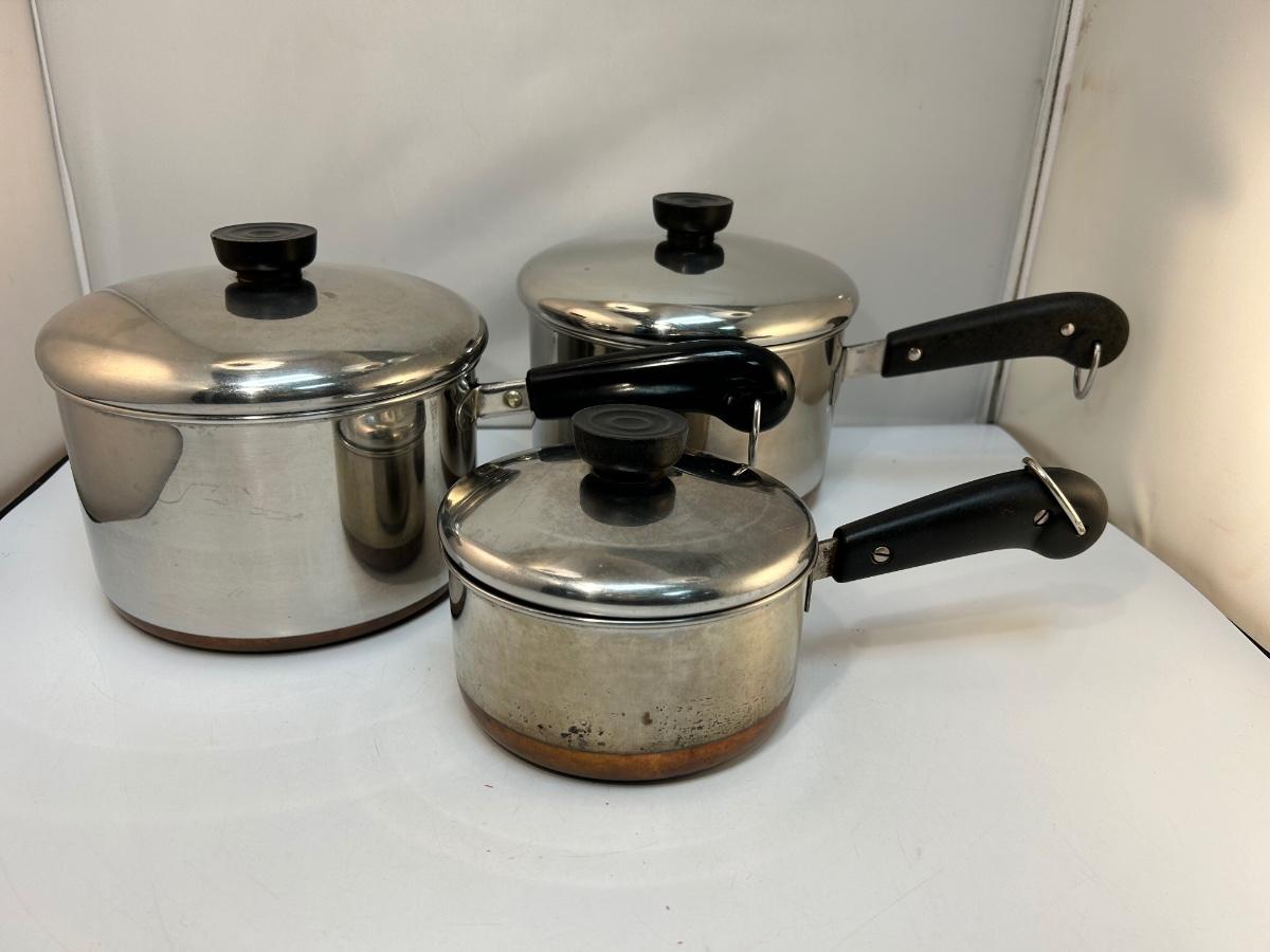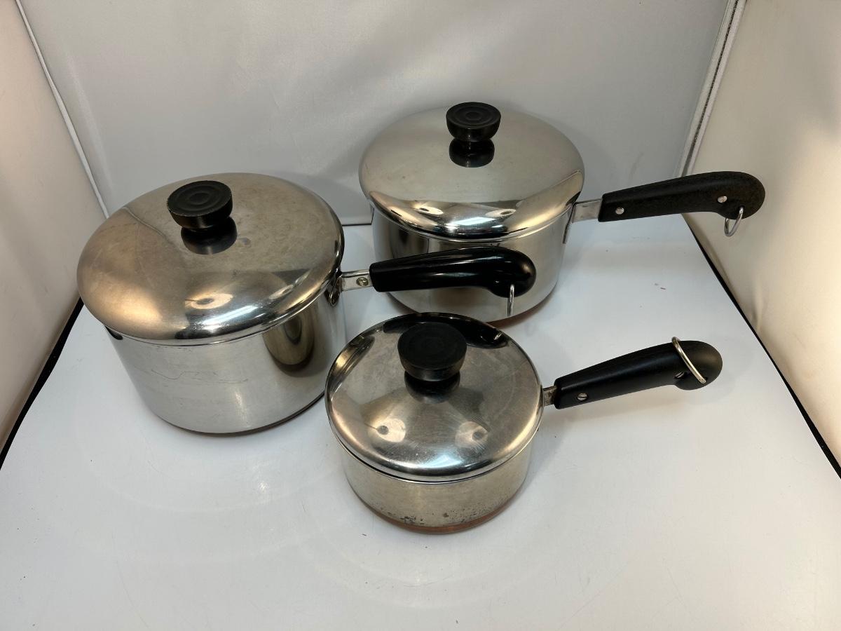 Set of Three Revere Ware Stainless Steel Saucepans Pots with Lids. In good used condition. Two are the same size.