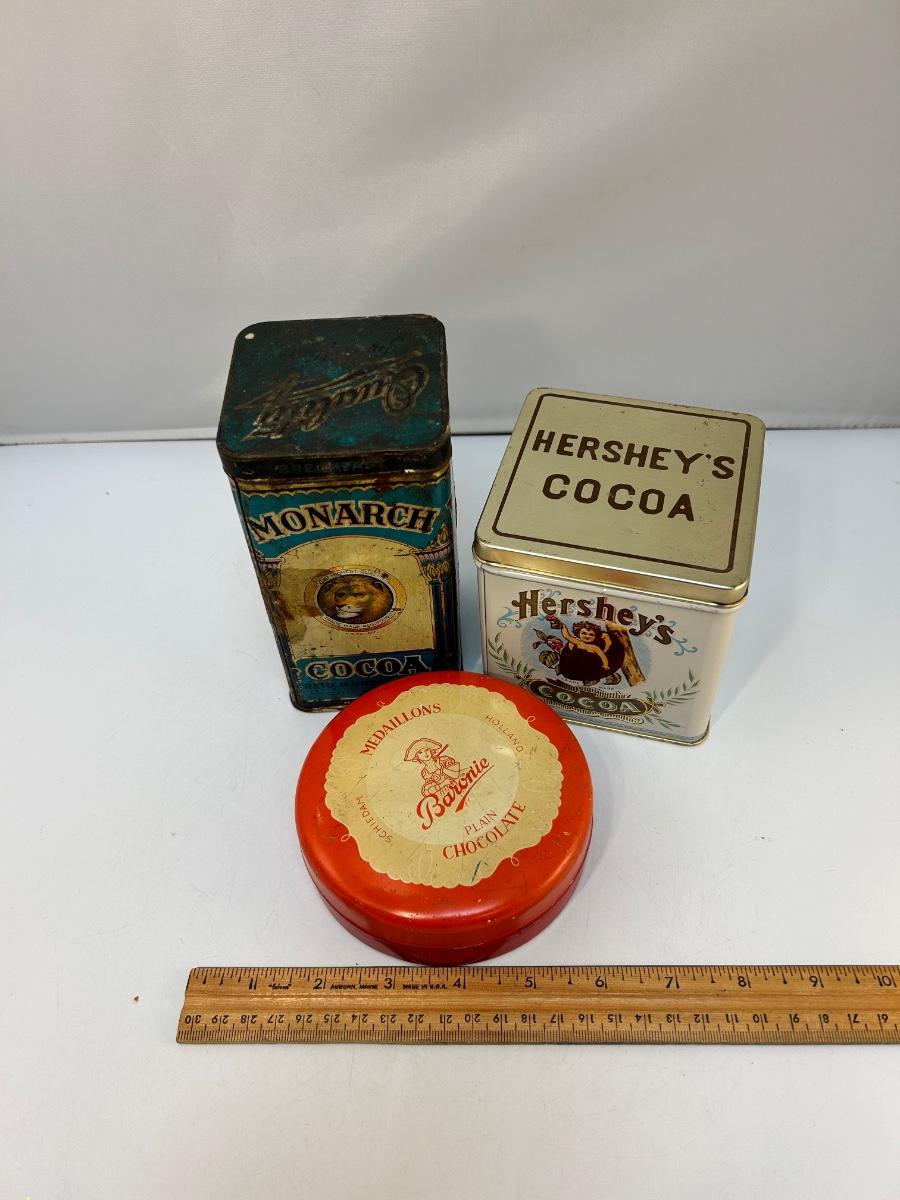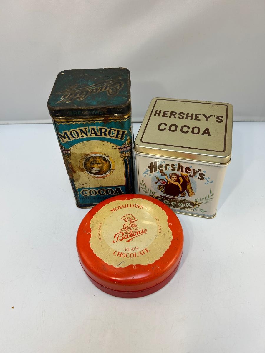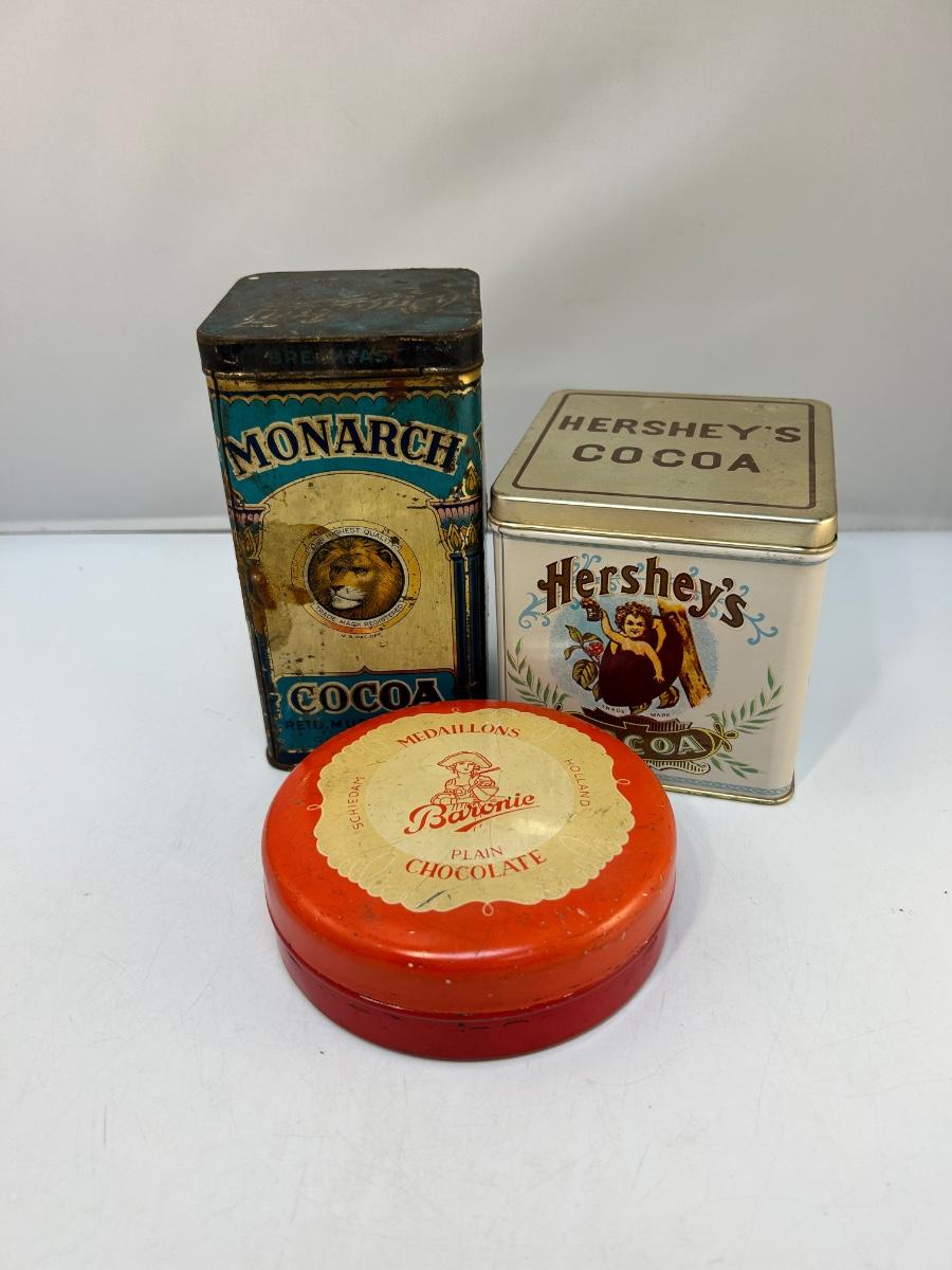 Lot of Three Vintage Chocolate Cocoa Metal Tin Box Canisters. In various states of condition, display nice.