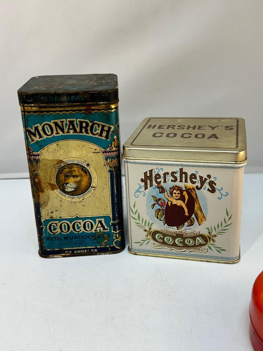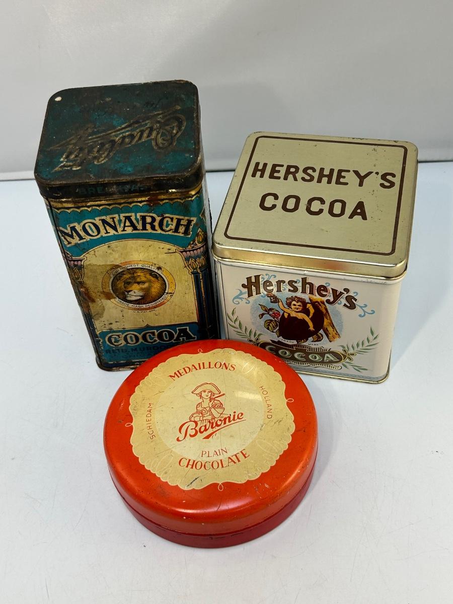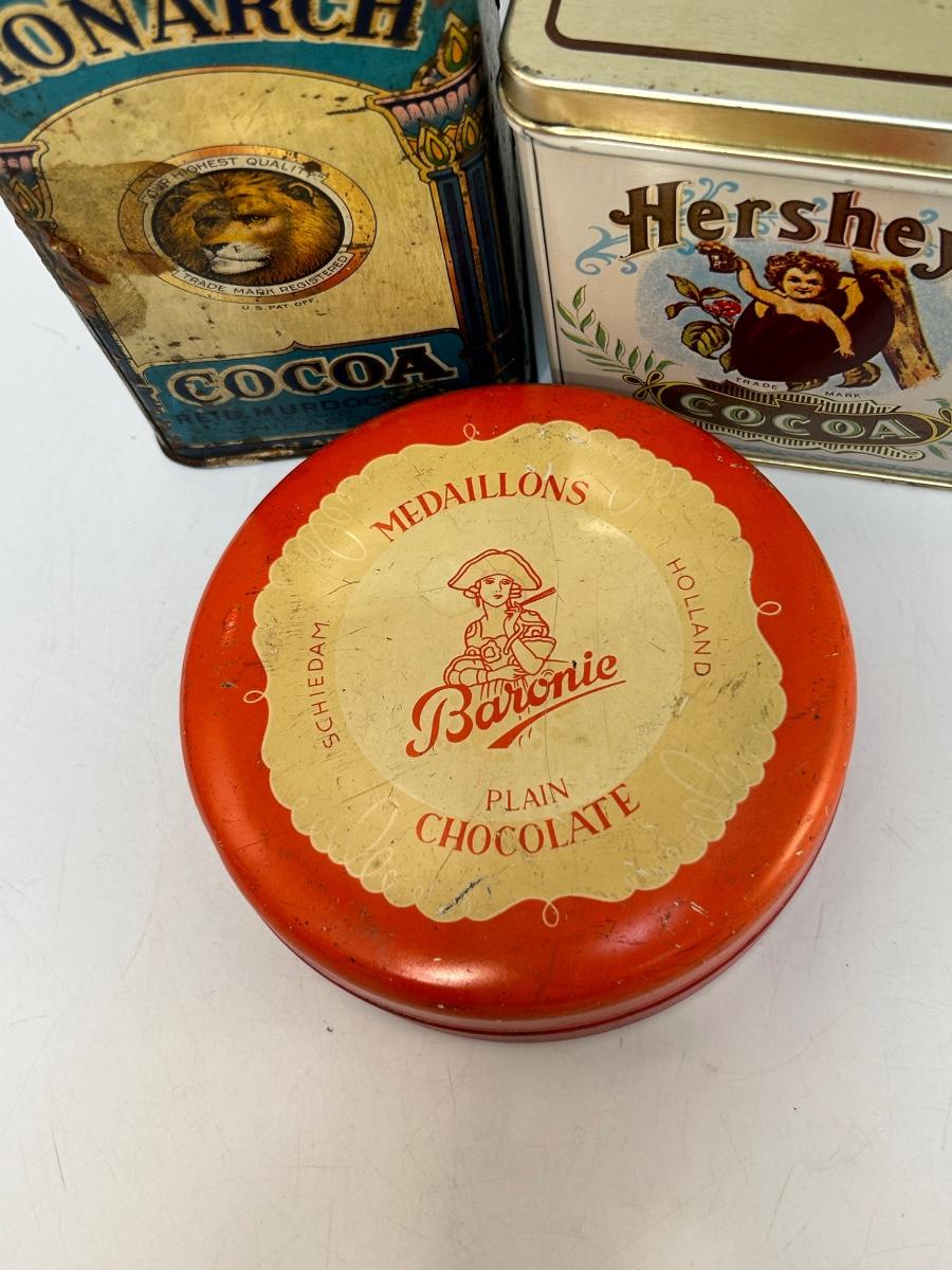 Lot of Three Vintage Chocolate Cocoa Metal Tin Box Canisters. In various states of condition, display nice.