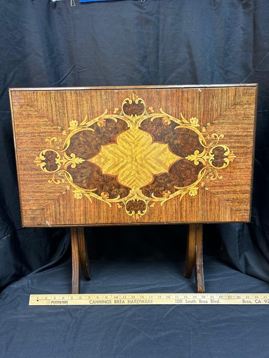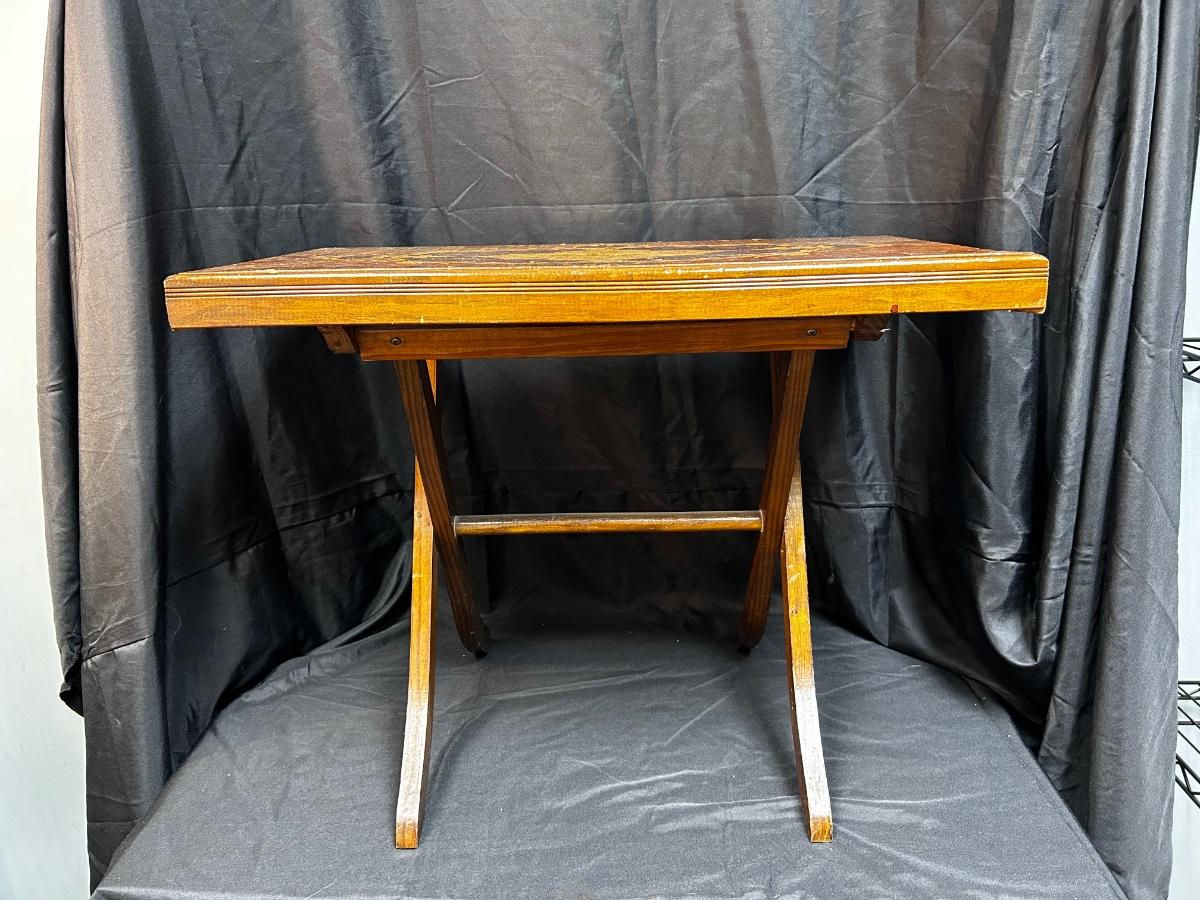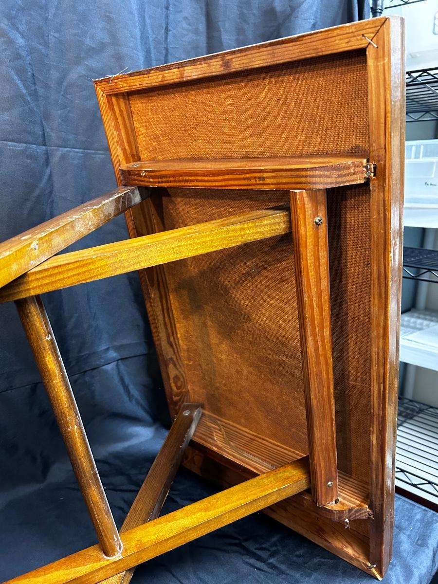 Vintage Retro Veneered Wood TV Tray Folding Table. In previously used condition. The veneer was peeling so previous owner added some tack nails to keep in place, see photos.