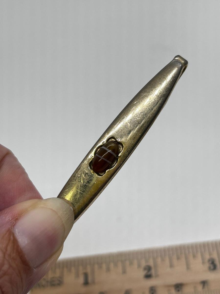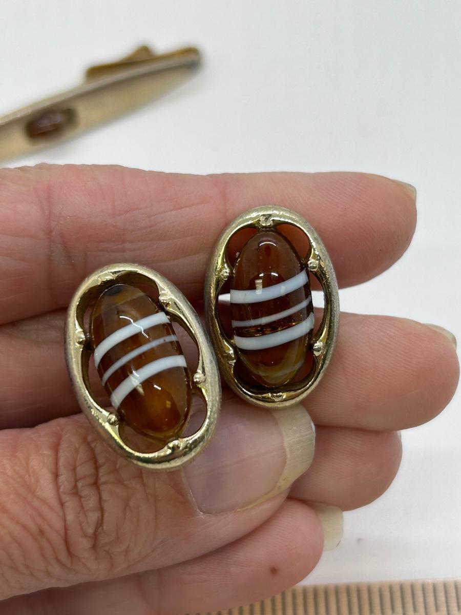 Vintage Men's Jewelry Set Cufflinks Tie Clip White Striped Glass. Gold tone setting. In vintage condition.