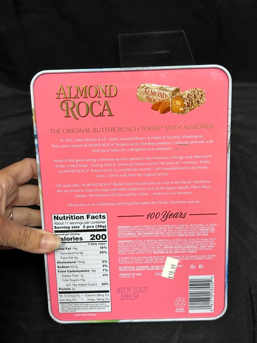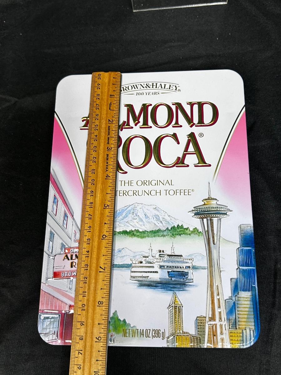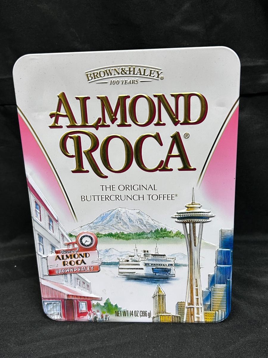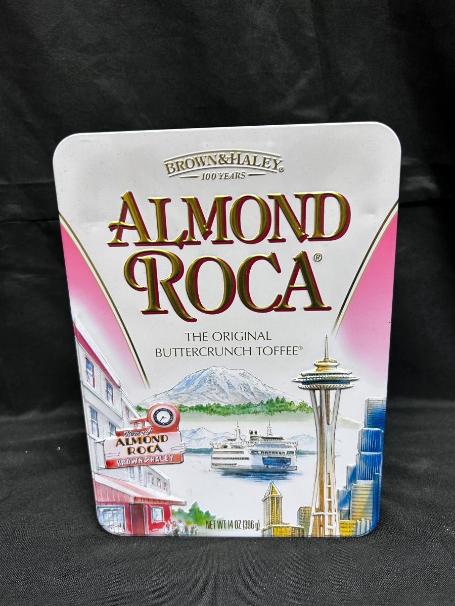 100th Anniversary Brown and Haley Seattle Washington Almond Roca Collector Tin. In good condition, displays well.