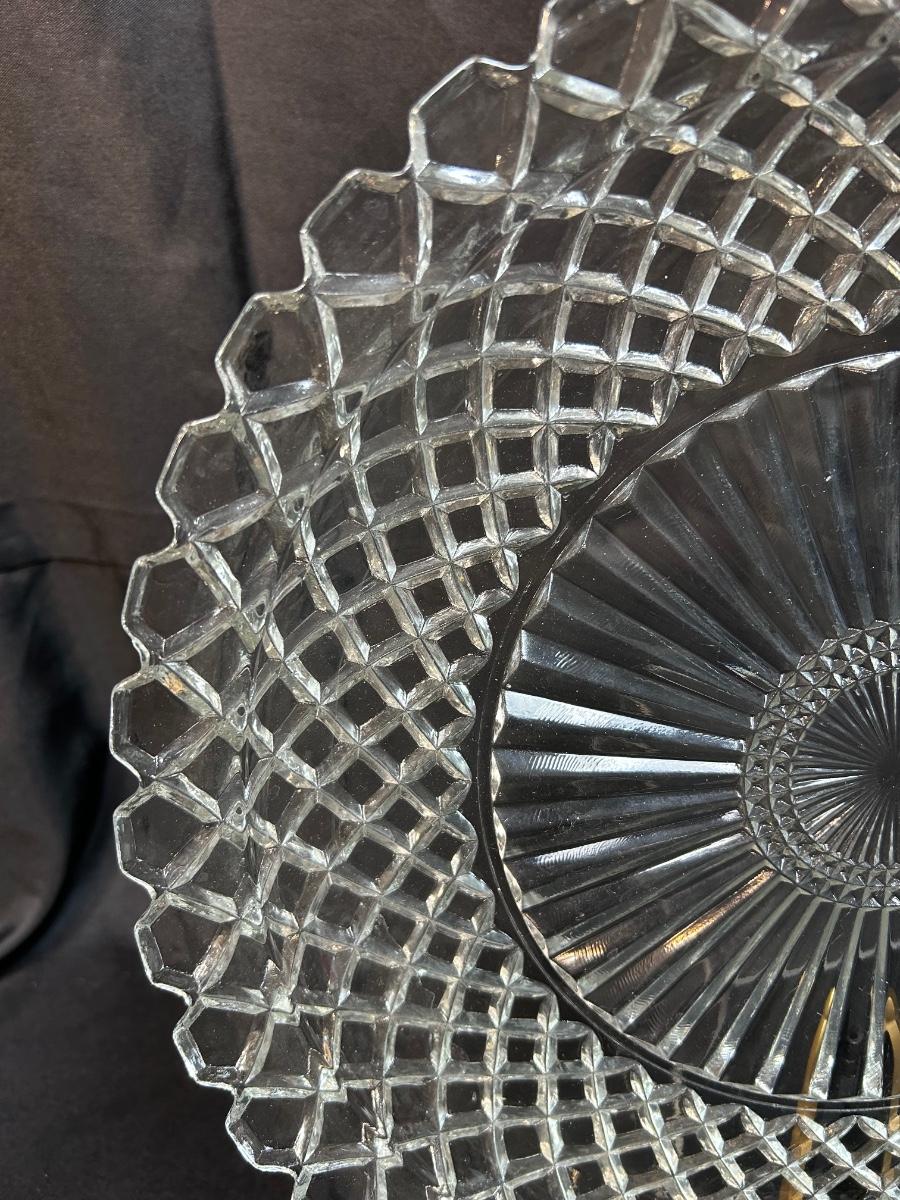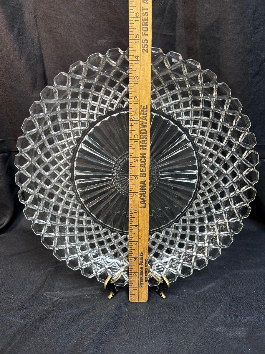 Large Diamond Lattice Cut Glass Platter Serving Plate. In good condition, about 14" diameter.