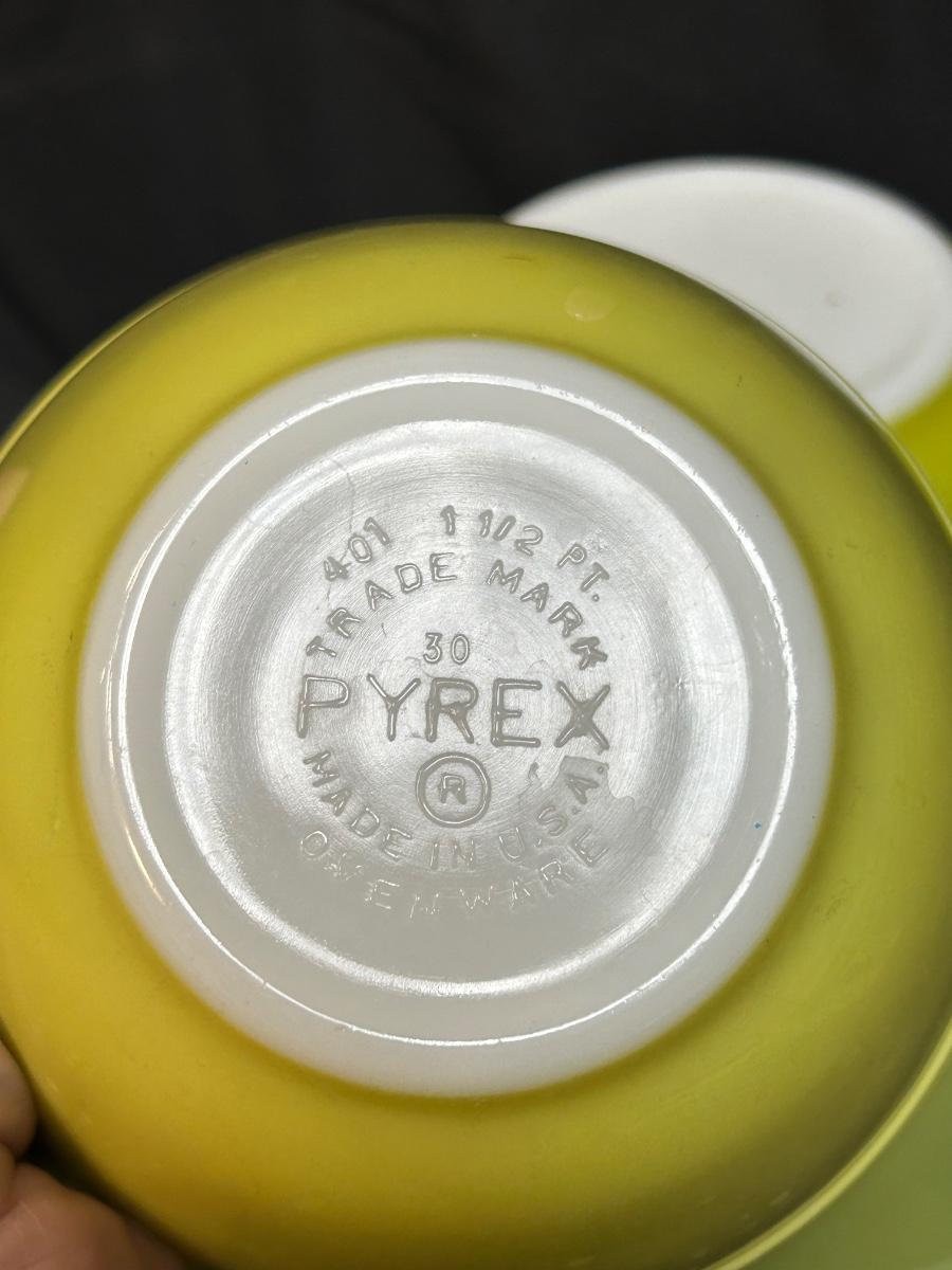 Vintage Pyrex Avocado Green Three Nesting Mixing Bowls #401 #402 #403. Gradual change in color between the three. In good vintage condition.