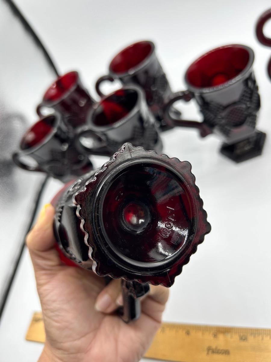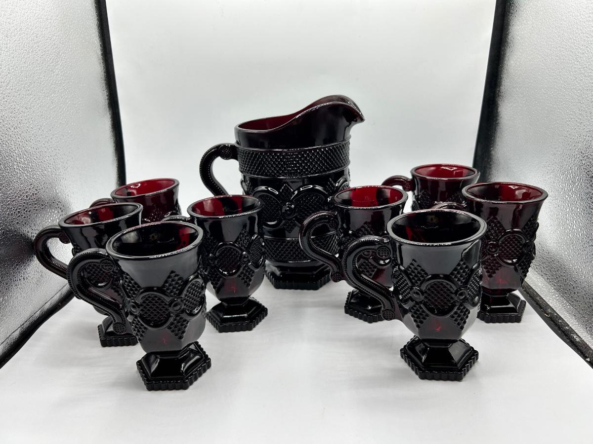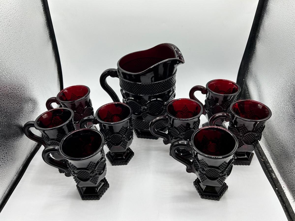 Vintage Avon 1876 Cape Cod Collection Ruby Red Glass Pitcher and 8 Handled Footed Mugs Cups