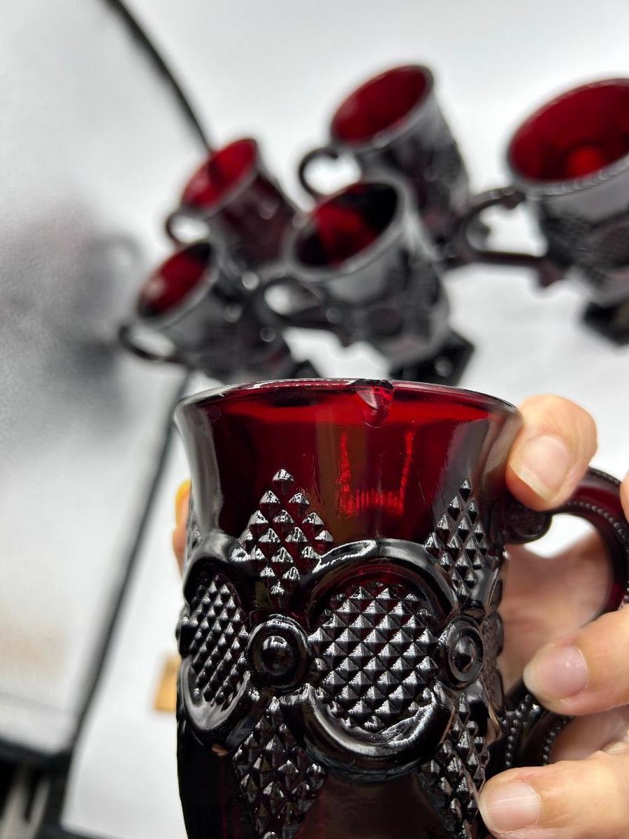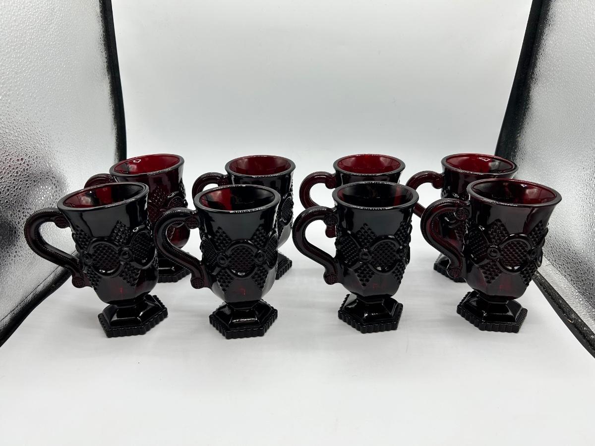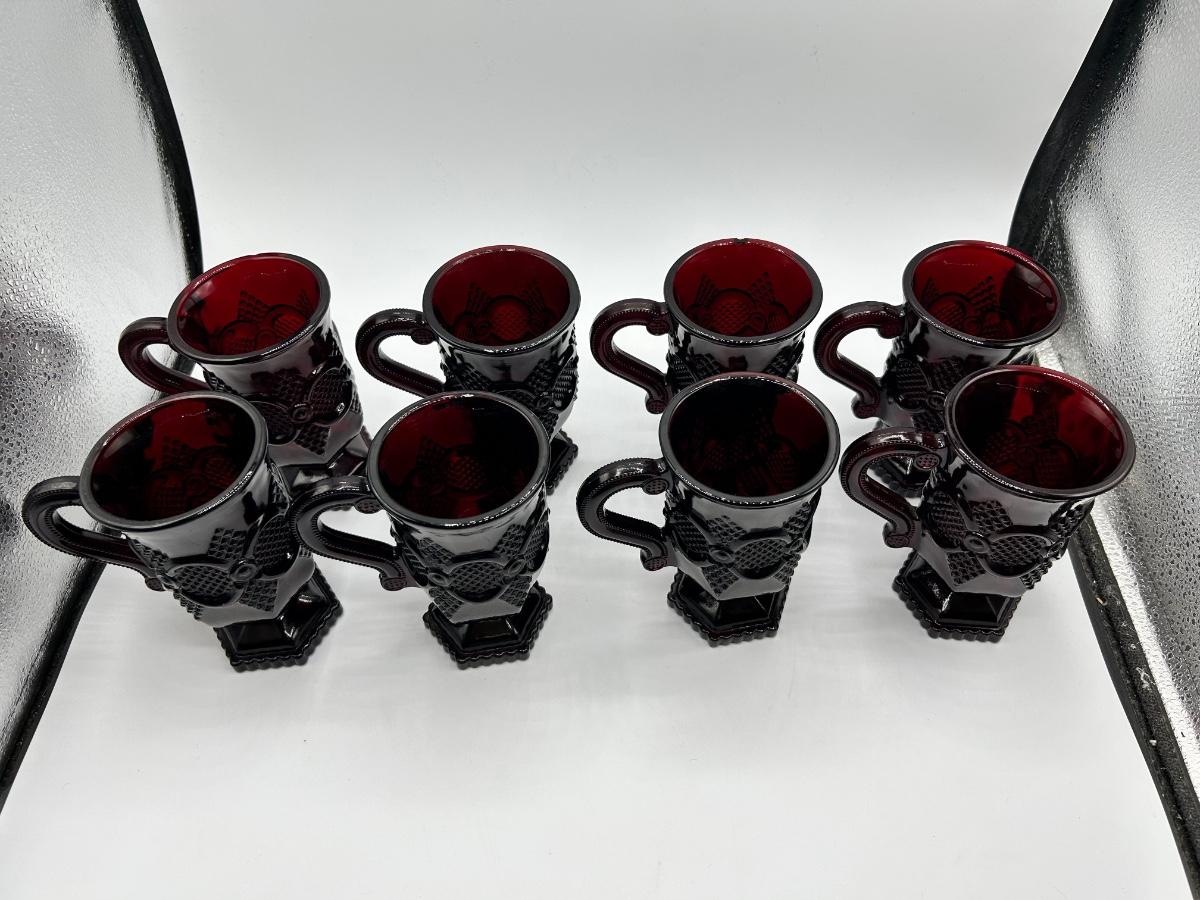 Vintage Avon 1876 Cape Cod Collection Ruby Red Glass Pitcher and 8 Handled Footed Mugs Cups
