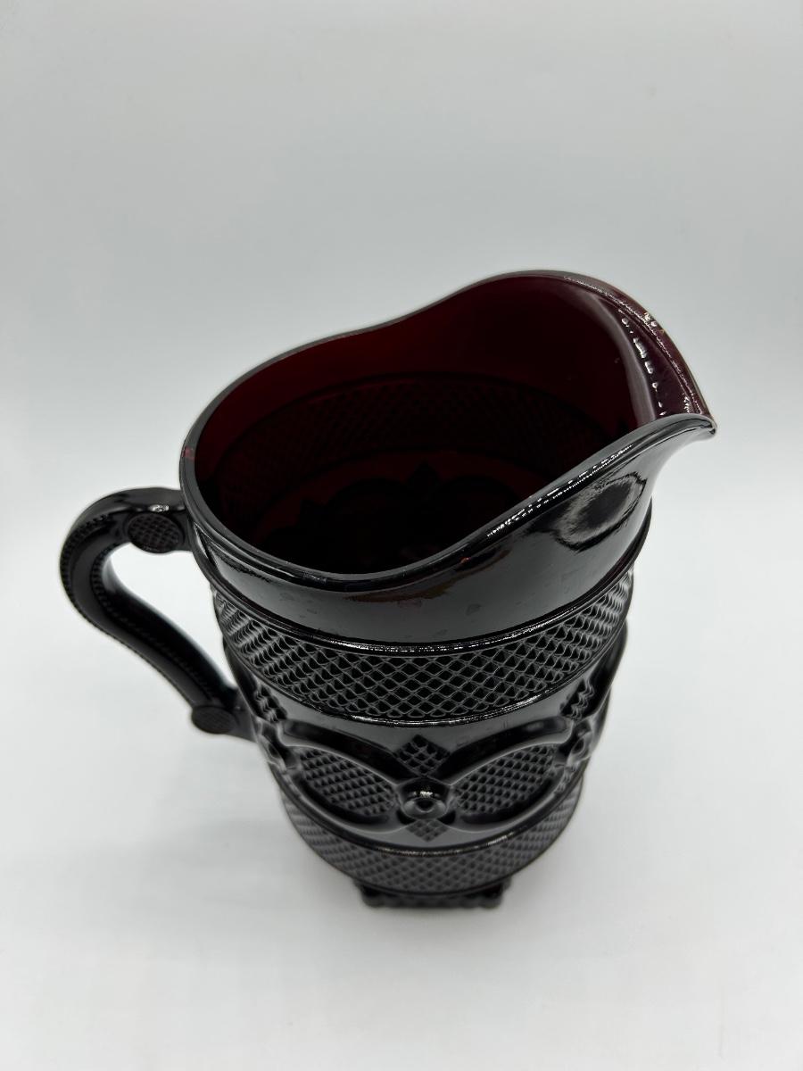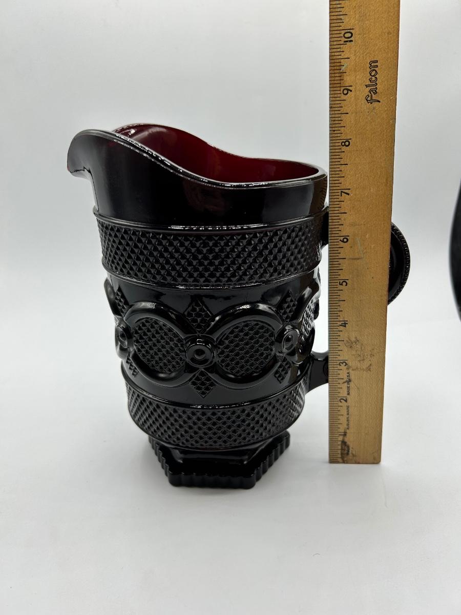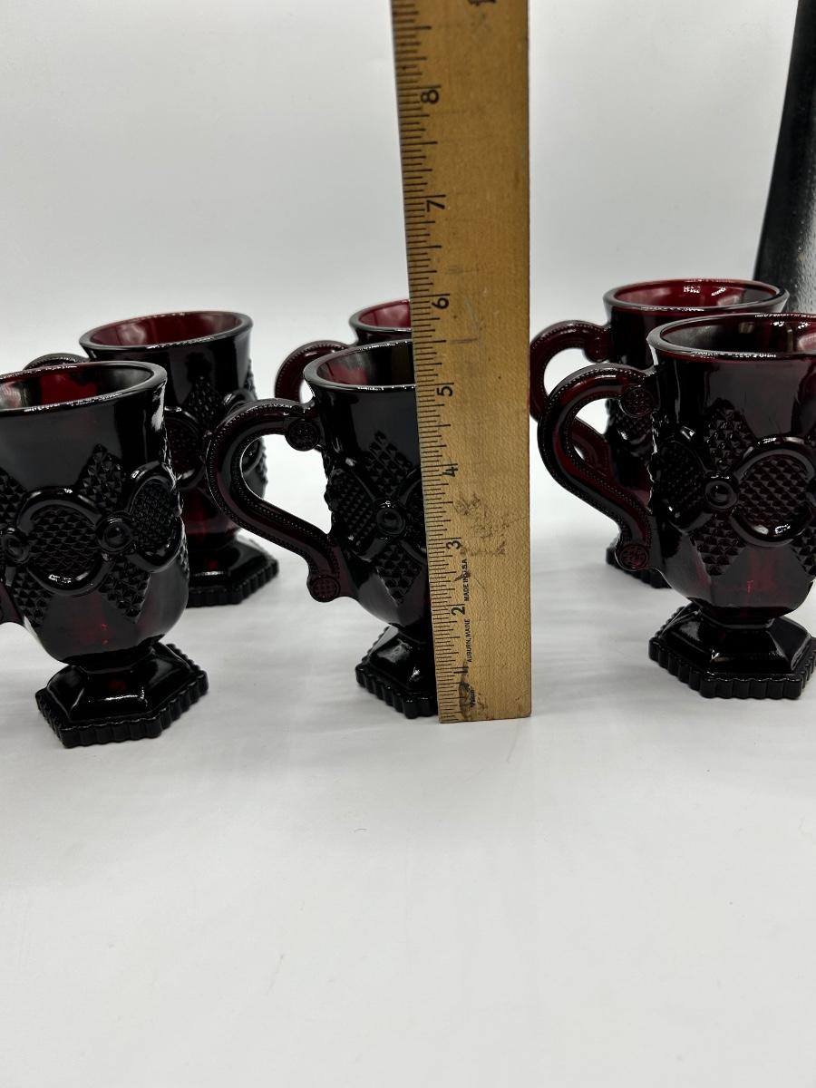 Vintage Avon 1876 Cape Cod Collection Ruby Red Glass Pitcher and Handled Footed Mugs Cups. In overall good used condition. Did find a chip in one glass, may have a couple flea bite chips. 48 oz 7.5" tall pitcher in good used condition.