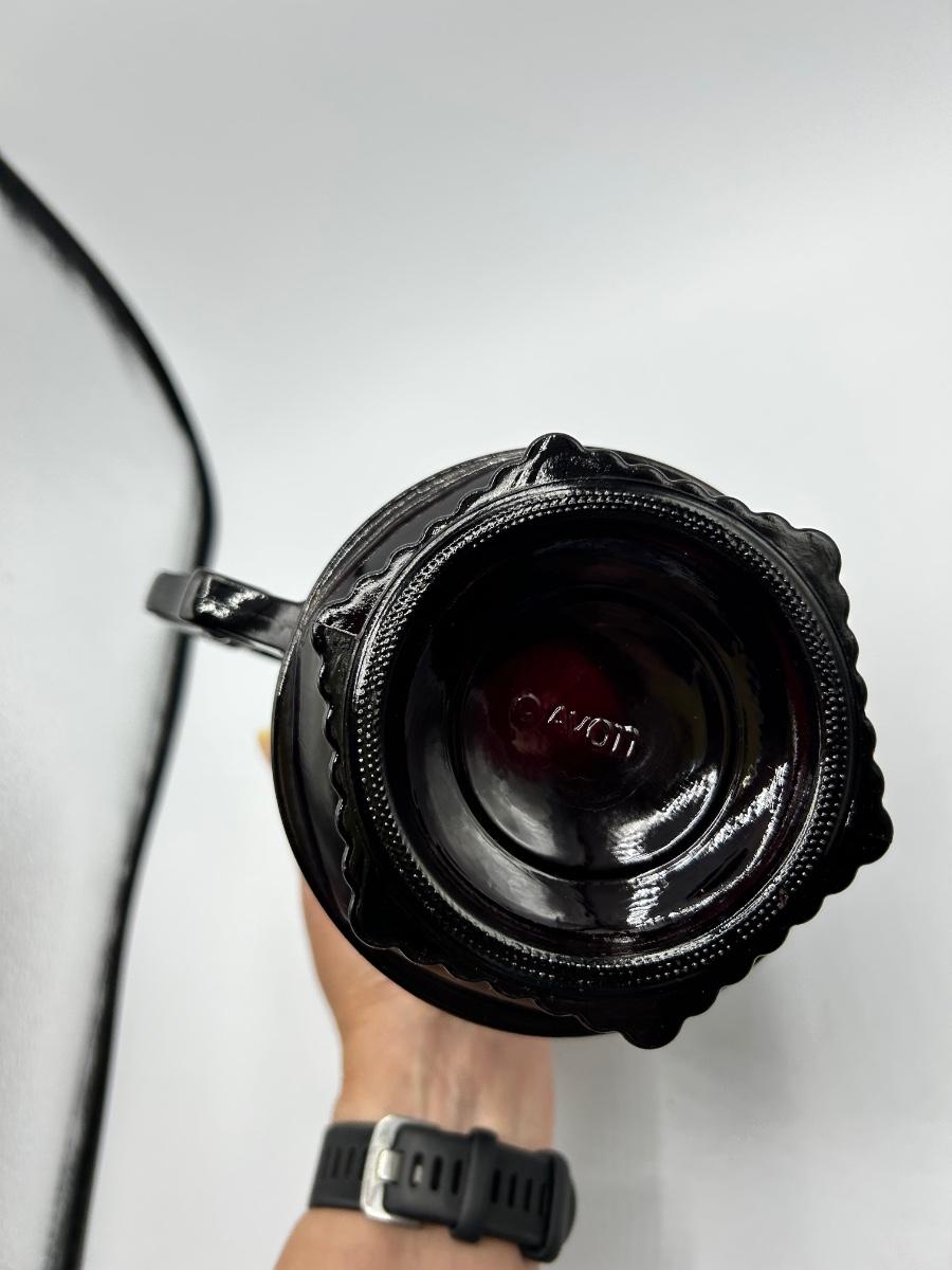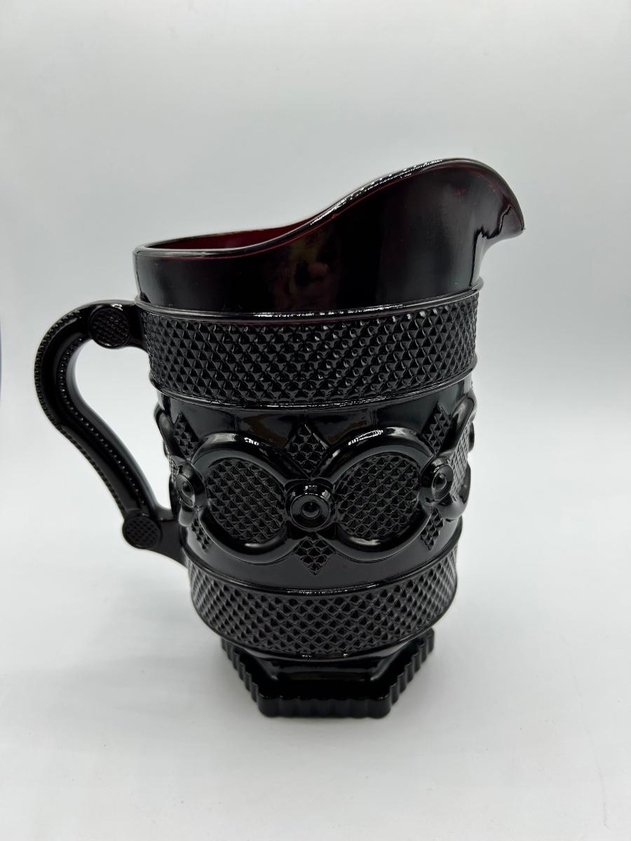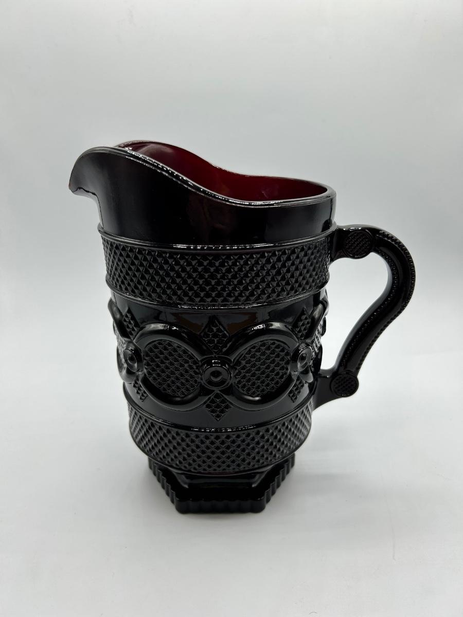 Vintage Avon 1876 Cape Cod Collection Ruby Red Glass Pitcher and Handled Footed Mugs Cups. In overall good used condition. Did find a chip in one glass, may have a couple flea bite chips. 48 oz 7.5" tall pitcher in good used condition.