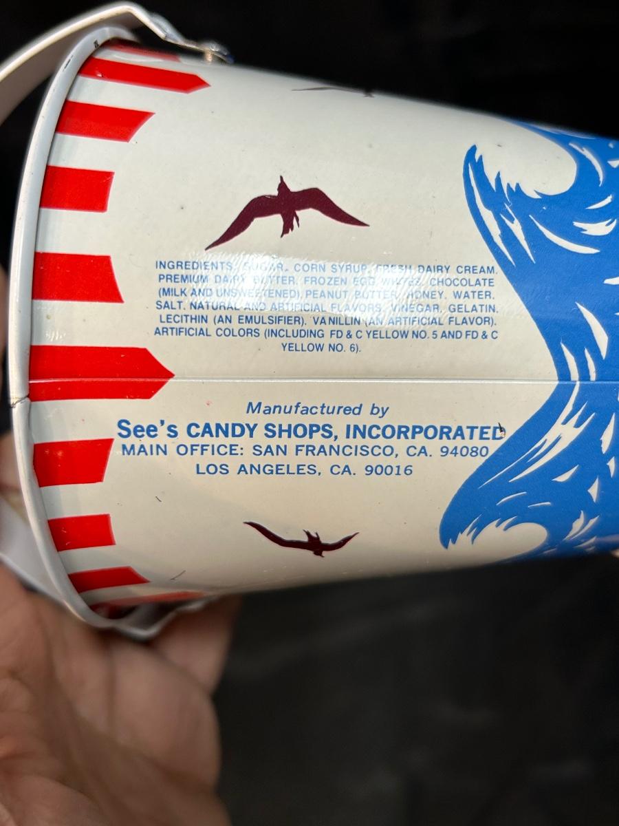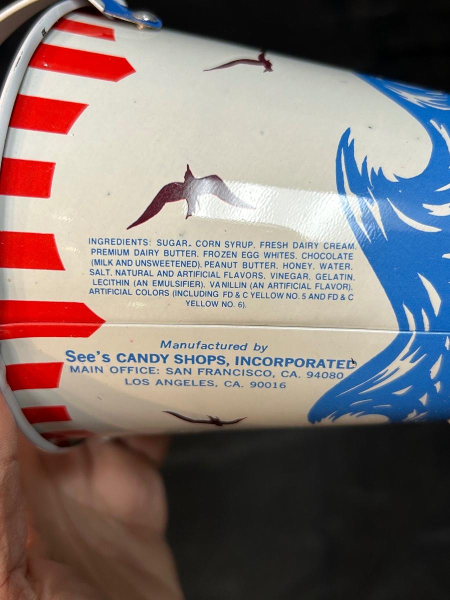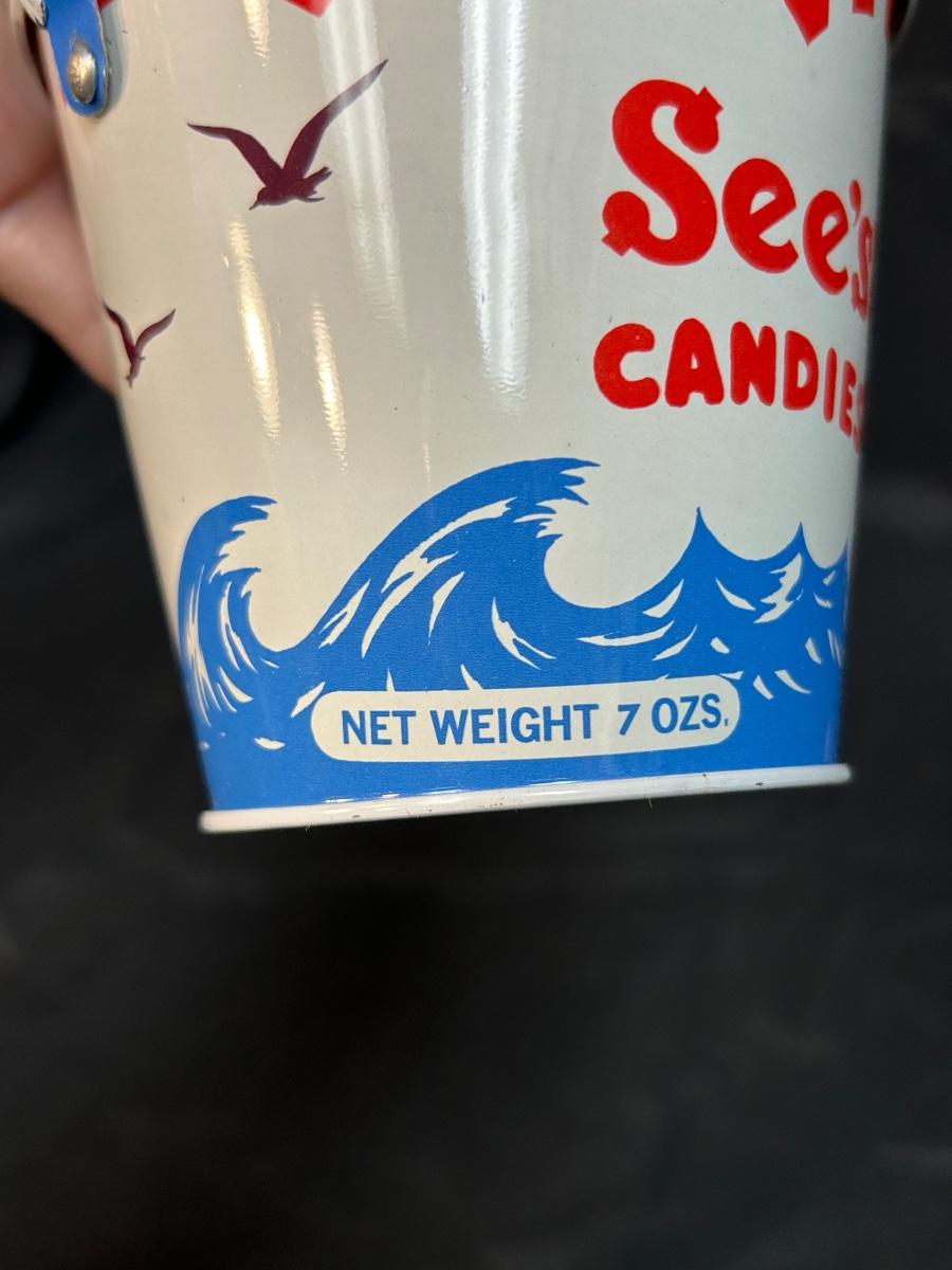 Retro Vintage See's Candies Metal Bucket Pail Red White Blue Ocean Waves & Birds