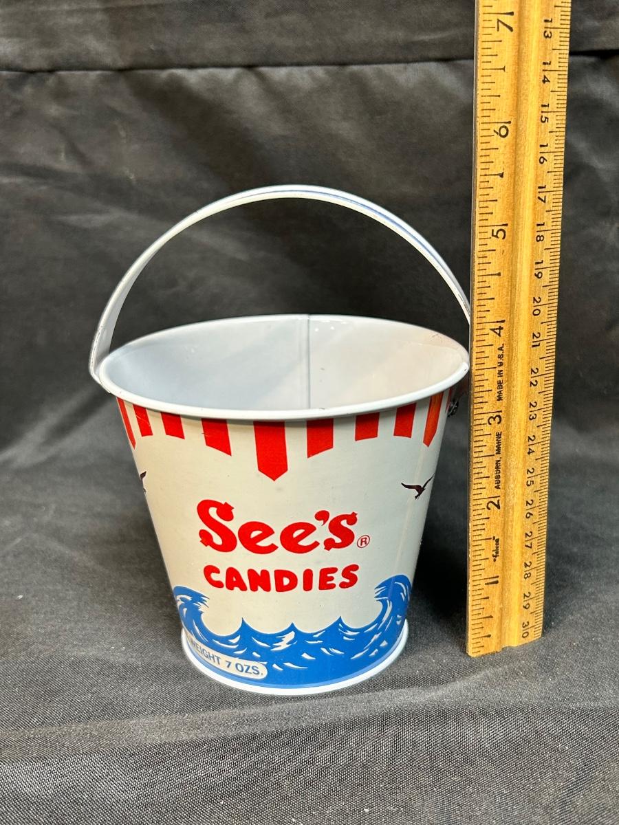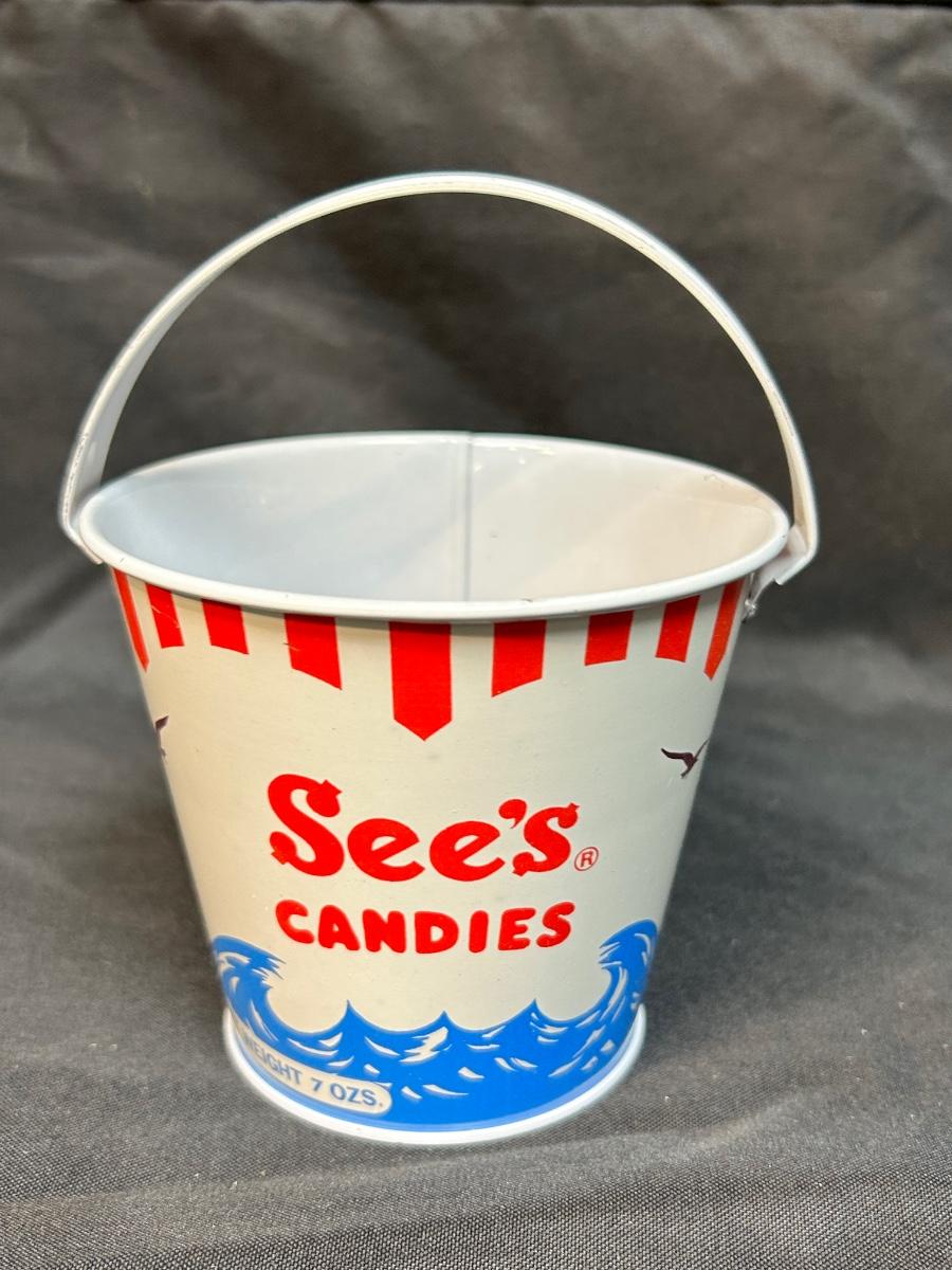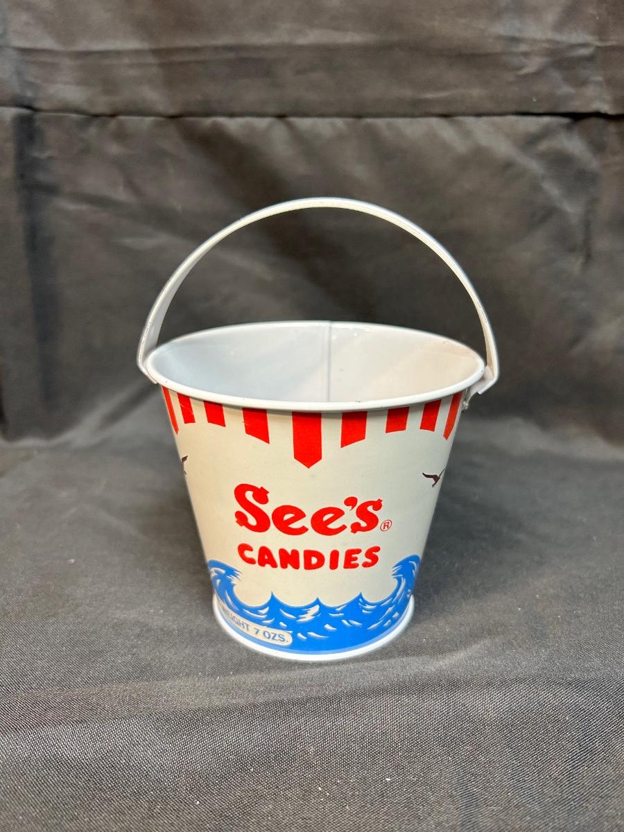 Retro Vintage See's Candies Metal Bucket Pail Red White Blue Ocean Waves & Birds. In good vintage condition. Under 6" size with handle up.