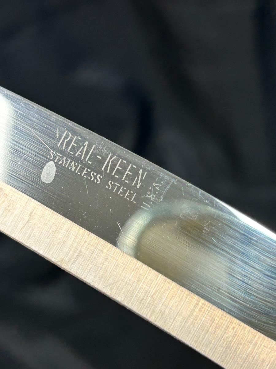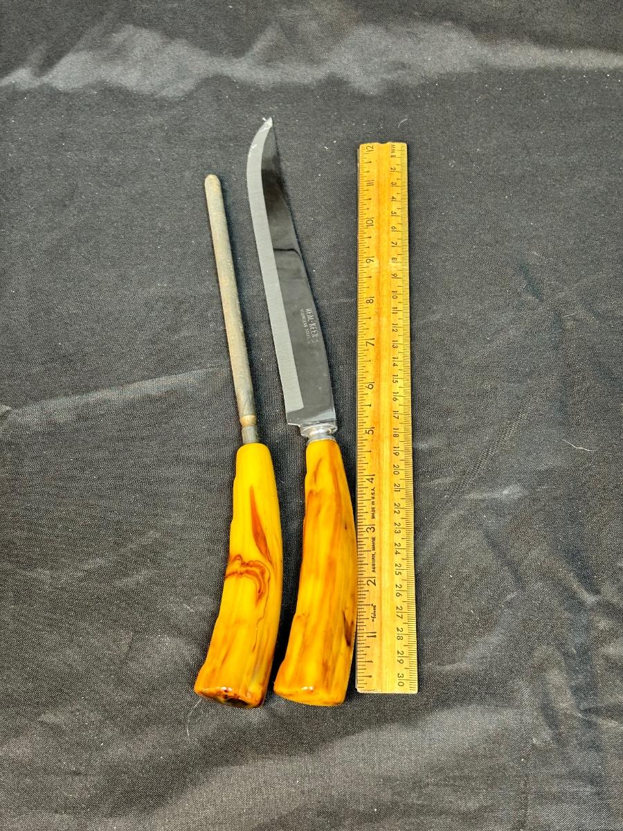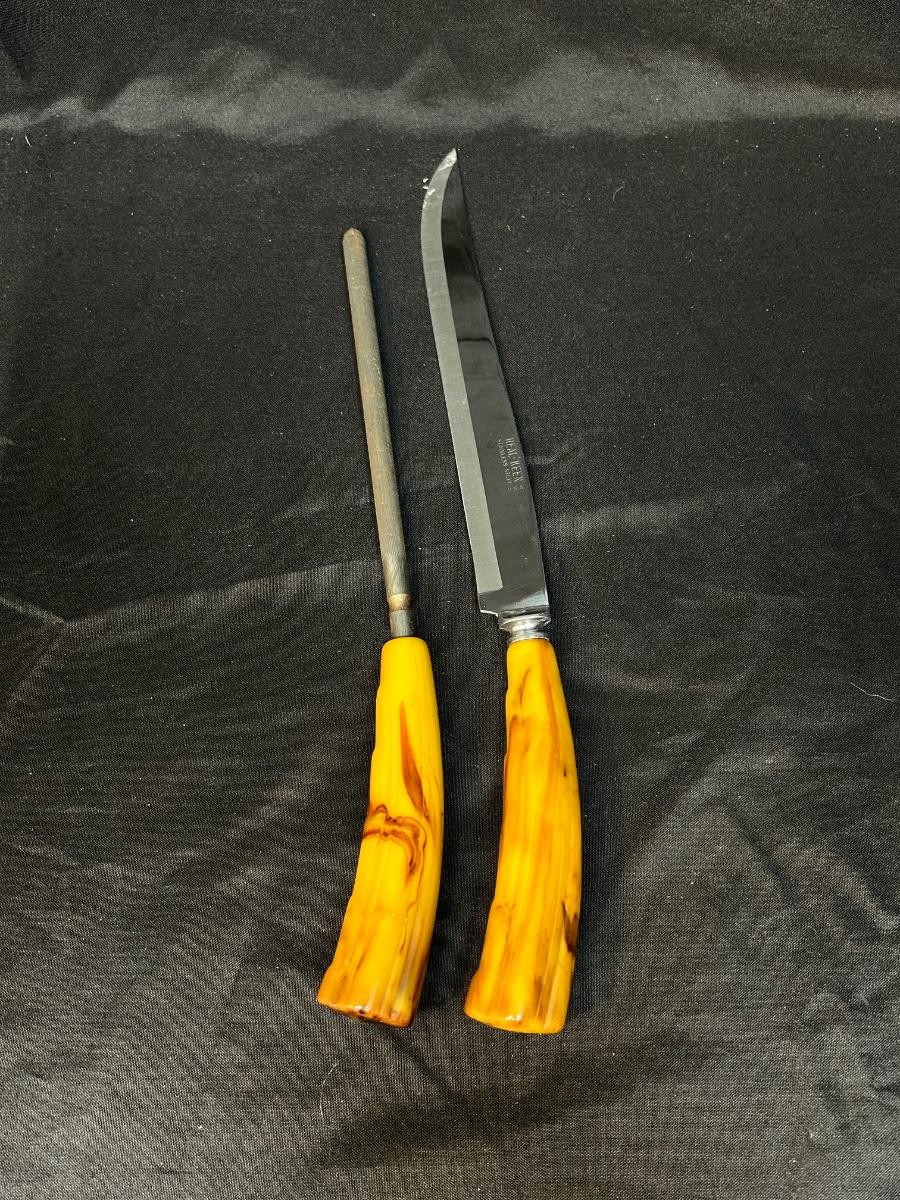 Vintage Yellow Swirl Bakelite Plastic Handled Carving Knife with Sharpener Set. In good vintage condition. Blade marked Real-Keen Stainless Steel USA.