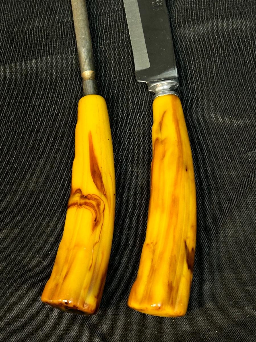 Vintage Yellow Swirl Bakelite Plastic Handled Carving Knife with Sharpener Set