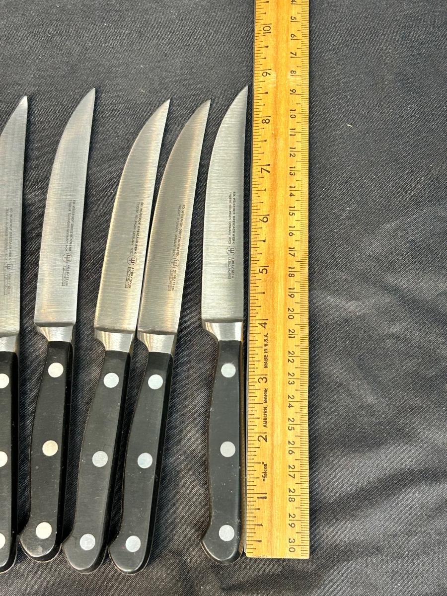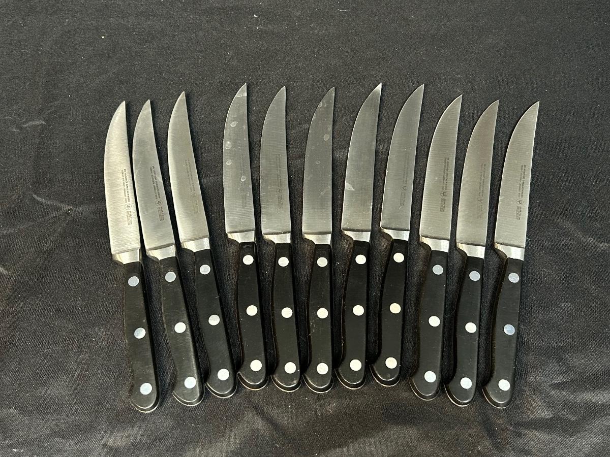 Trident Solingen Germany Steak Dinner Knives Cutlery Set of 11. In good previously used condition, except for one with a bent tip.