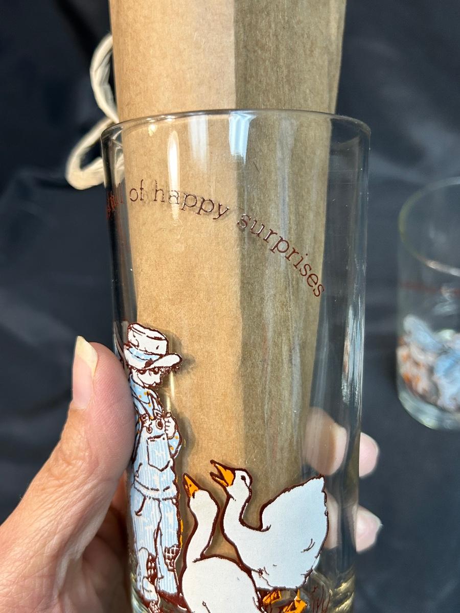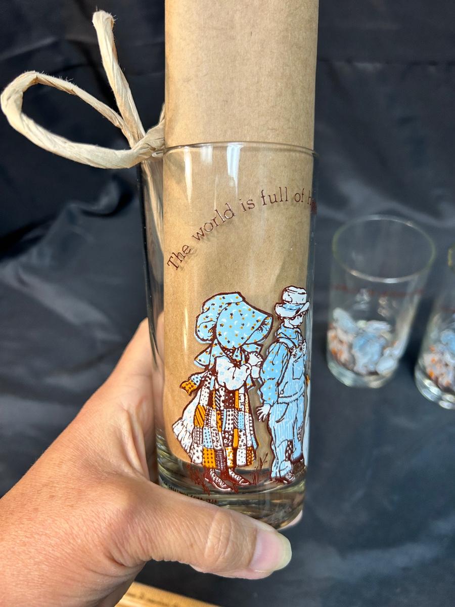 Set of Three Vintage Holly Hobbie American Greetings 1978 The World is Full of Happy Surprises Drink Glasses. In good vintage condition, little wear to glass images and no chips. About 5.5" size.